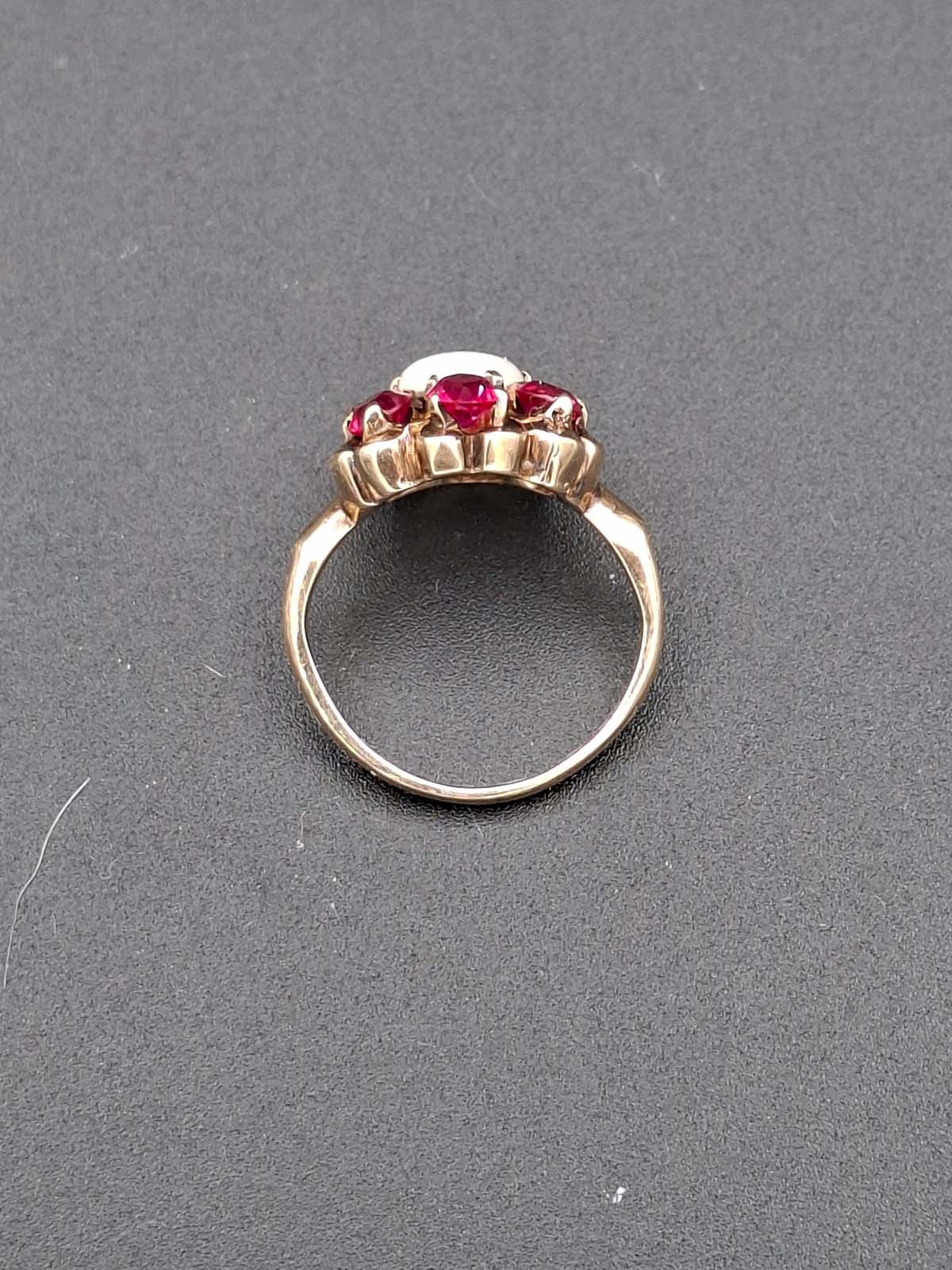 A stunning Opal & synthetic ruby cluster ring set in 10ct gold. 1 Natural opal approximately 6.22-6.32×2.10mm round cabochon, calculated approximately 1.20ct, translucent estimated N8, subdued, direct