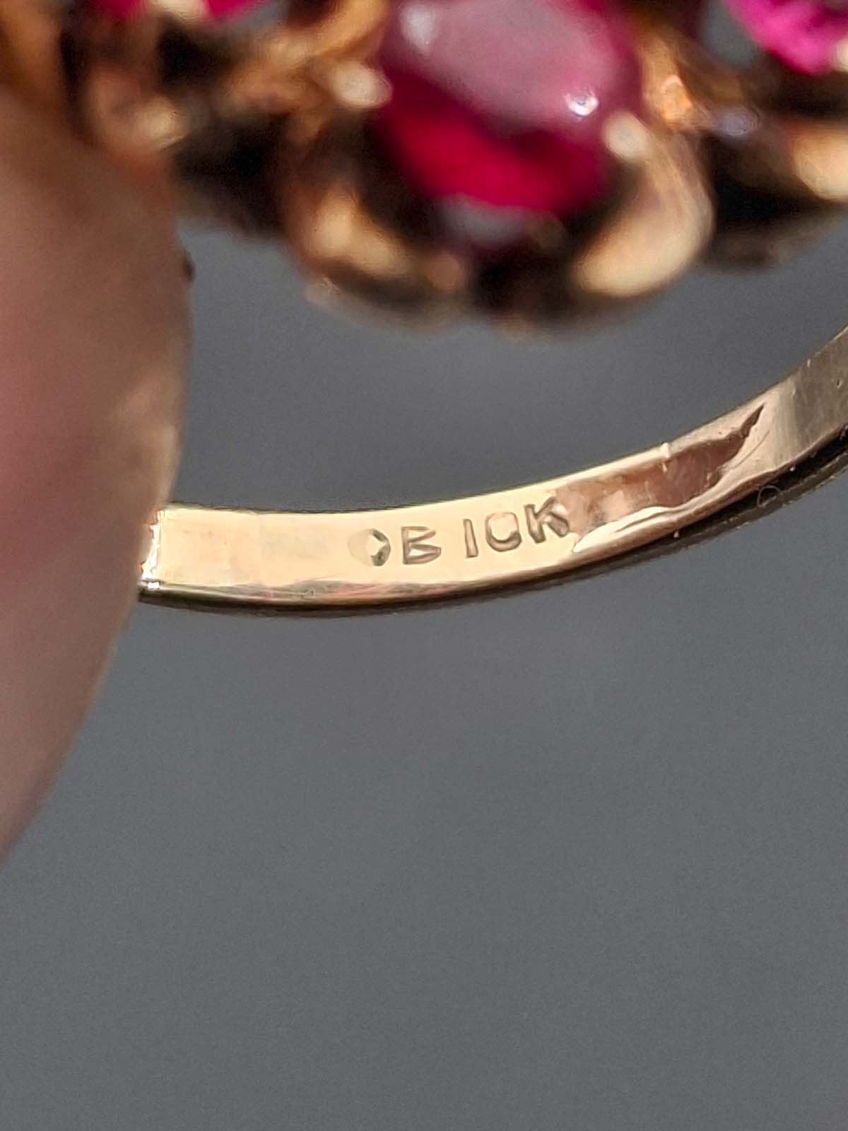 A stunning Opal & synthetic ruby cluster ring set in 10ct gold. 1 Natural opal approximately 6.22-6.32×2.10mm round cabochon, calculated approximately 1.20ct, translucent estimated N8, subdued, directional, medium violet blue green red floral colour pattern, potch visible on sides and base. 6 synthetic rubies approximately 3.53-3.73×2.40-2.60mm round brilliant cut, calculated approximately 1.45ct total, bright red, one stone fractured. 10ct, stamped 10k, yellow gold cast rounded band approximately 2.7-1.9mm tapered and 2.2-0.9mm thick forming knife edge shoulders to scalloped underbezel four claw outer settings and six claw centre setting, OB marked inside the band. Total weight approximately 4.27g. Previously valued for new replacement value 22/2/24 $2490.00nzd