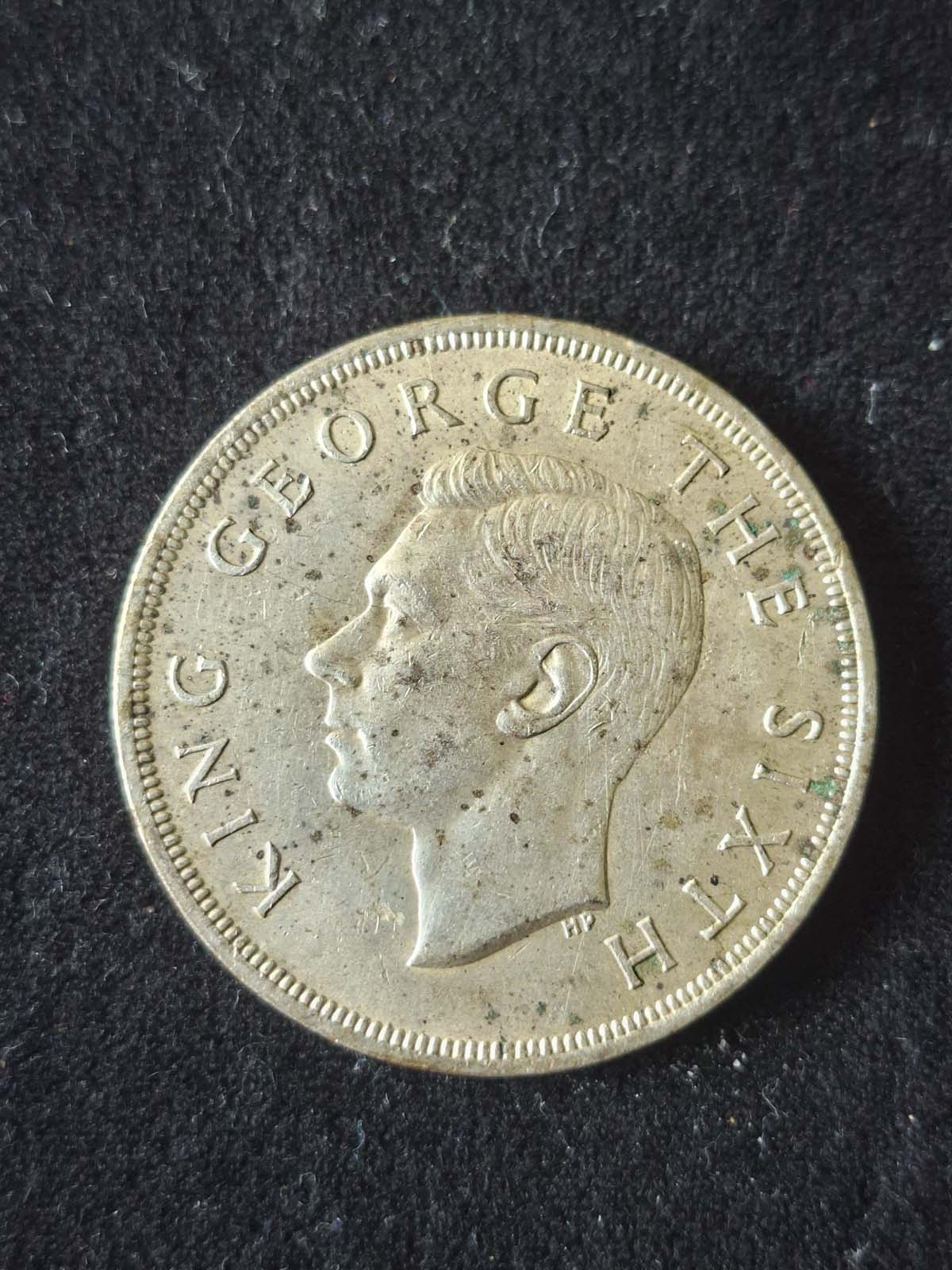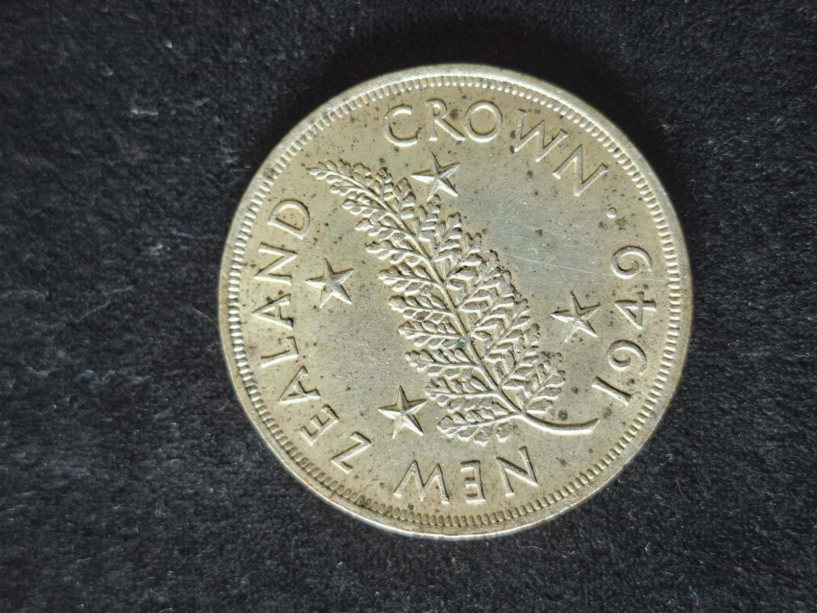 Here we have a1949 New Zealand crown coin, composition silver (.500) . 200.020 minted. Weight: 28.26g