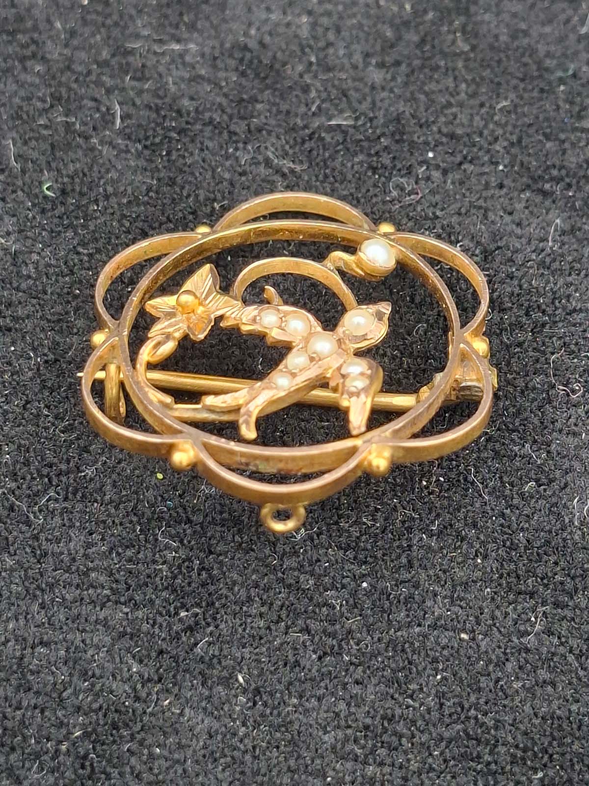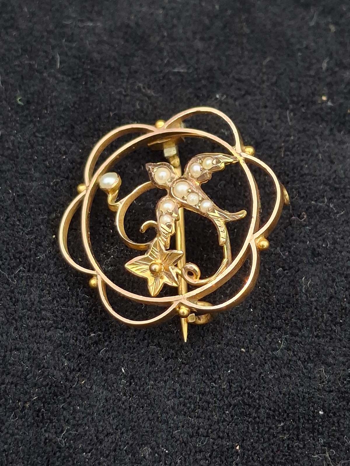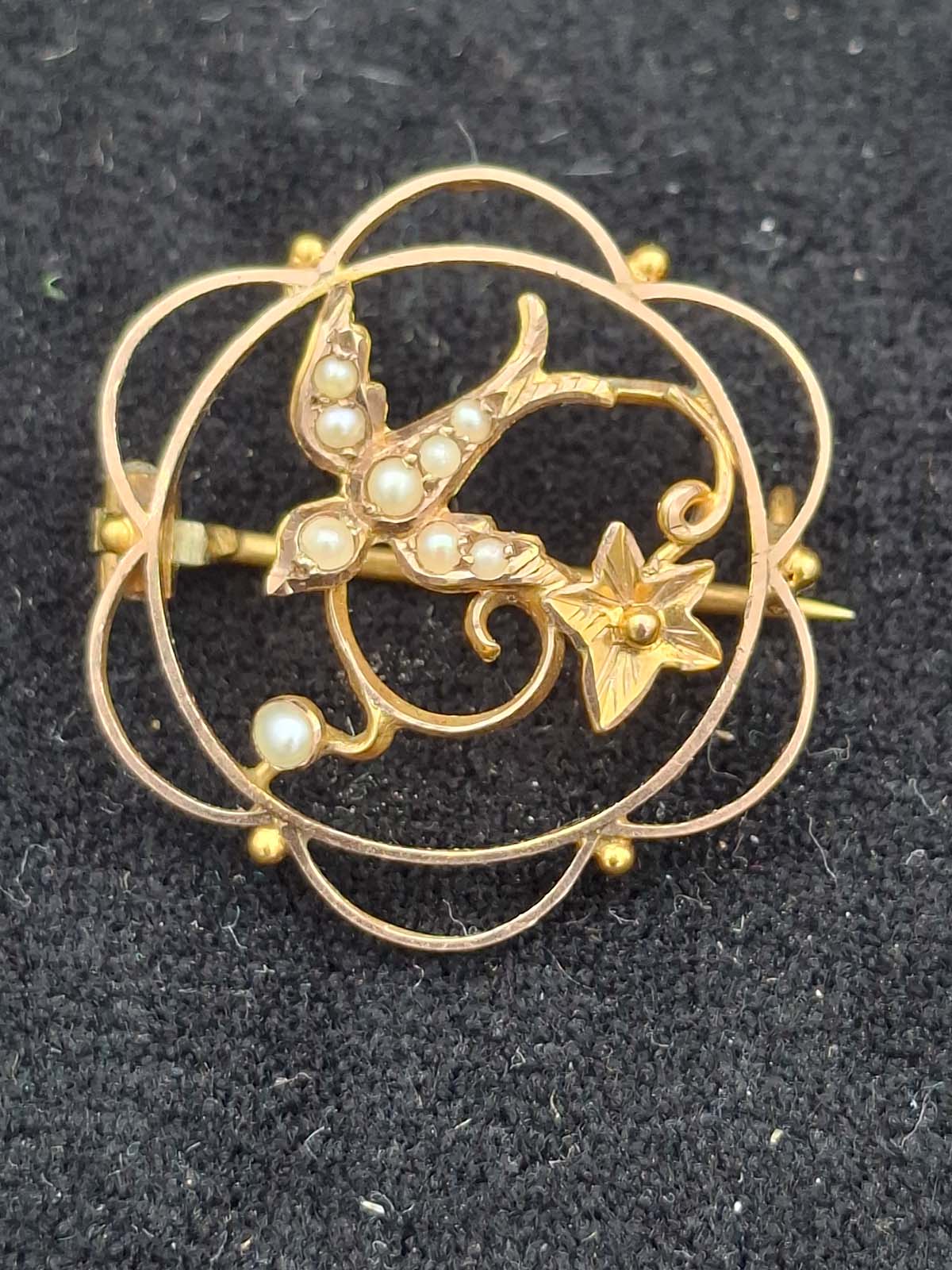 An attractive Edwardian 9ct gold, stamped, seed pearl brooch/Pendant in the form of a “Swallow” bird. Swallows are meant to represent Love, Loyalty & Faithfulness. Total weight approximately 2.07g