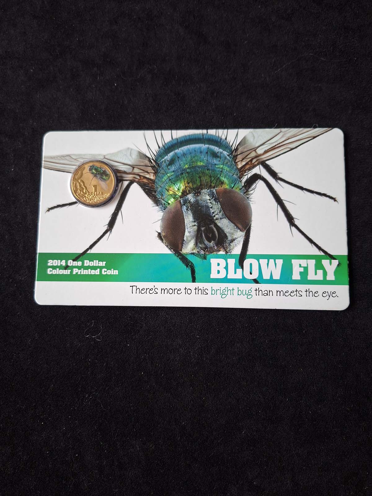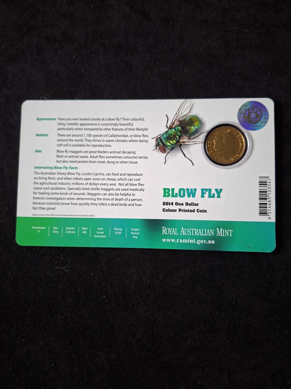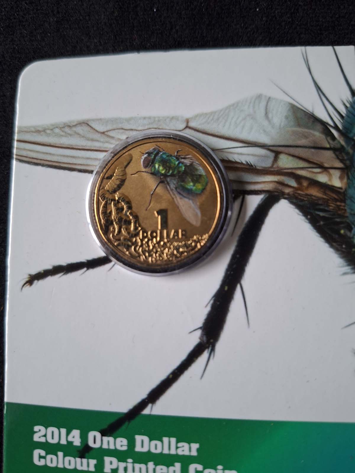 In 2014 The Australian mint issues several different printed coins of various Australian species. This one is the common Blow Fly. Each proof pack provides information on that species. Limited to 30,0