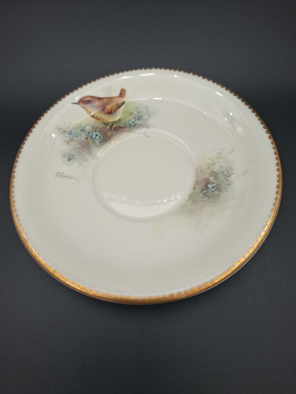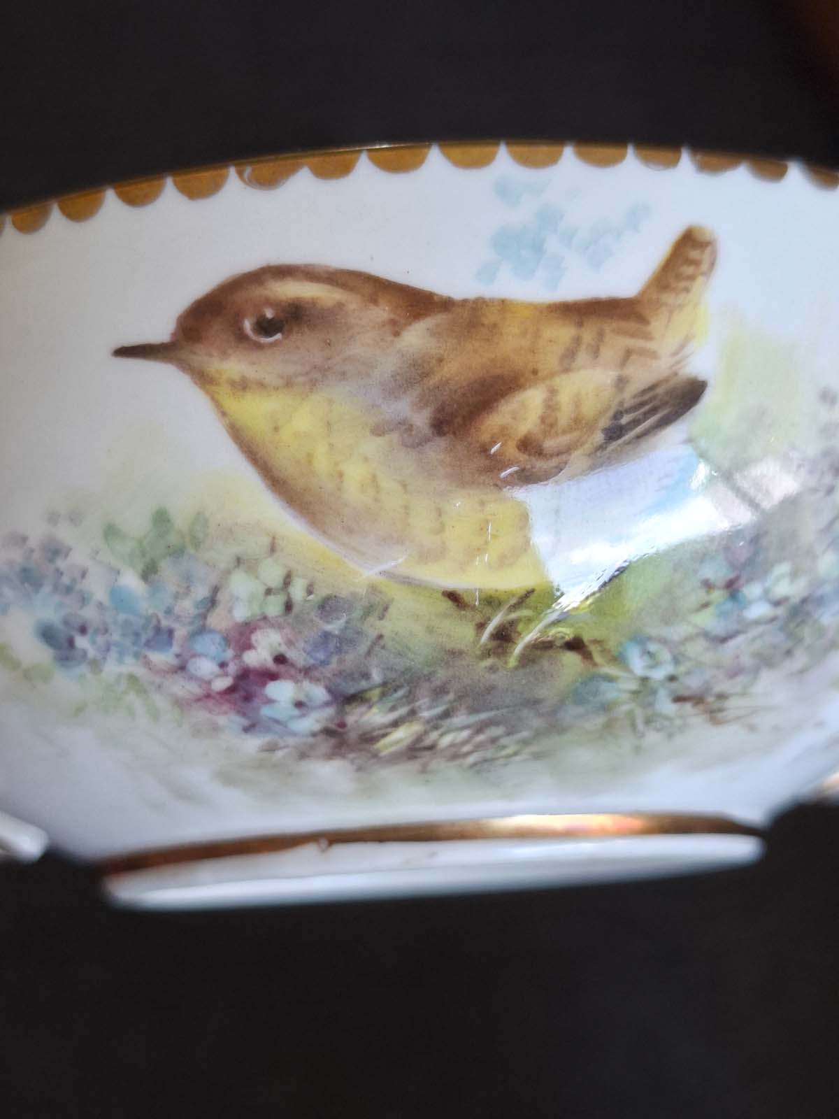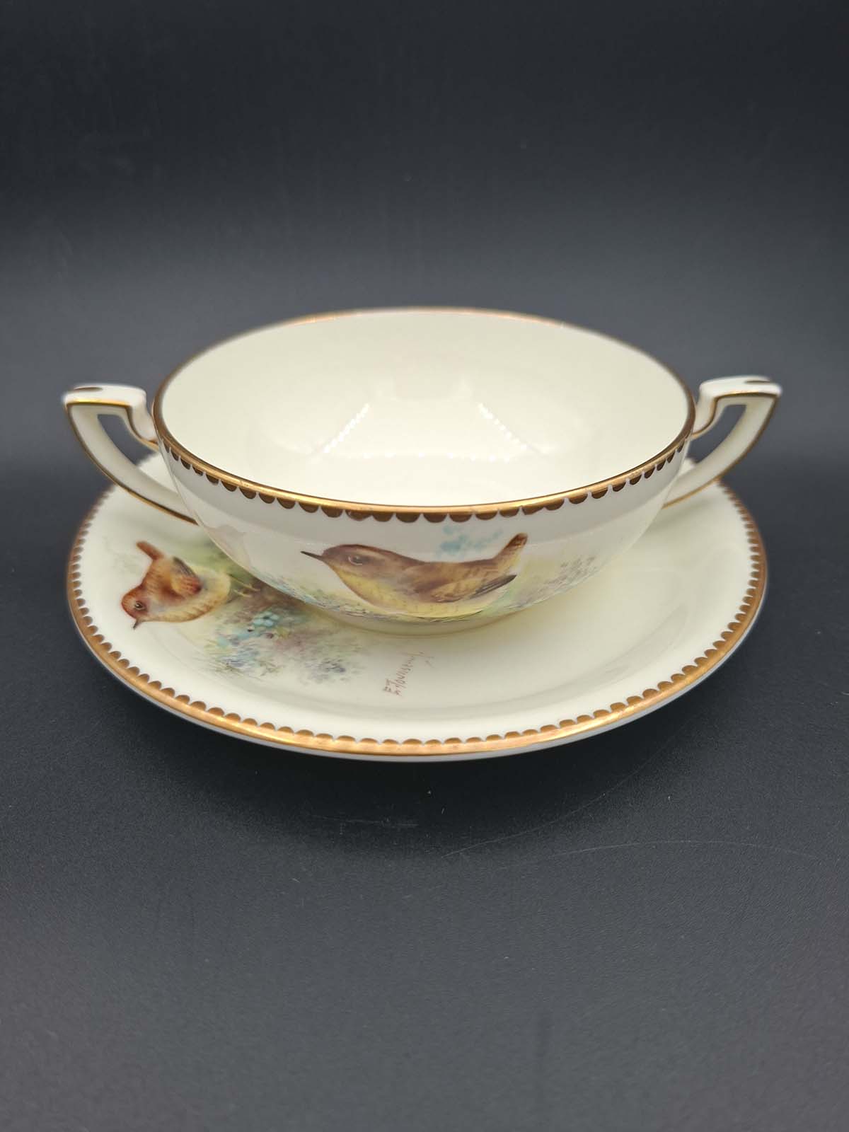 A rare and beautiful hand painted soup bowl and saucer by Royal Worcester artist Edward Townsend. Both pieces are signed and depict the small British bird the “Wren” Both pieces also have a scalloped gold border.
