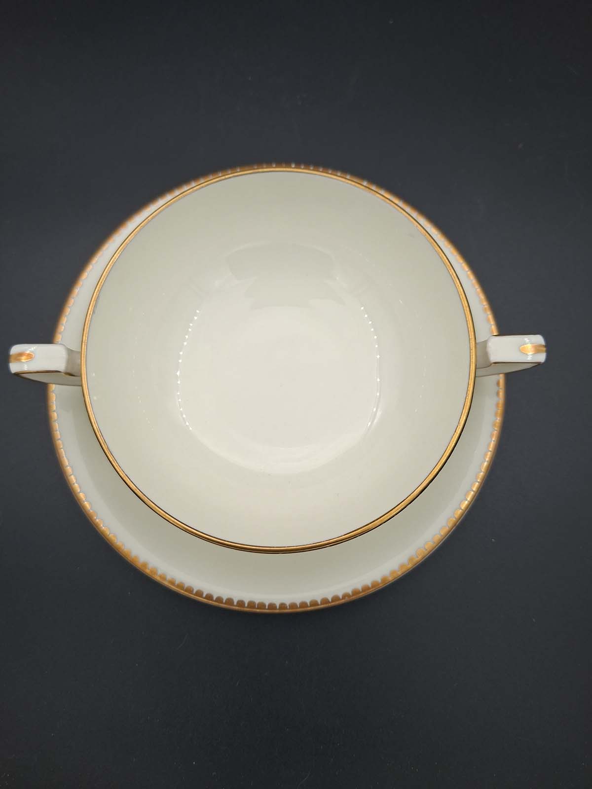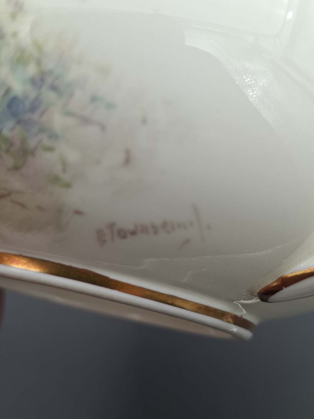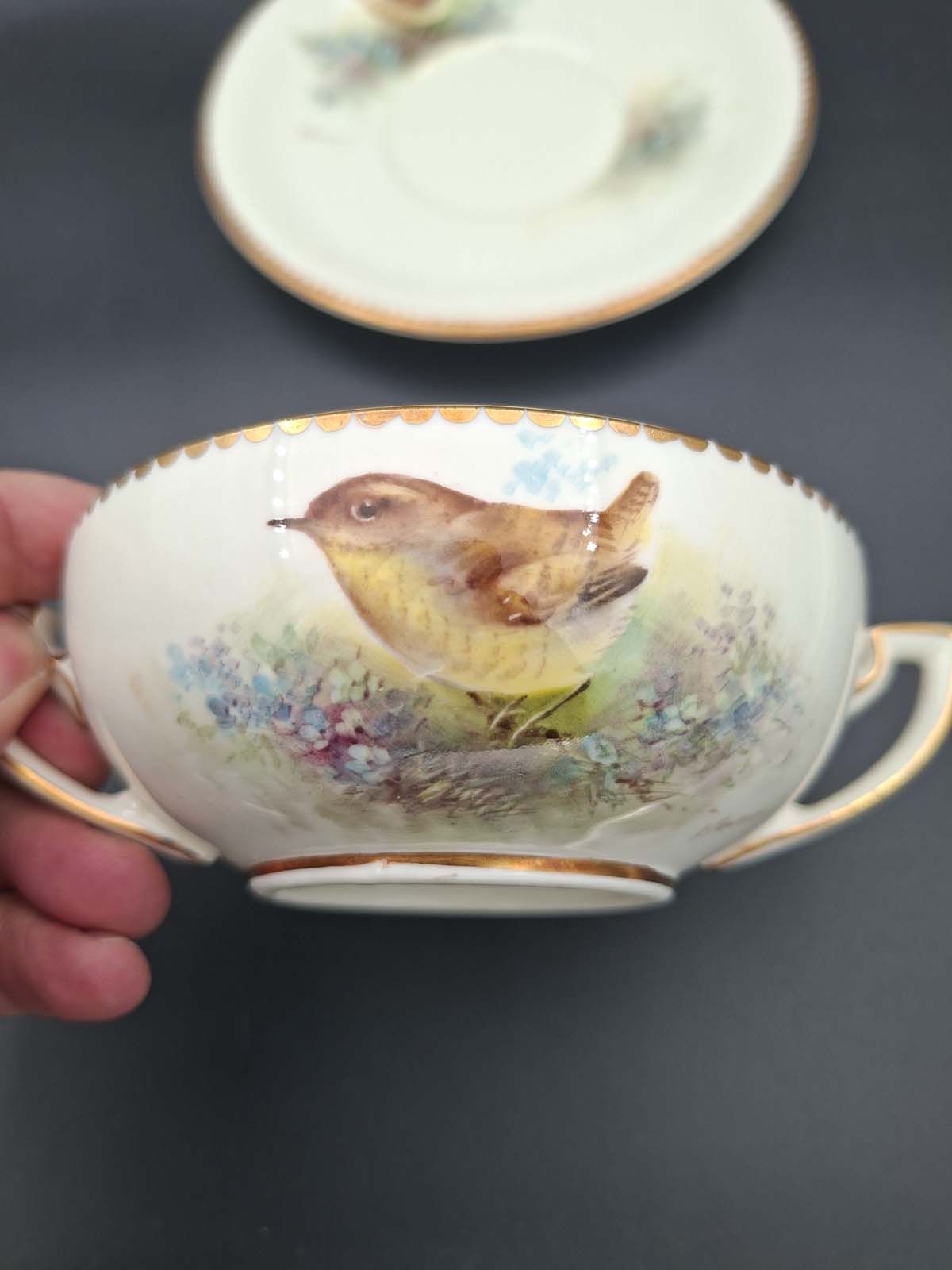 A rare and beautiful hand painted soup bowl and saucer by Royal Worcester artist Edward Townsend. Both pieces are signed and depict the small British bird the “Wren” Both pieces also have a scalloped gold border.