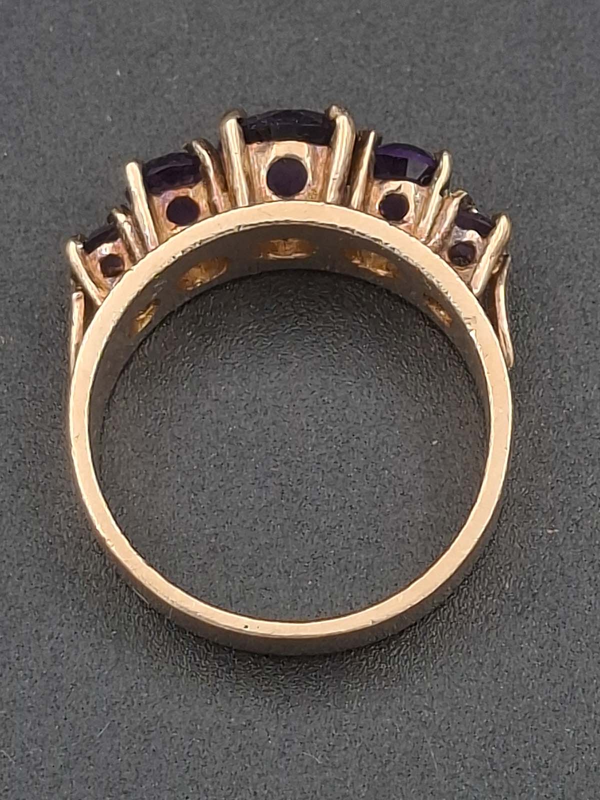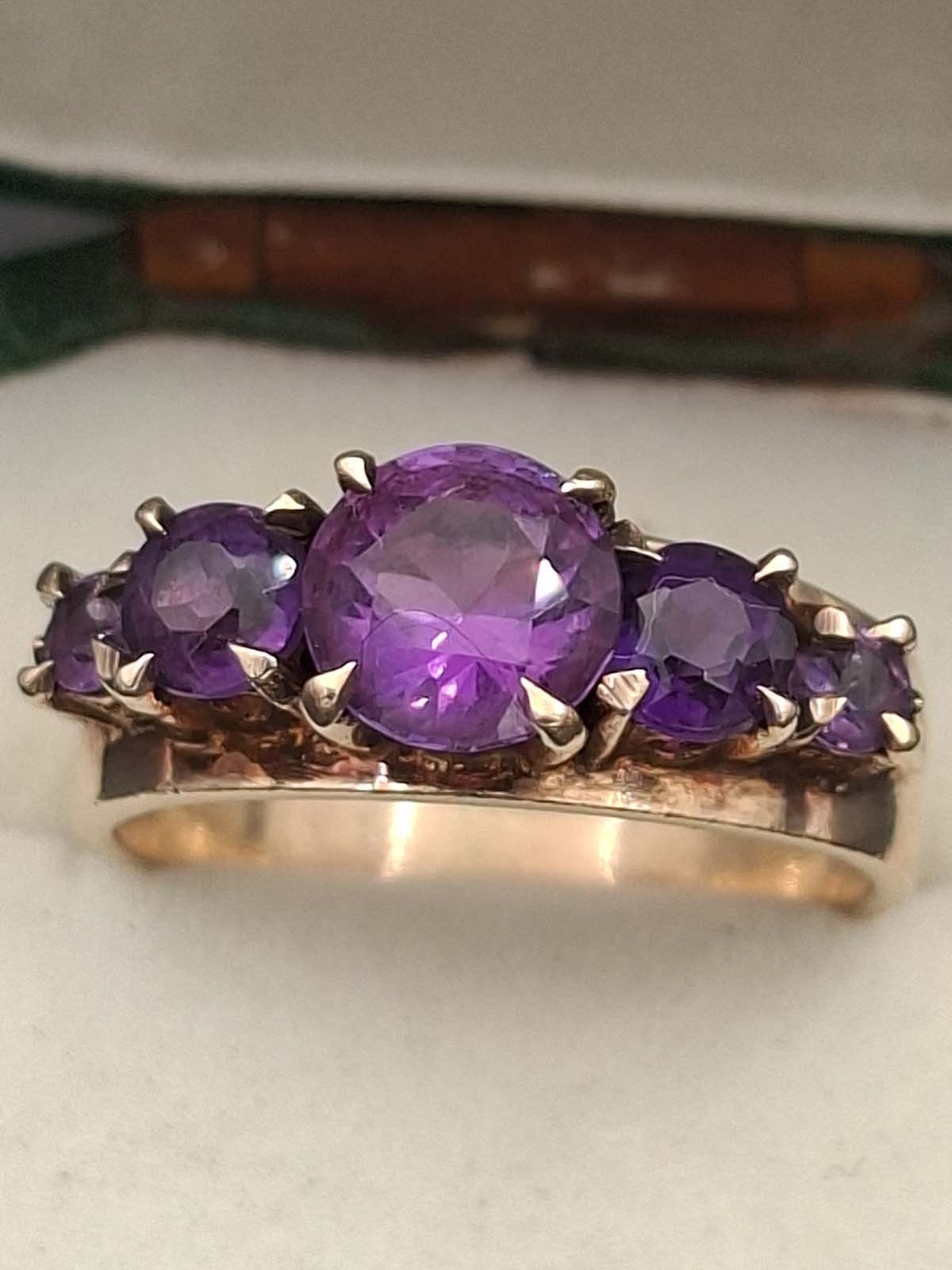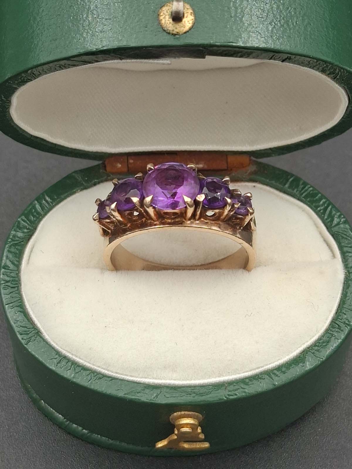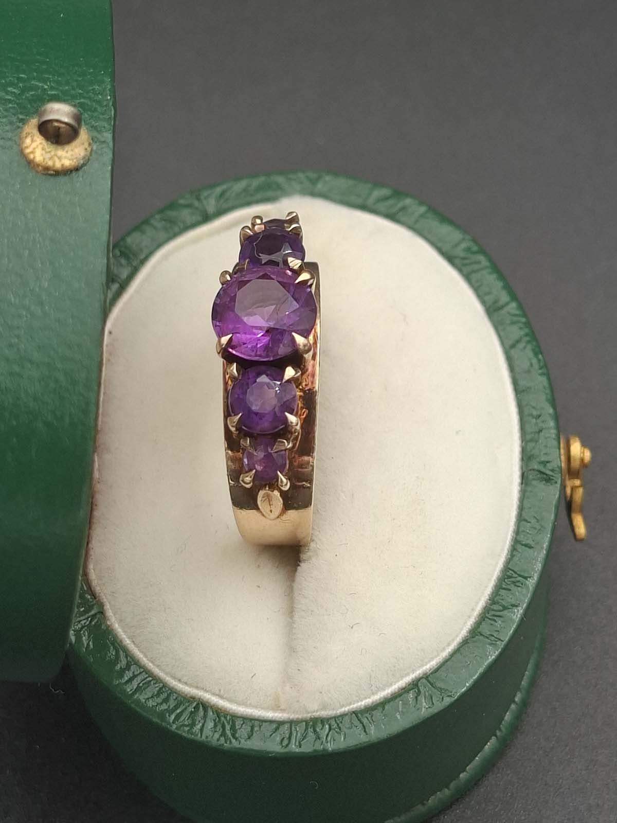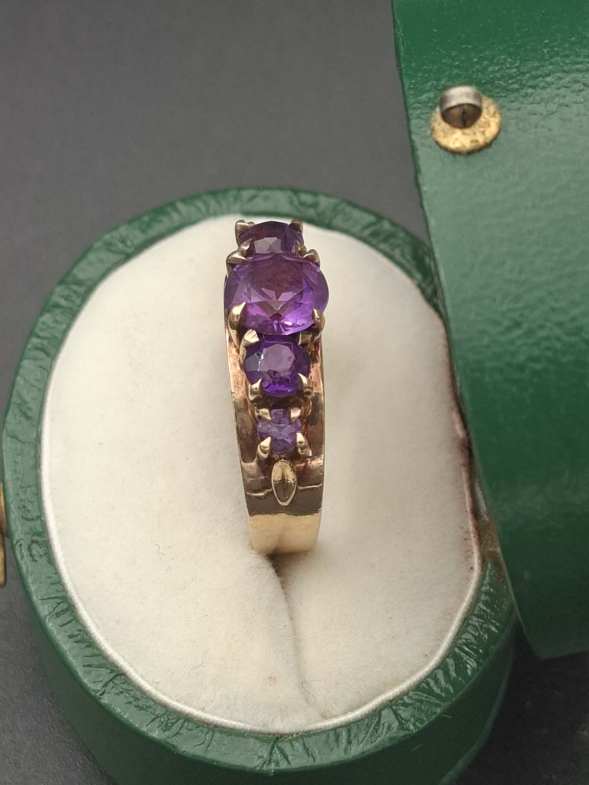A wonderful vibrant 5 stone graduated amethyst gemstone ring set in 9ct, stamped, gold. Total weight approximately 6.57g.