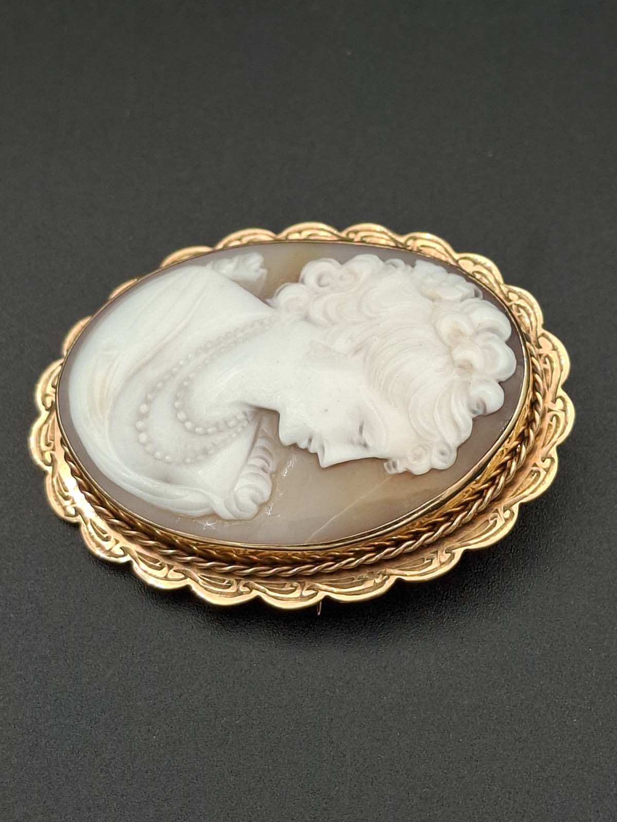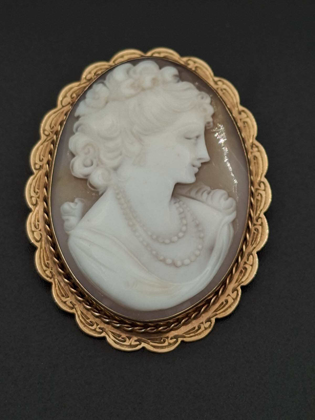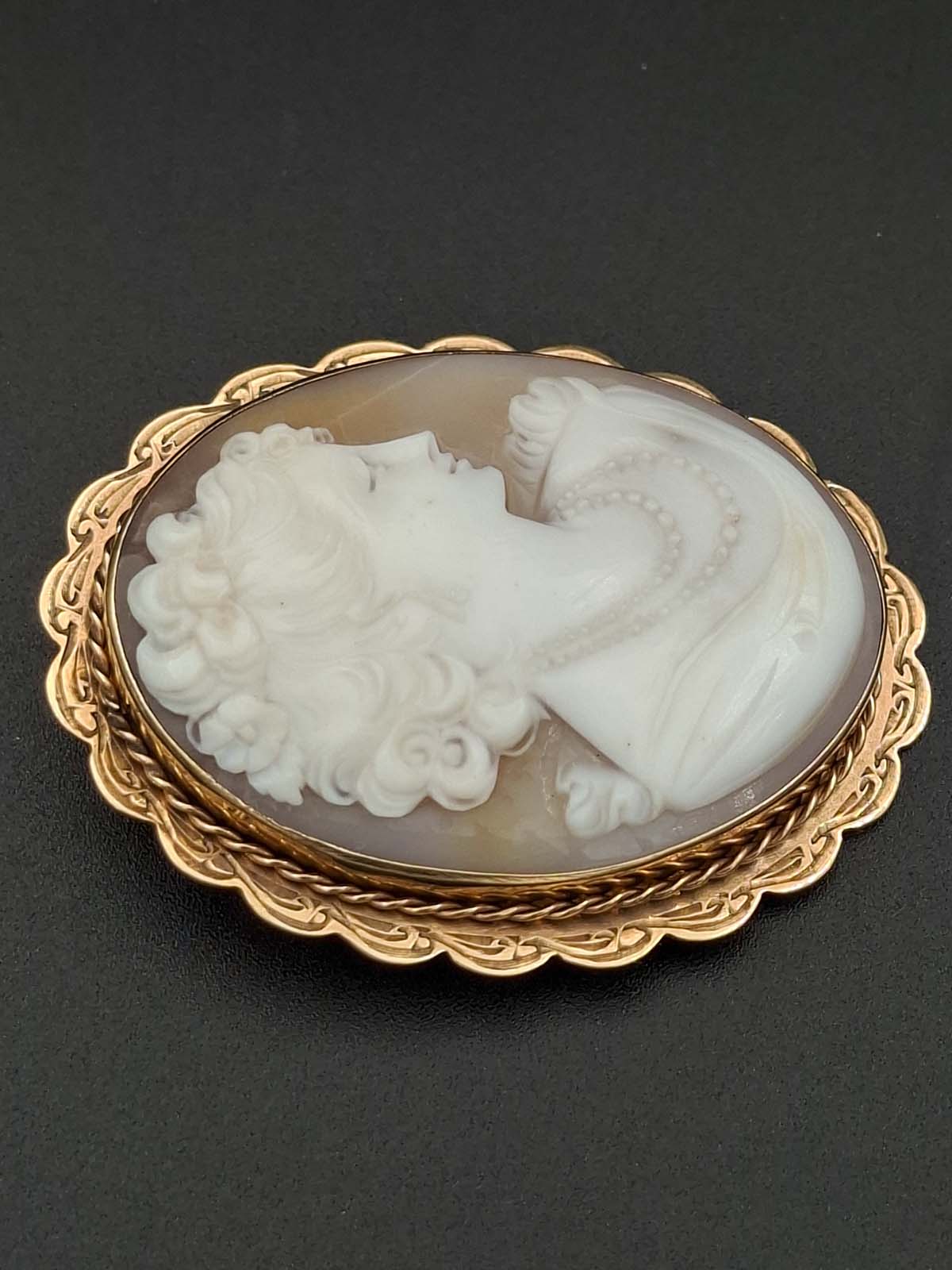 An attractive 9ct, stamped, well carved cameo brooch of a young lady wearing a double strand pearl necklace looking to the right. Total weight is approximately 13.87g.