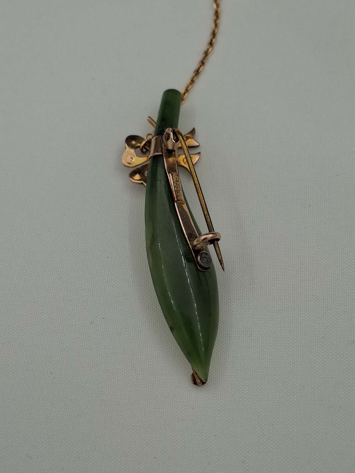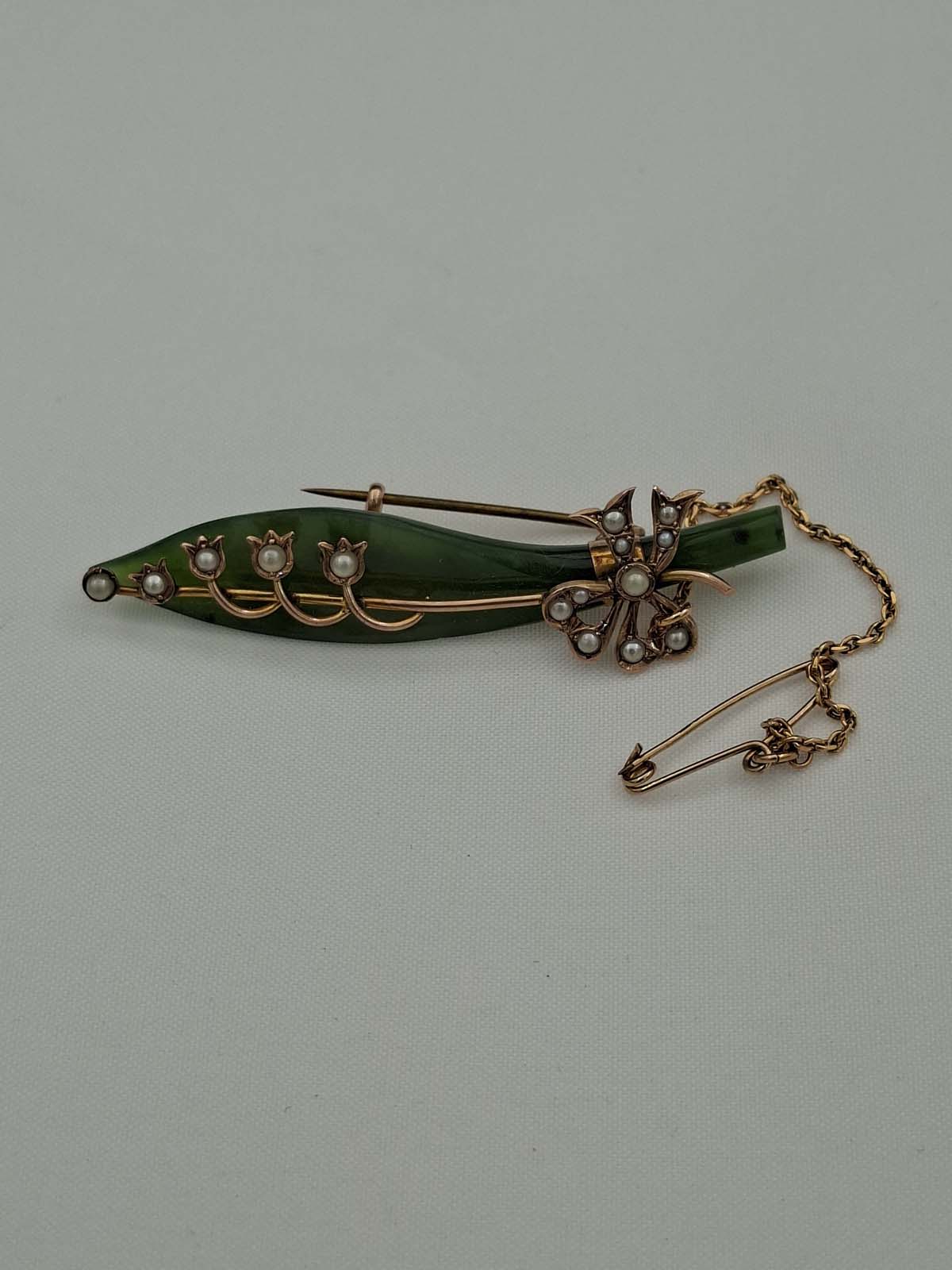 A beautiful leaf shaped greenstone brooch set in 9ct, stamped, with a bow to the stem and flowers along the leaf. Both bow and flowers are set with seed pearls. A safety chain is attached; total weight is approximately 5.39g.