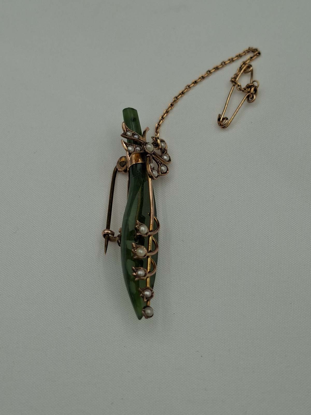 9ct Gold Greenstone & Seed Pearl Brooch