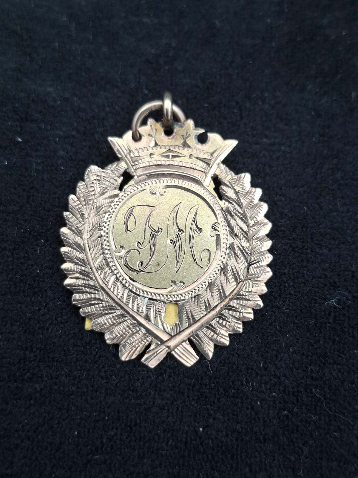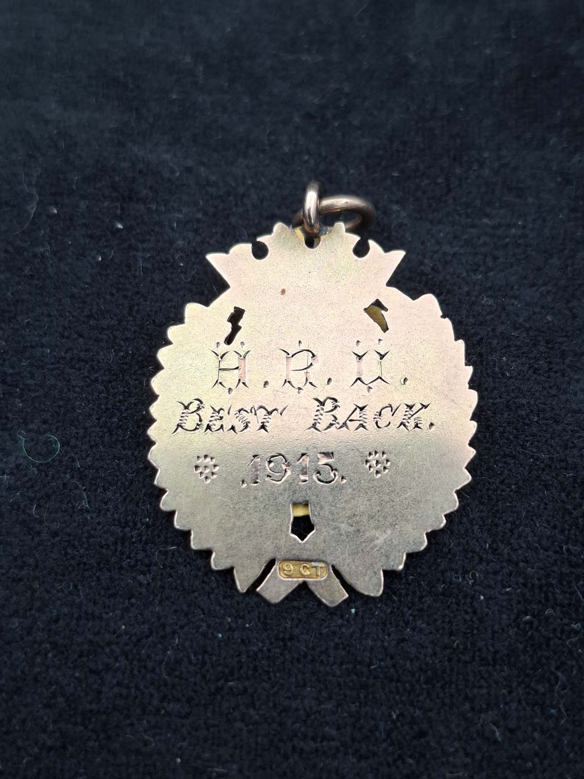 A 9ct gold rugby medallion presented to “JM” for best back in 1915 by H.R.U. This medallion weighs 4.23gms