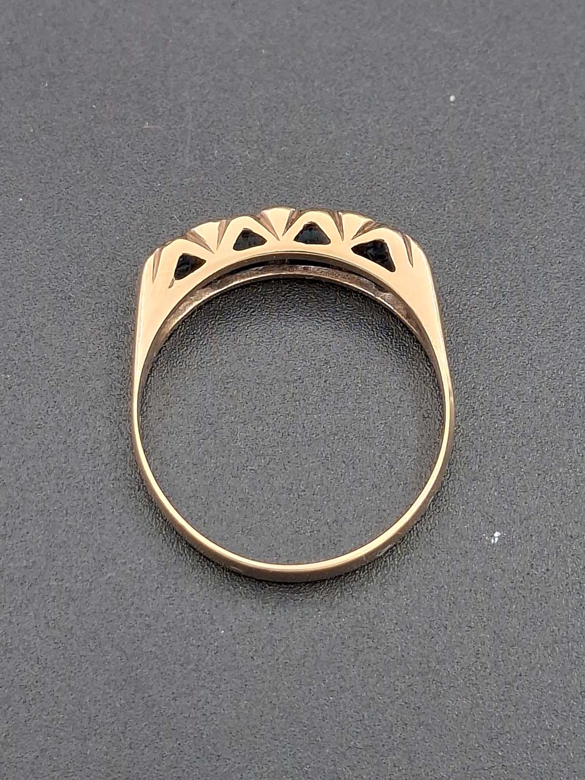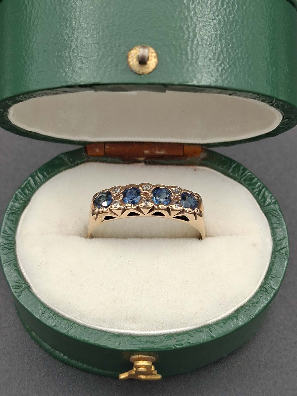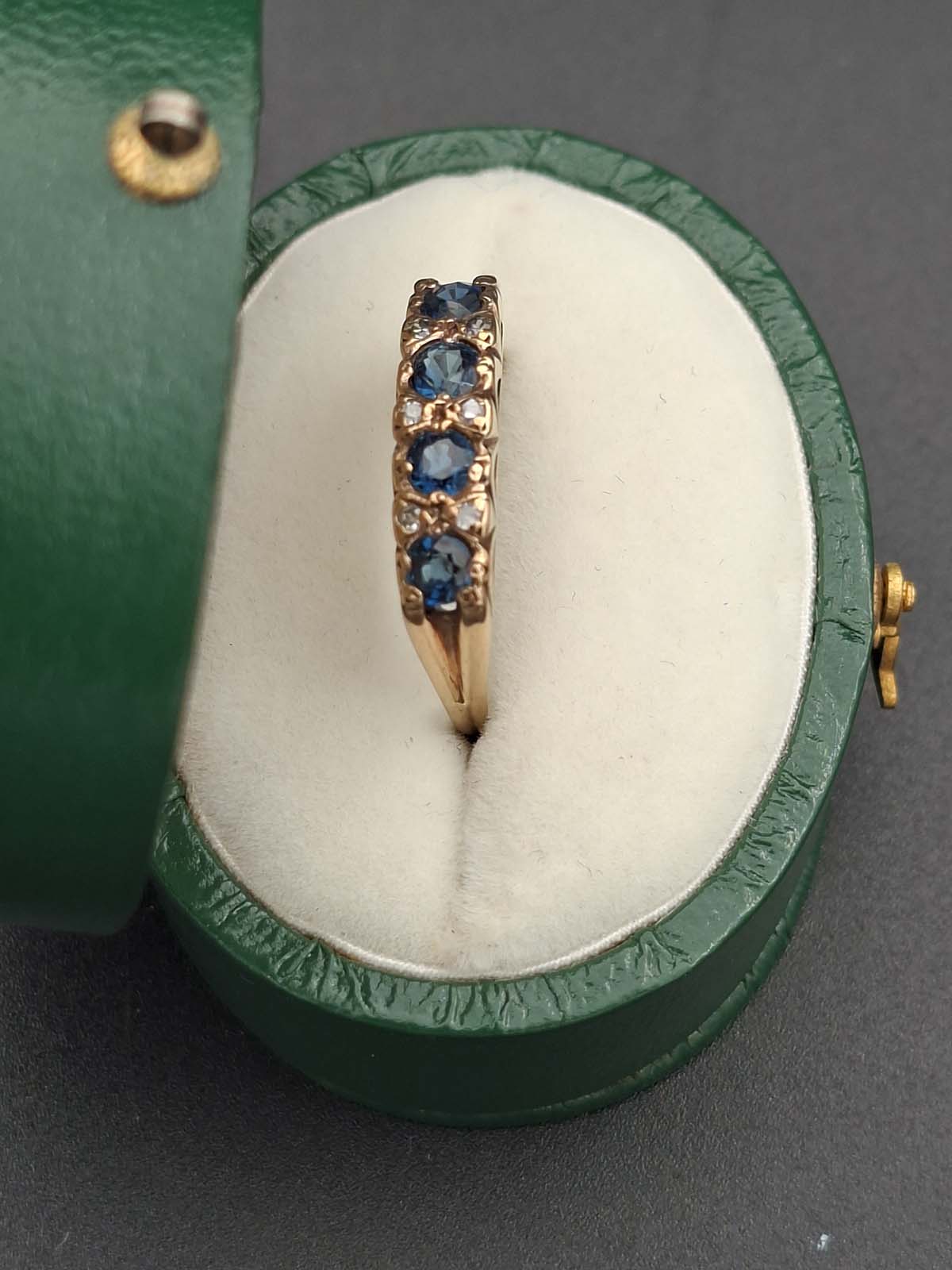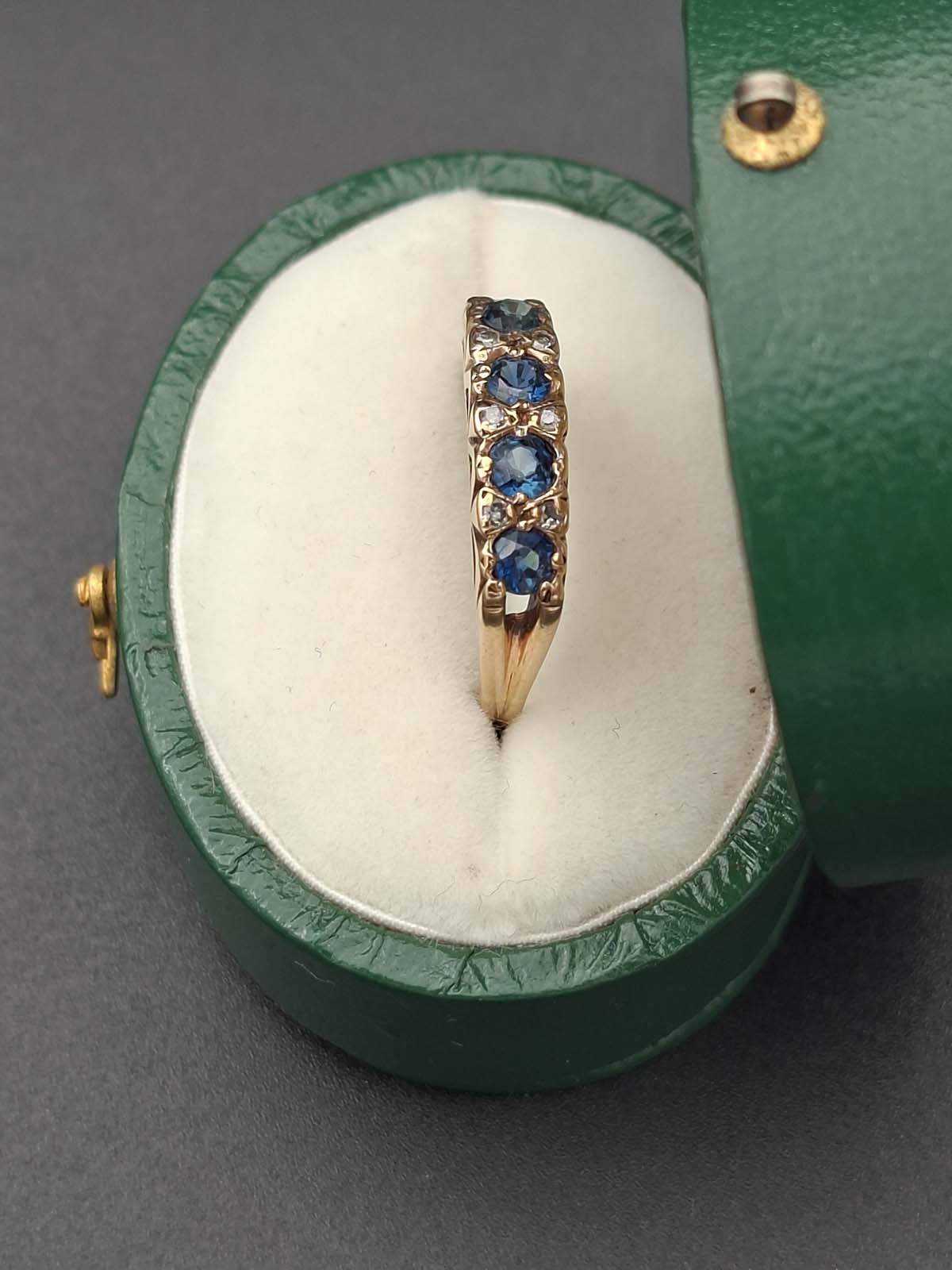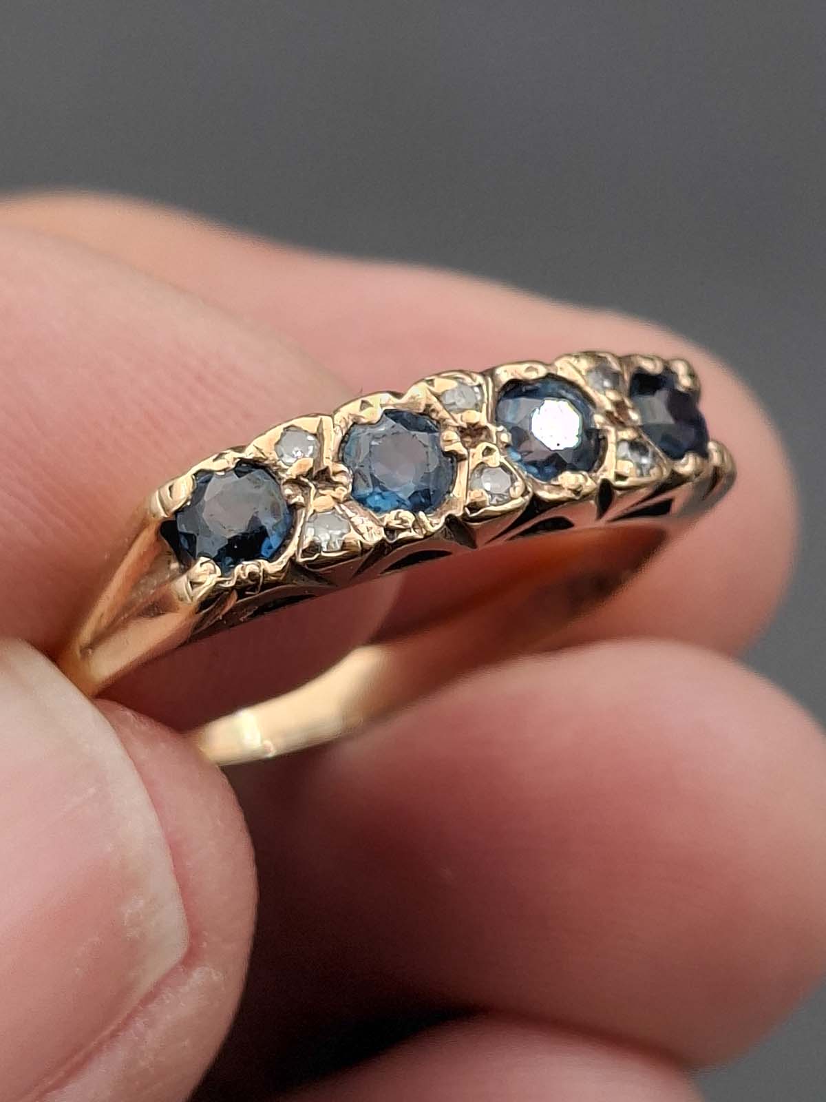 The beauty of natural sapphires and diamonds complement each other perfectly in the gorgeous ring. 4 natural sapphires approximately 3.30-3.40×2.00-2.40mm round mixed cut, calculated approximately .74ct total, dark blue B 7/4, slightly included type II, evidence of heat treatment, slightly abraded facet junctions. 6 diamonds approximately 1.30mm single cut, calculated approximately .06ct total, estimated I/J colour, I clarity. 9ct, tested, yellow gold cast rounded band approximately 2.3-2.7mm tapered and 0.6mm thick forming claw and grain set London bridge setting top with pierced sides and underails. Total weight approximately 2.29g Previously valued for New Replacement Value 6/6/2023 $2190.00nzd.