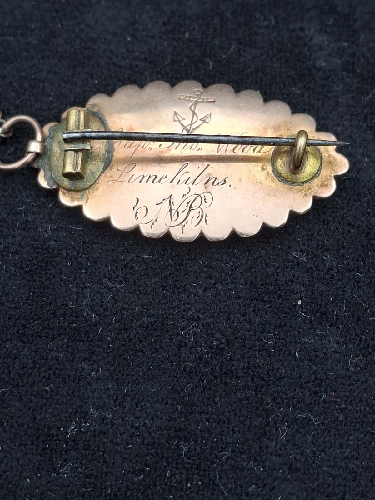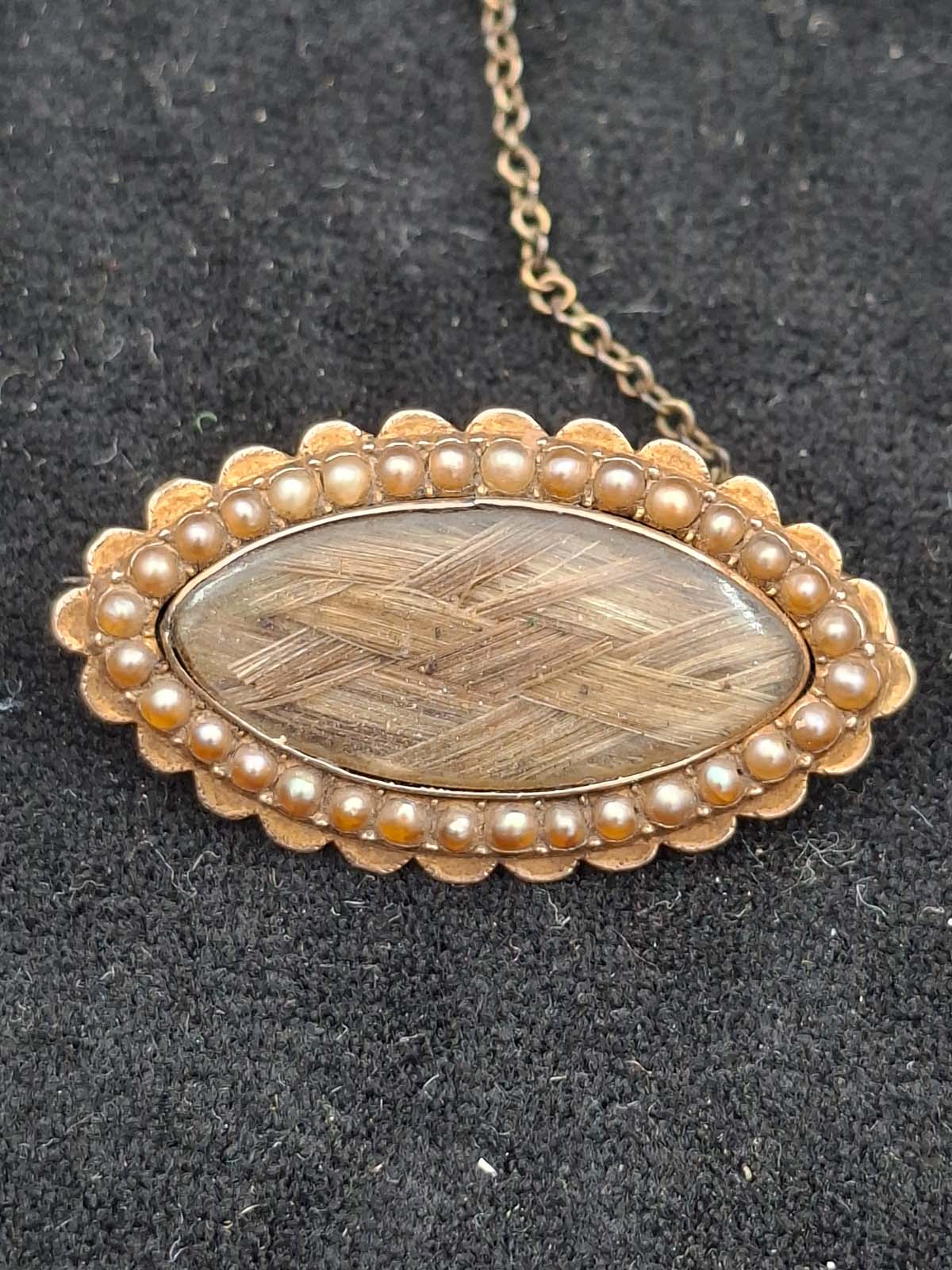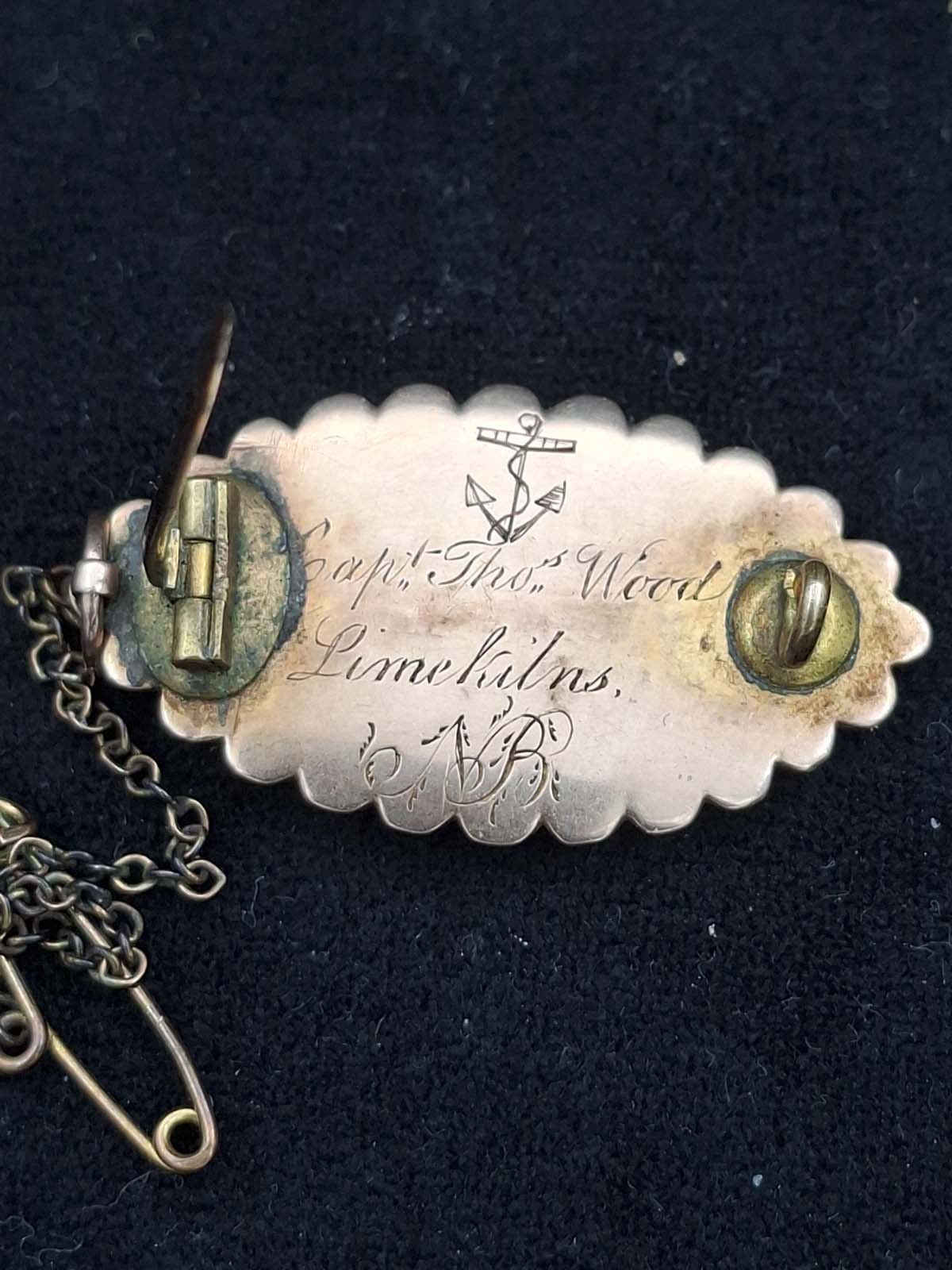A very interesting Victorian 9ct gold mourning brooch inscribed with an anchor “Capt. Tho Wood, Limekilns, NB. The brooch contains the original woven hair which is surrounded by Seed Pearls.