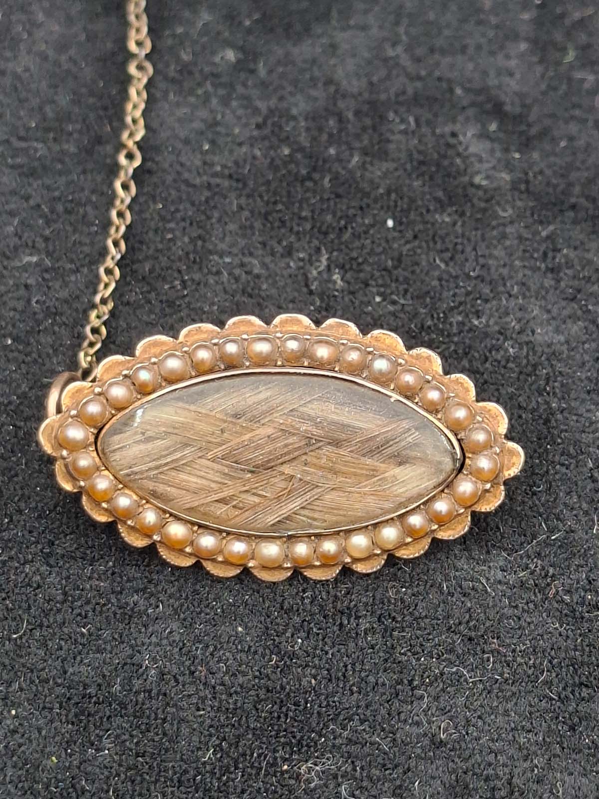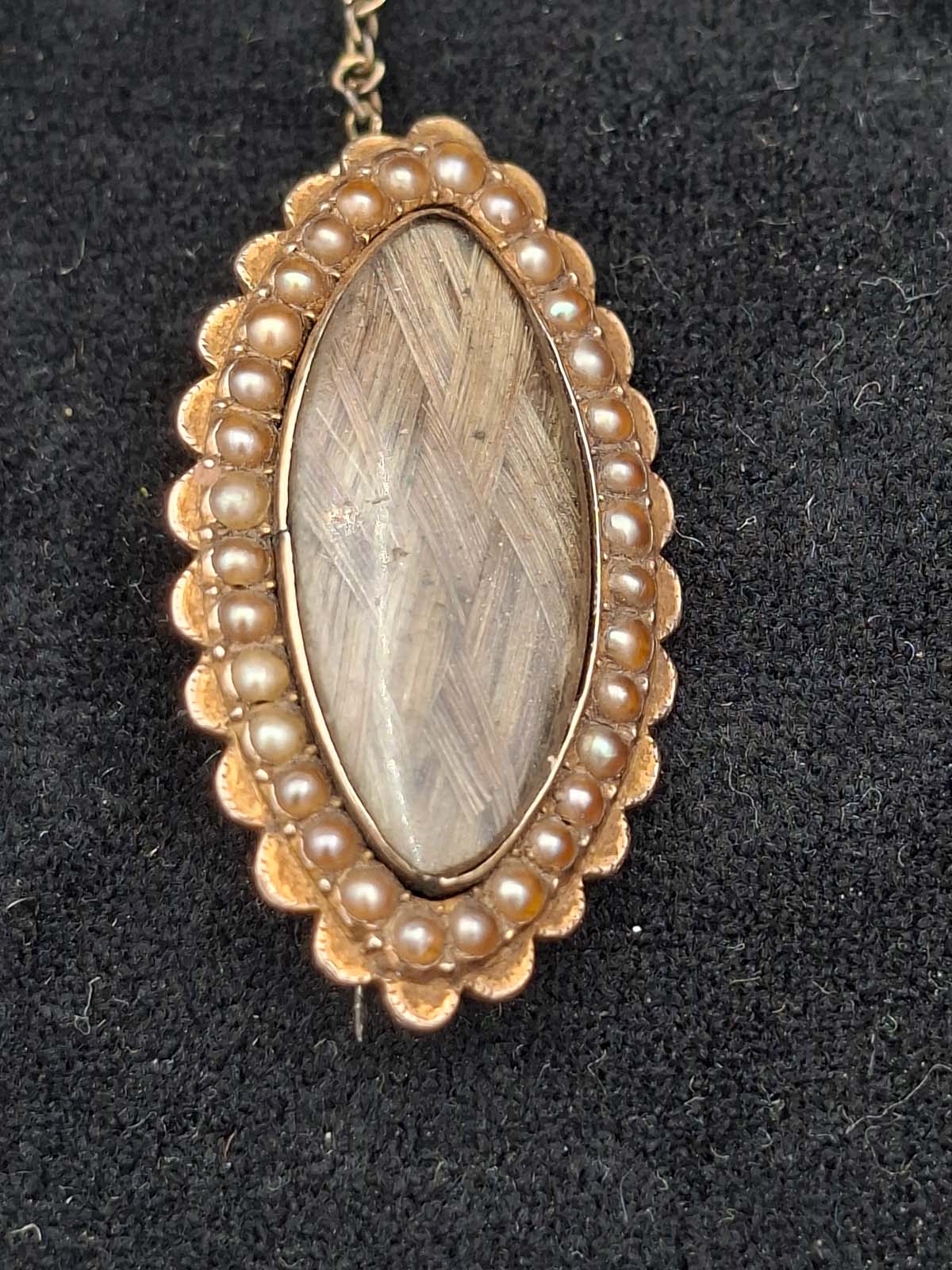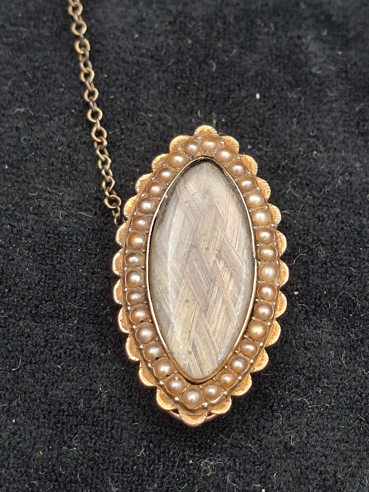 A very interesting Victorian 9ct gold mourning brooch inscribed with an anchor “Capt. Tho Wood, Limekilns, NB. The brooch contains the original woven hair which is surrounded by Seed Pearls.