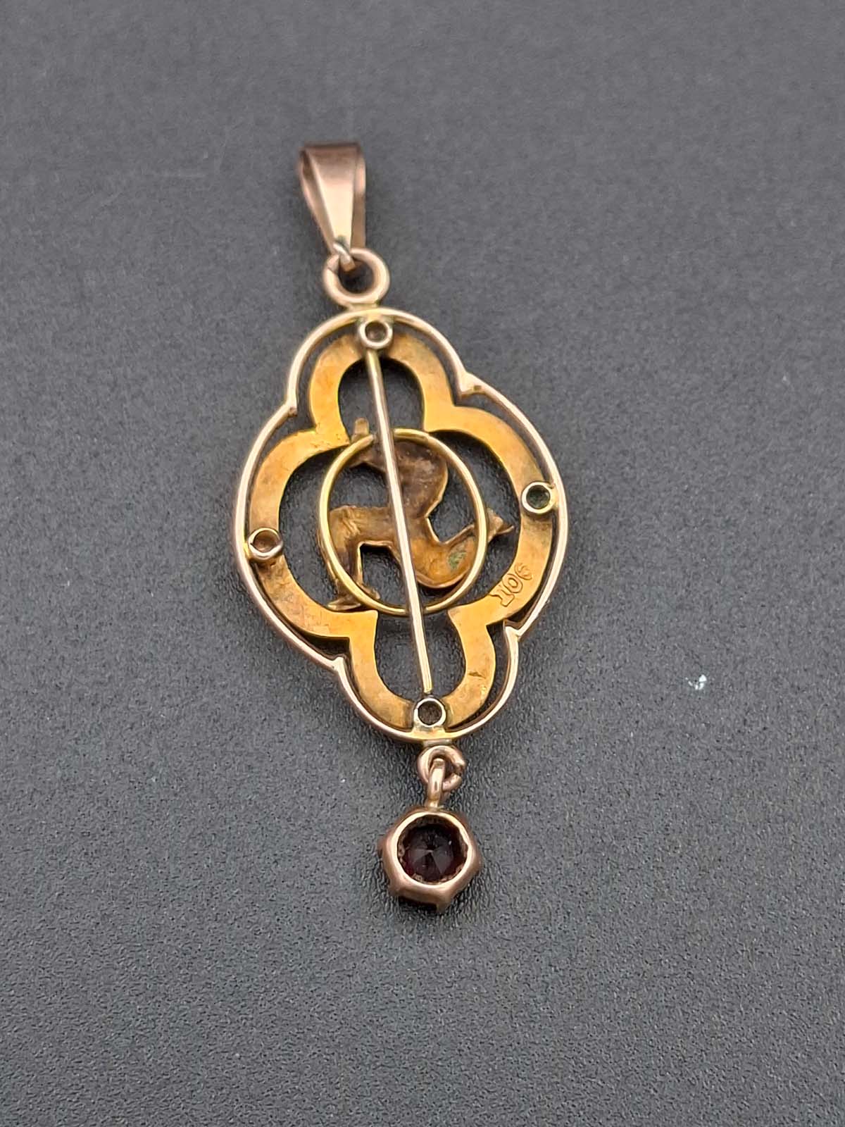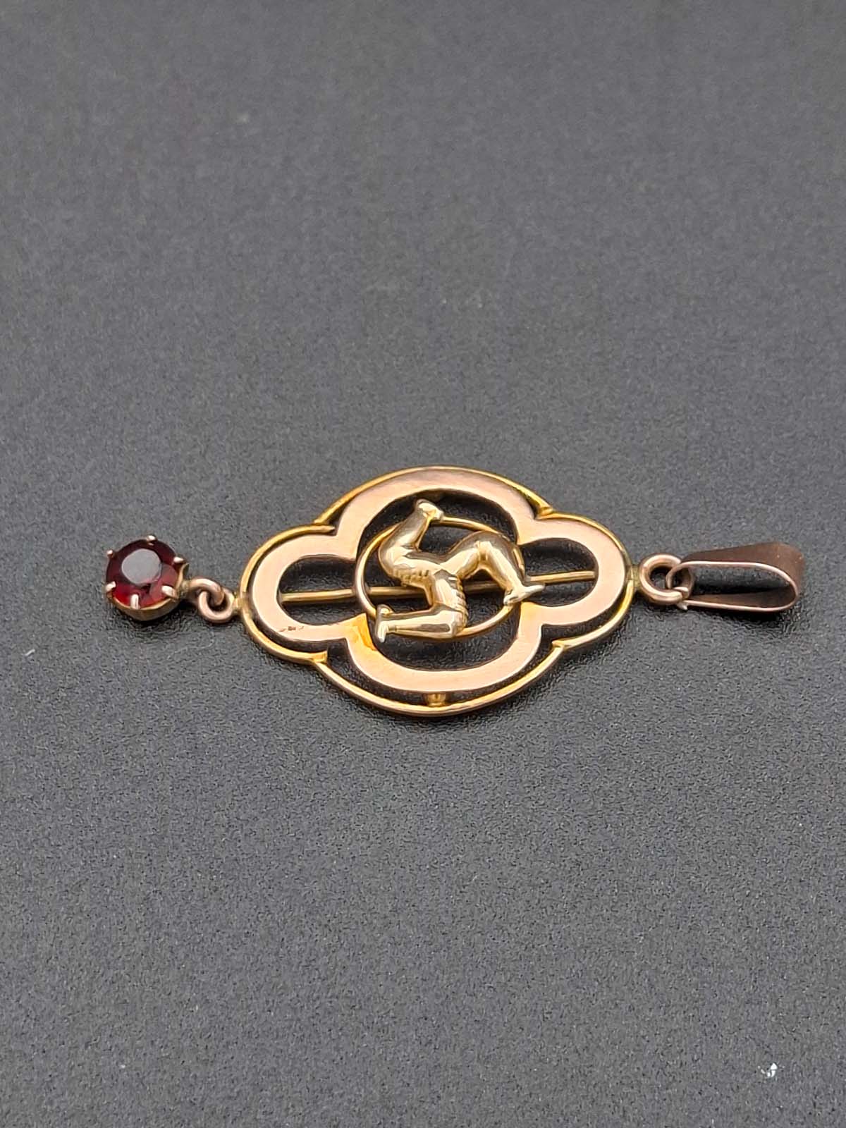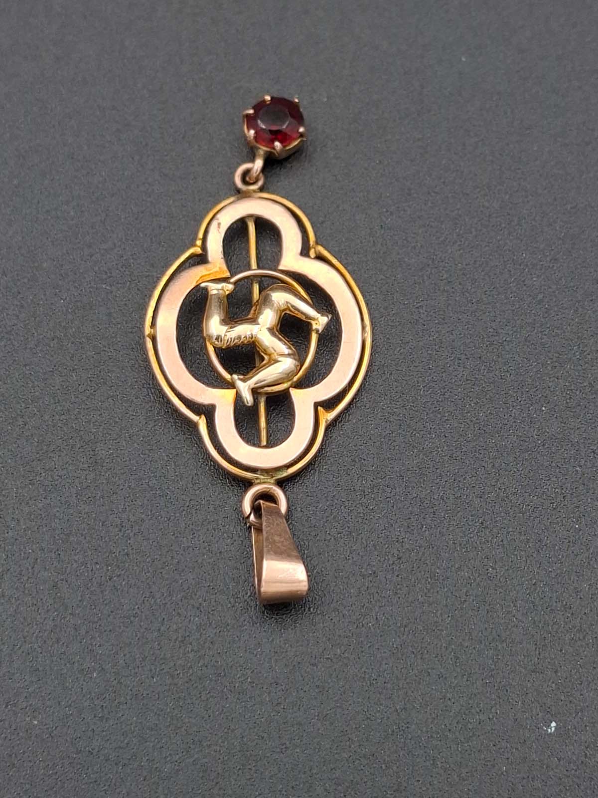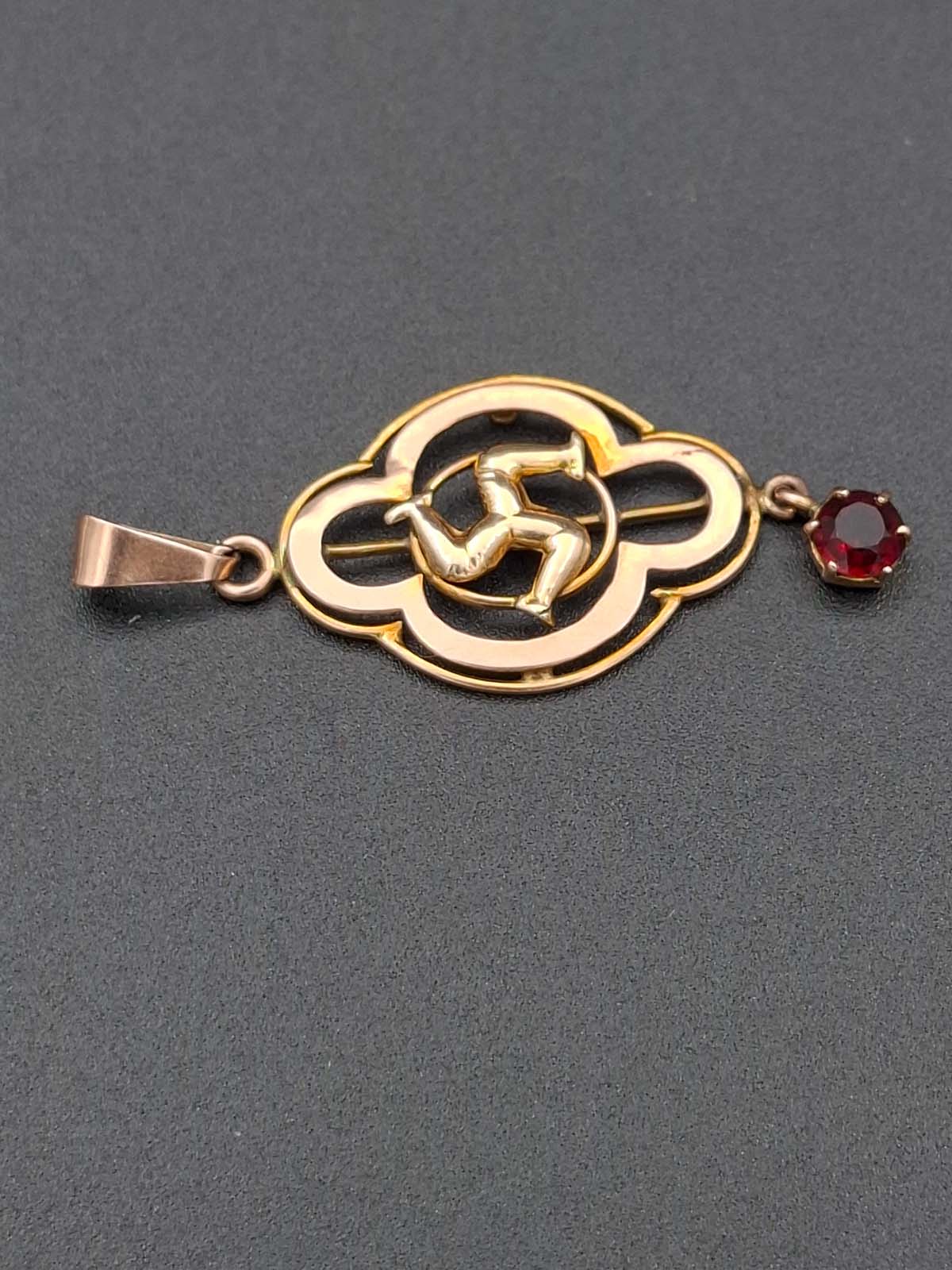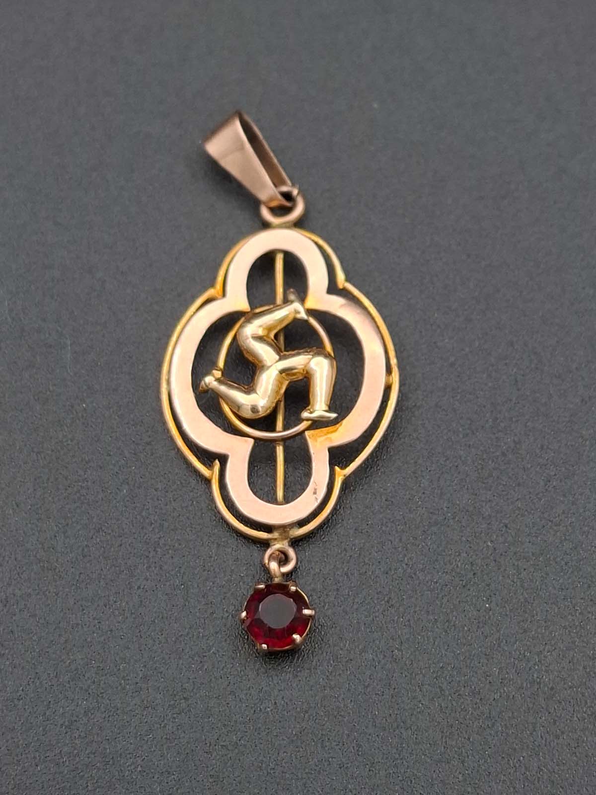 A sweet little Isle of Man 9ct, stamped, pendant with a red stone drop (possibly a garnet). Total weight approximately 1.30g.