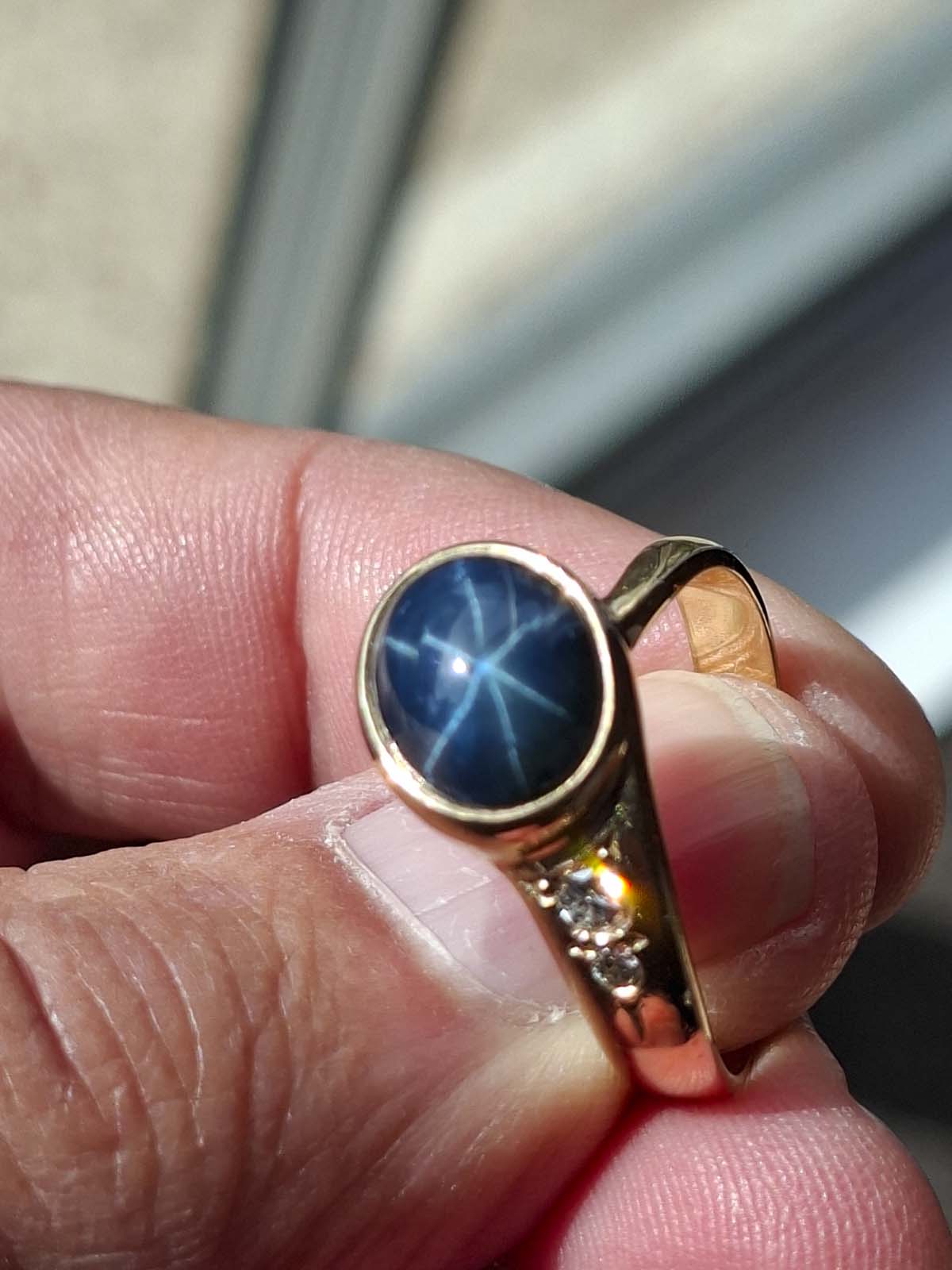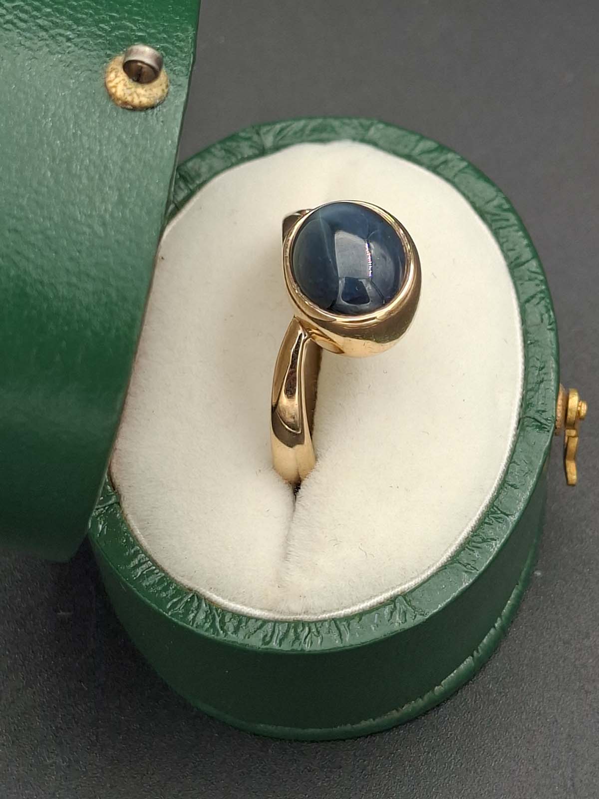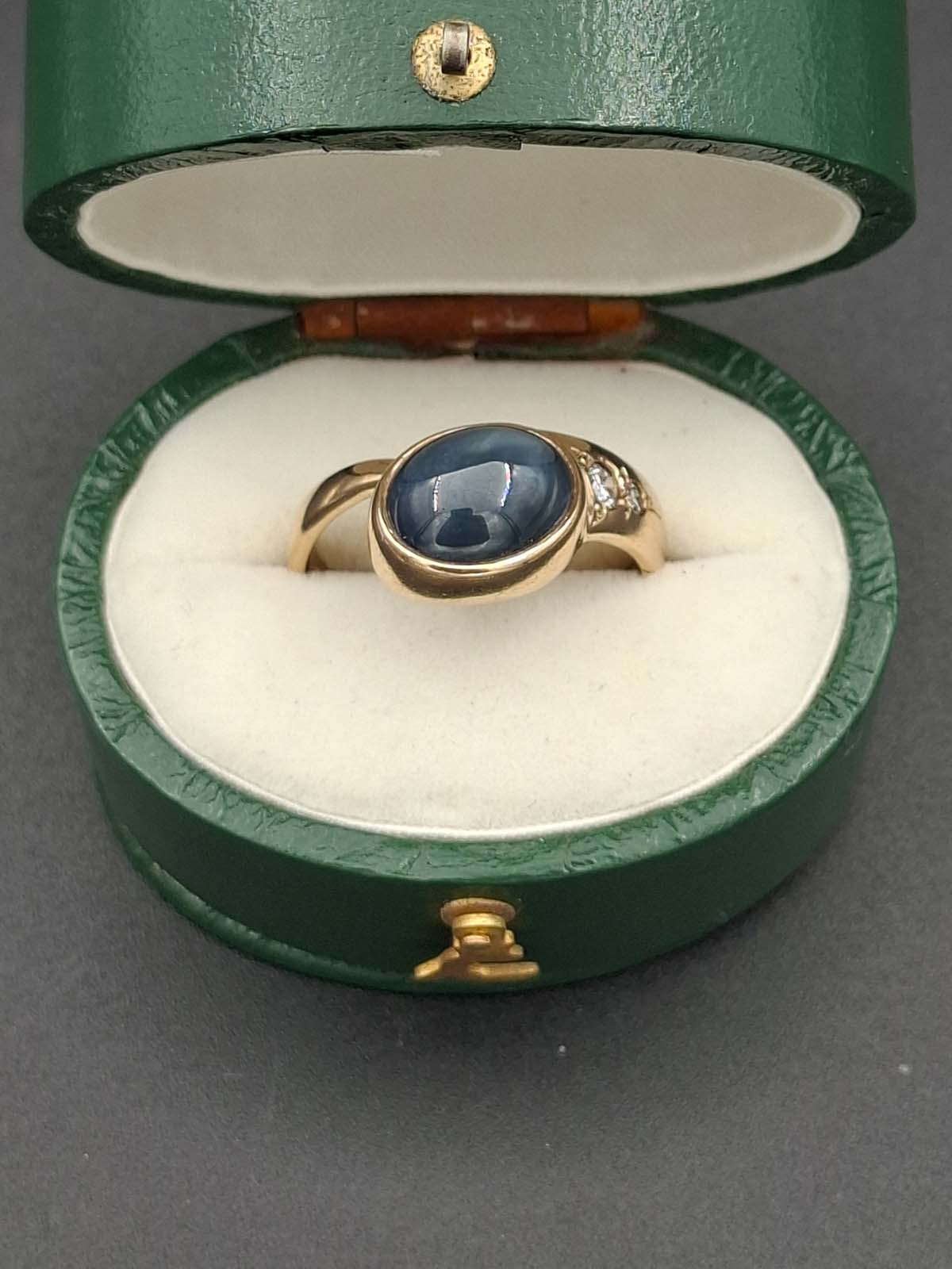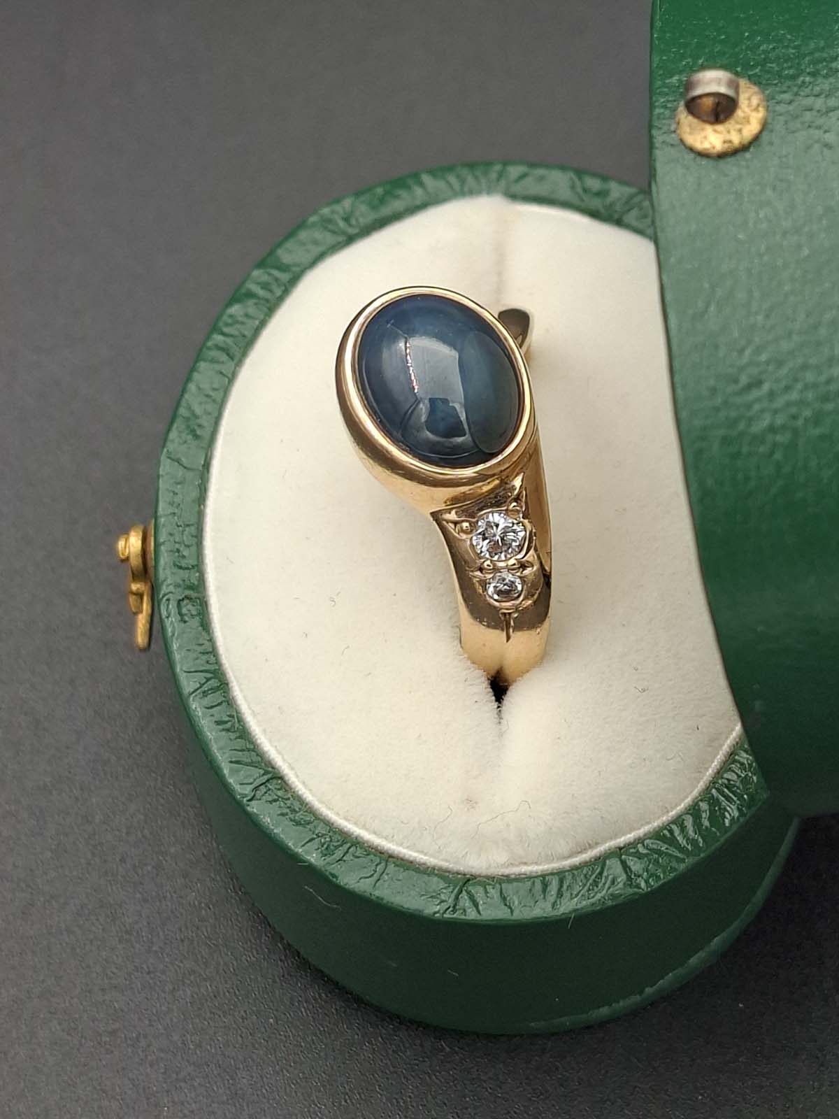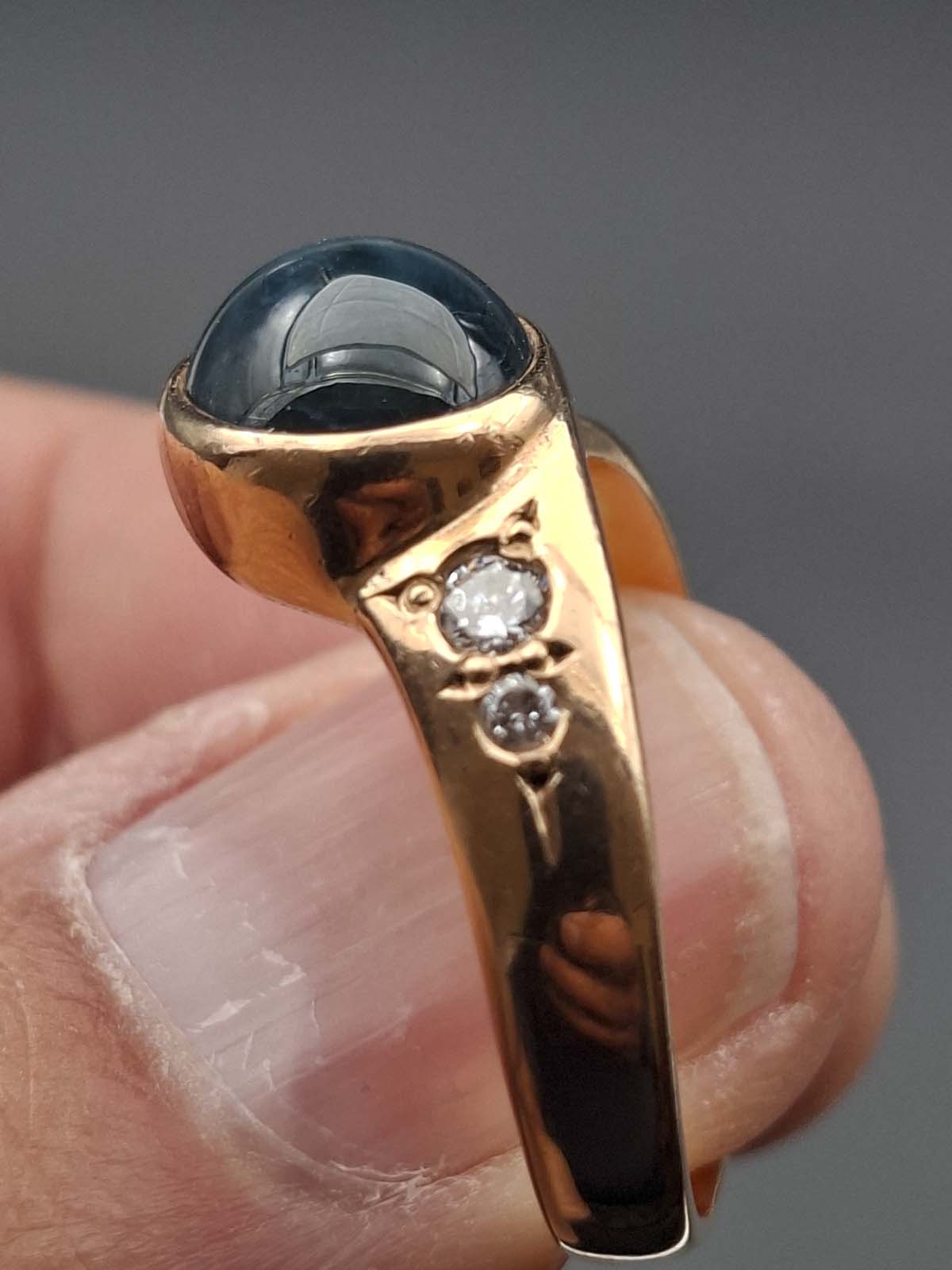A fabulous star sapphire and diamond ring set in 9ct gold. 1 lattice diffused star sapphire approximately 10.80×8.60×6.30mm oval cabochon opaque dark blue with sharp bright star. 1 diamond approximately 2.85×1.75mm round brilliant cut, calculated approximately .085ct. 1 diamond approximately 1.90×1.35mm round brilliant cut, calculated approximately .03ct. Diamonds estimated G/H colour, I clarity. 9ct, stamped 375, yellow gold handmade rounded band approximately 2.3-3.6-5.7mm tapered and 1.4-1.2-1.6mmthick, grain set at wider end on to rub set oval bezel diagonal setting. Total weight approximately 5.63g Previously valued for New Replacement Value 02/12/2022 $3650.00nzd