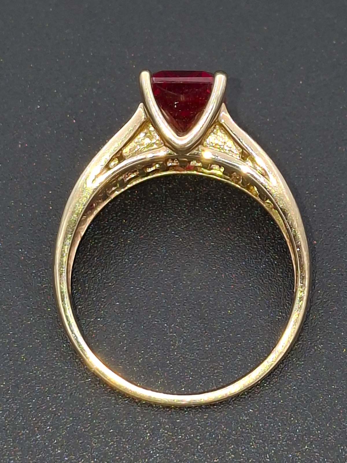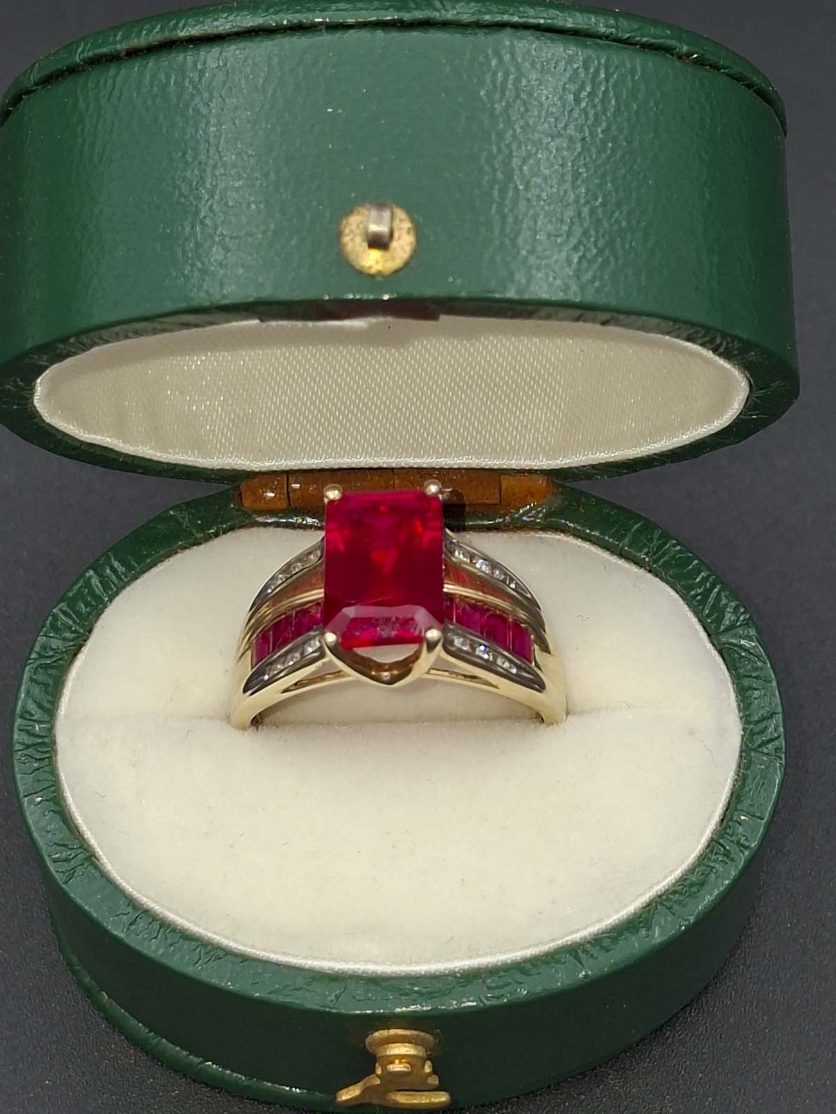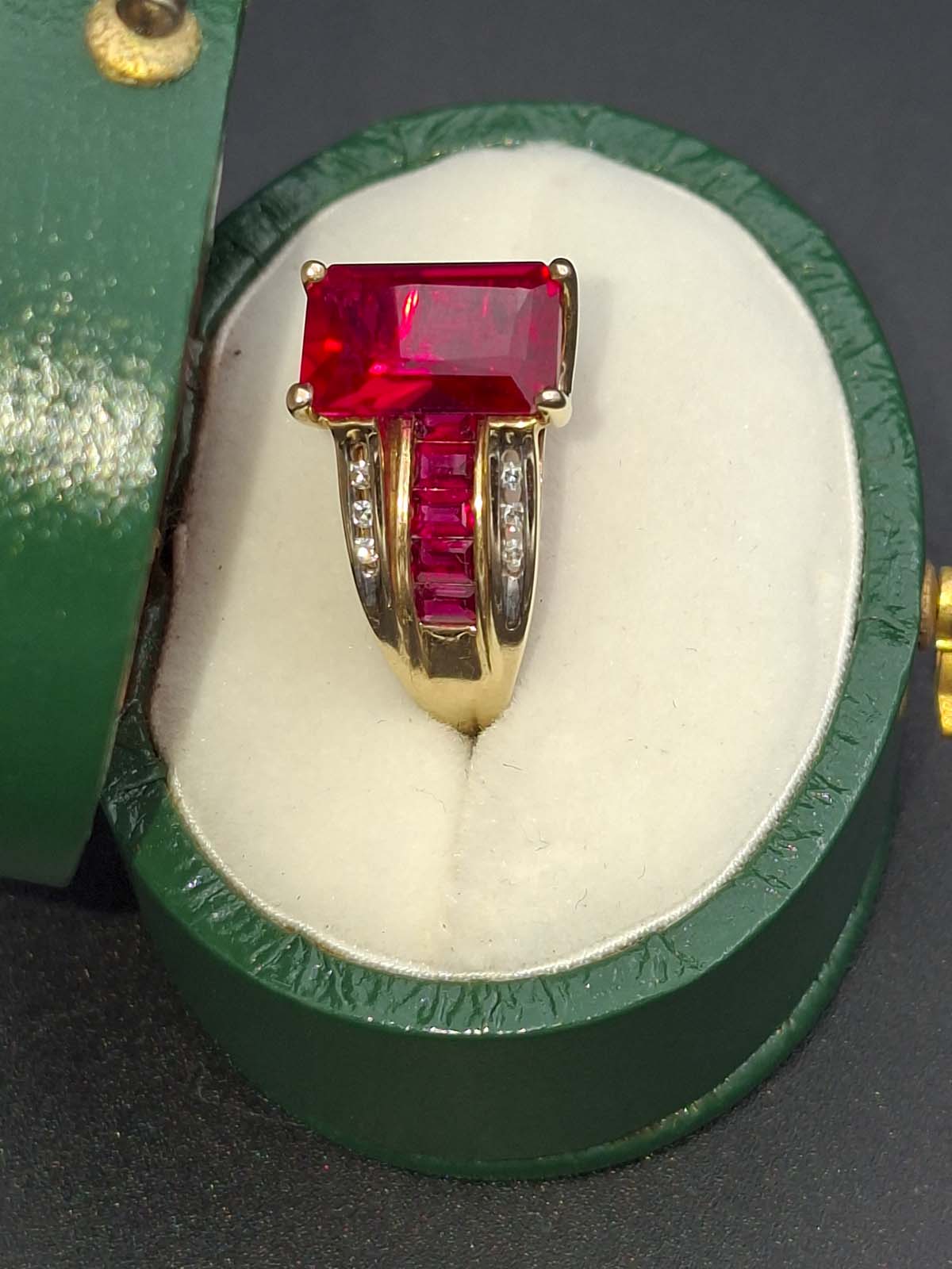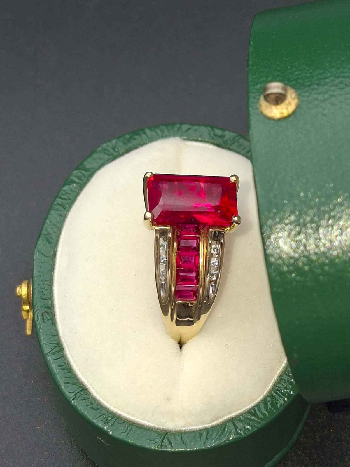 Selling here is an absolutely stunning 9ct gold synthetic ruby and diamond ring. 1 synthetic ruby approximately 10.92×7.05 X 4.5mm emerald shape mixed cut, calculated approximately 3.50ct. 10 syntheti
