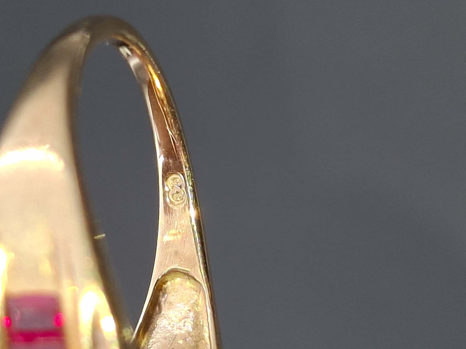 Selling here is an absolutely stunning 9ct gold synthetic ruby and diamond ring. 1 synthetic ruby approximately 10.92×7.05 X 4.5mm emerald shape mixed cut, calculated approximately 3.50ct. 10 synthetic rubies approximately 2.90×2.00 X 1.15-1.35mm baguette cut, calculated approximately .75ct total. Rubies are bright red stpR 6/5. 12 diamonds approximately 1.15mm single cut, calculated approximately .09ct total, estimated K/L colour, SI clarity. 9ct, stamped 375, yellow gold cast flat band approximately 4.9-1.4mm tapered and 1.3-1.0mm thick forming channel set “in situ” three row shoulders tapered to four claw V centre setting, baguette rubies running under the centre setting, CR marked inside the band. Total weight approximately 4.30g Previously valued for New Replacement Value 26/5/2023 $1580.00nzd