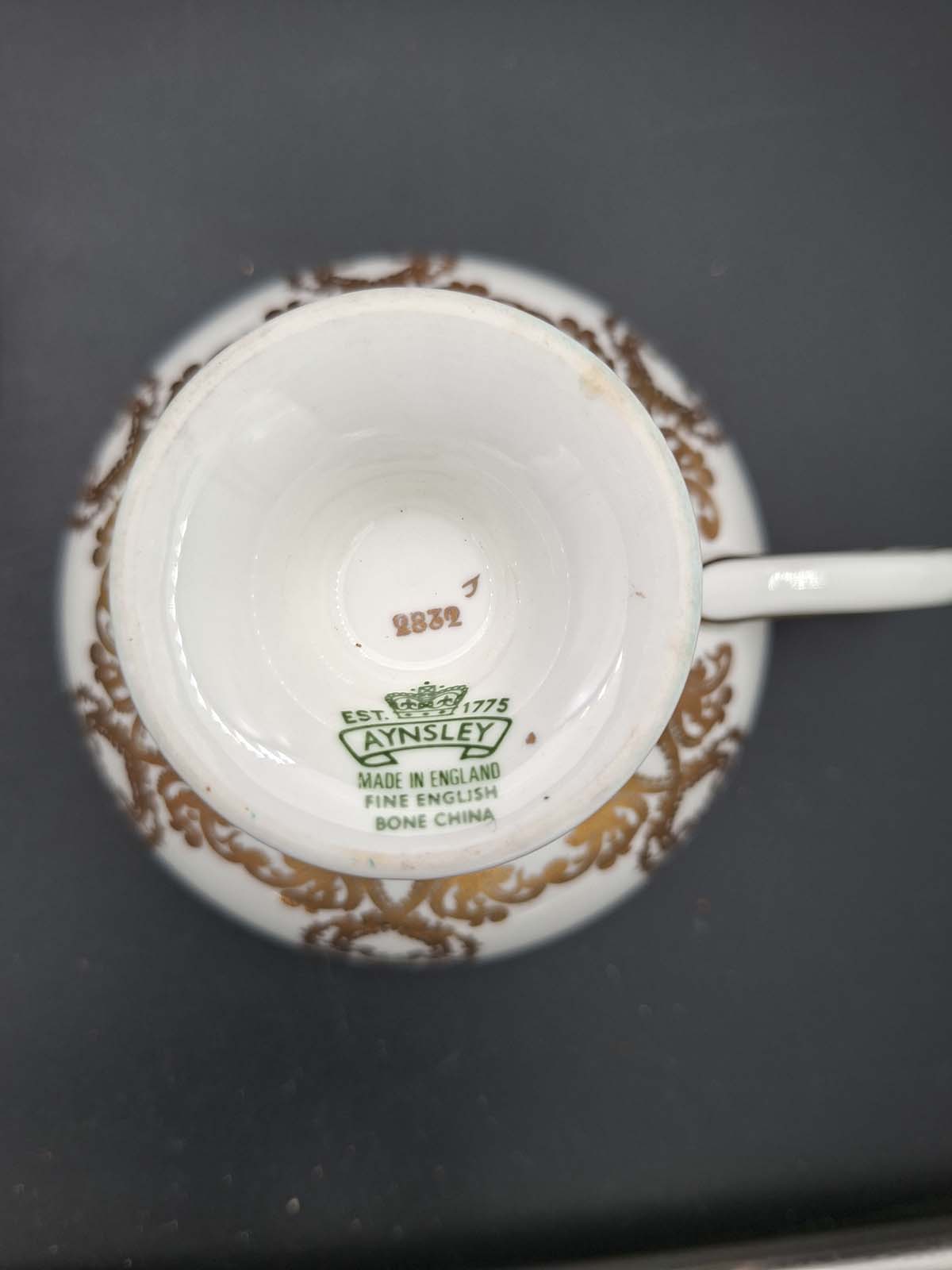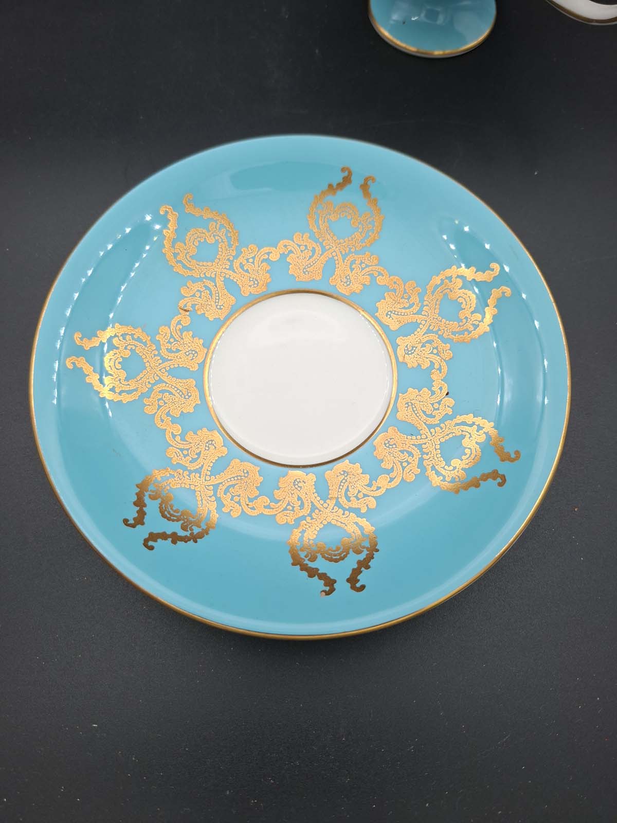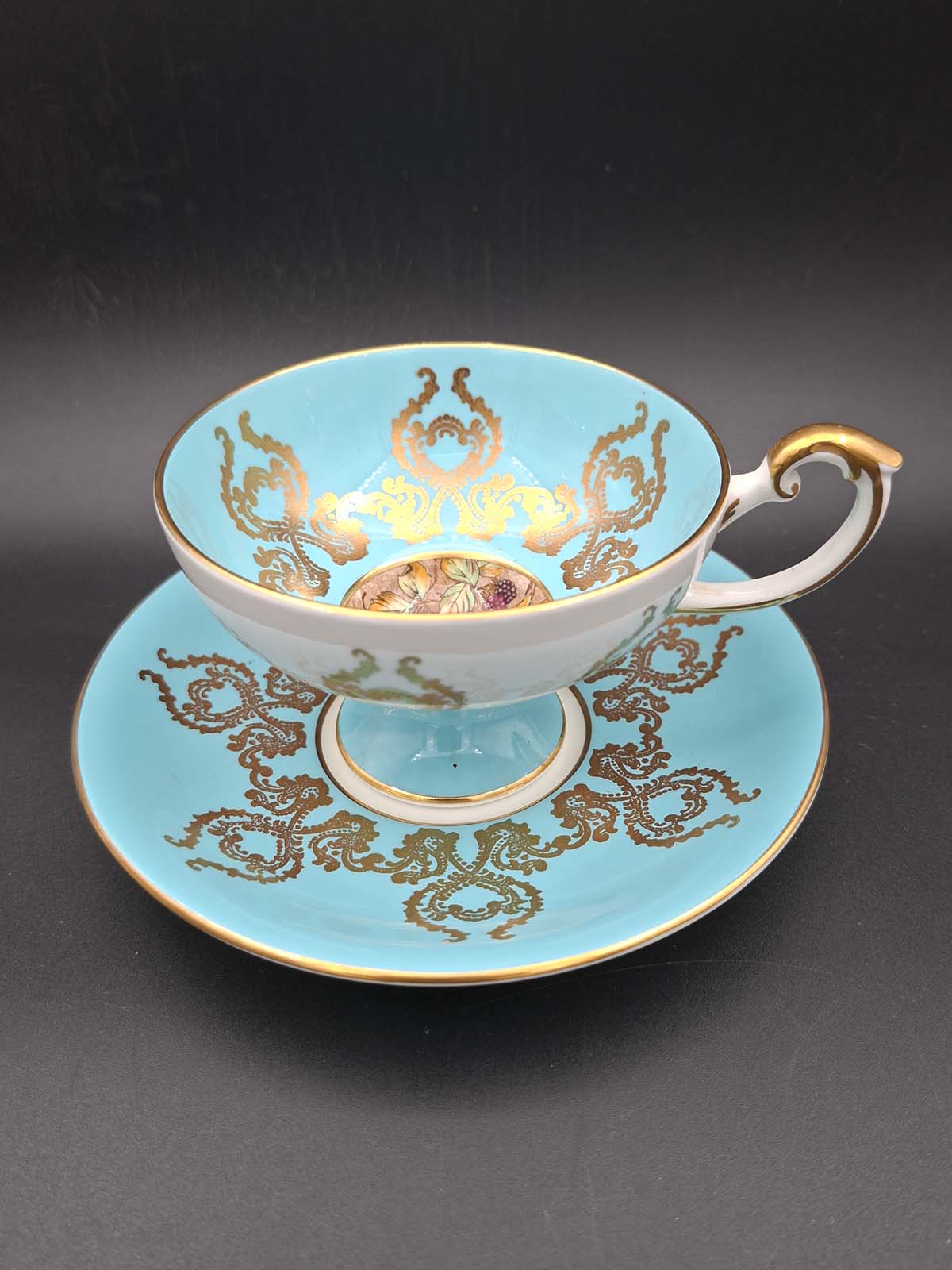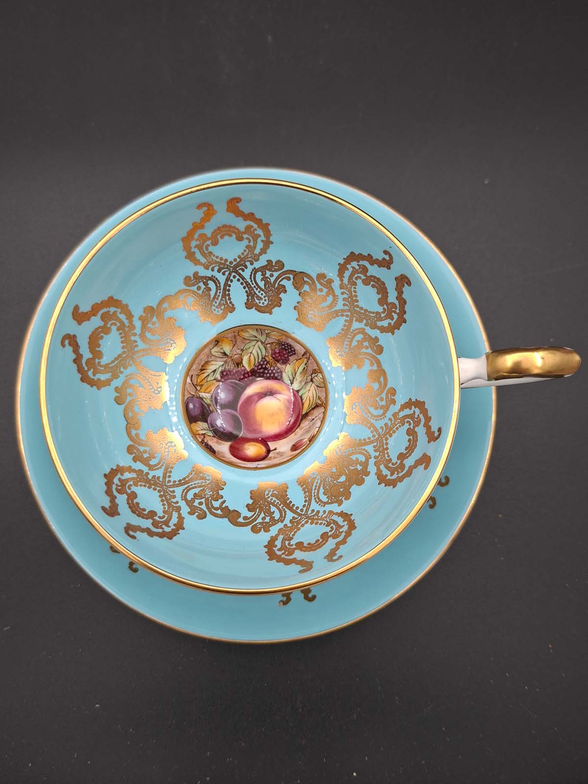 On offer here is a stunning turquoise cup and saucer in the orchard fruit design by Aynsley No. 2832.