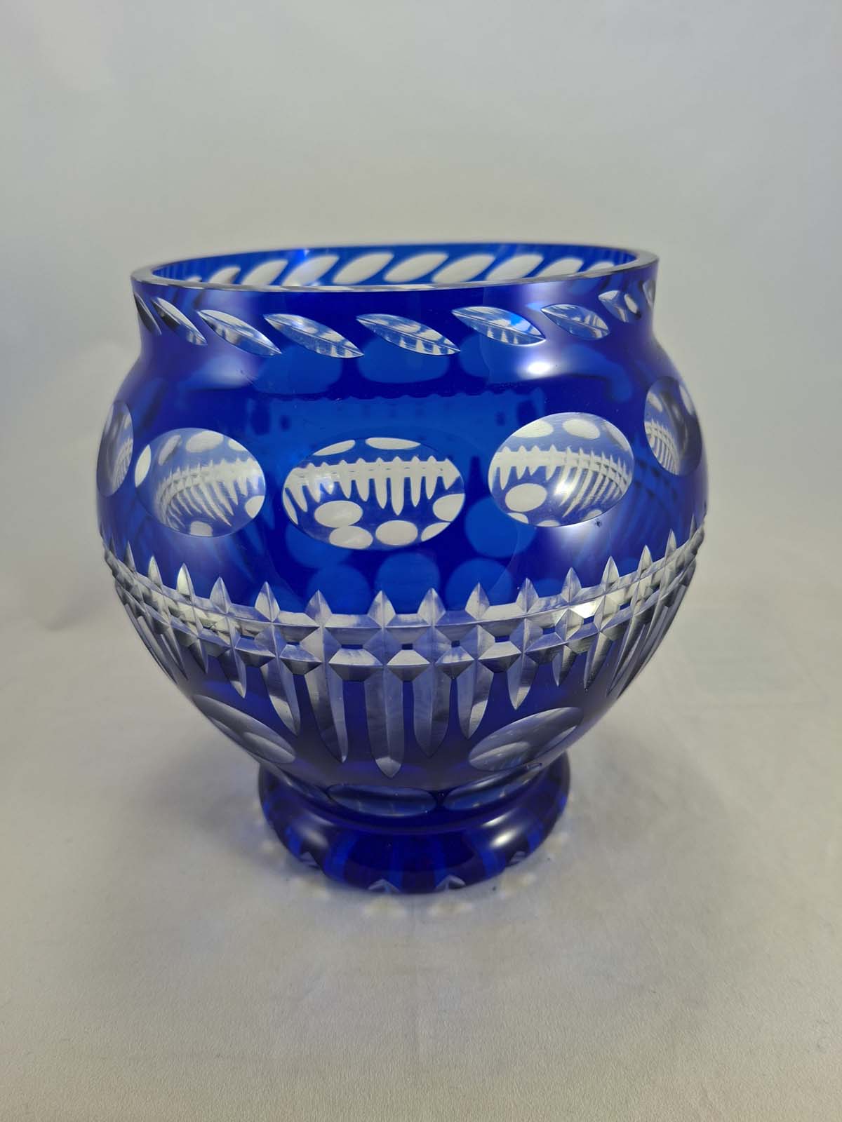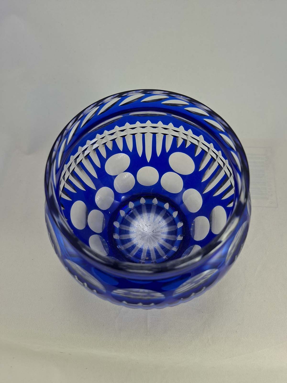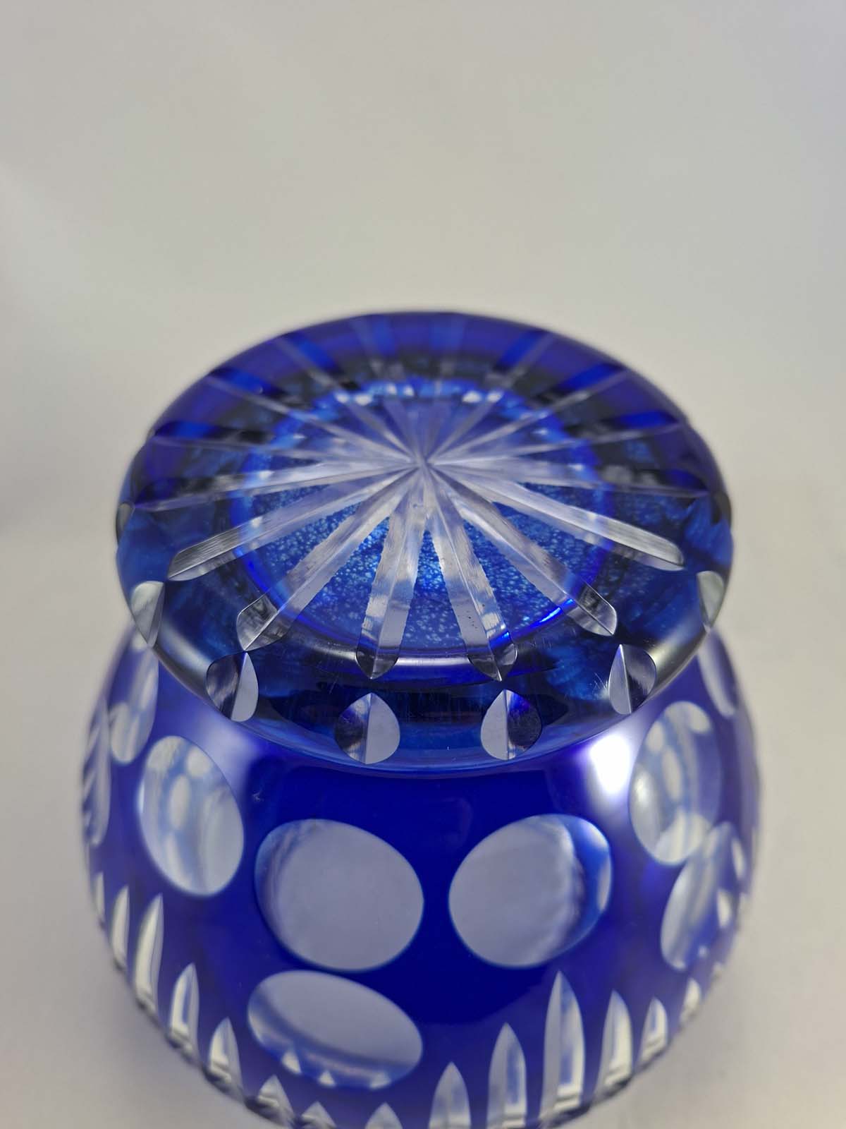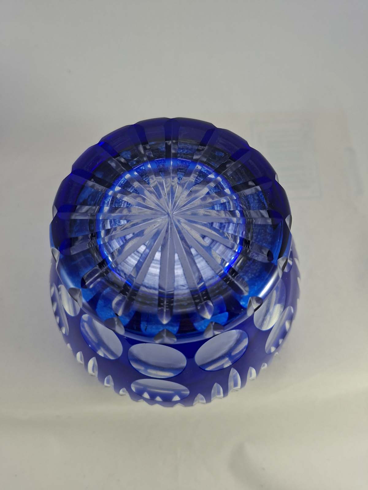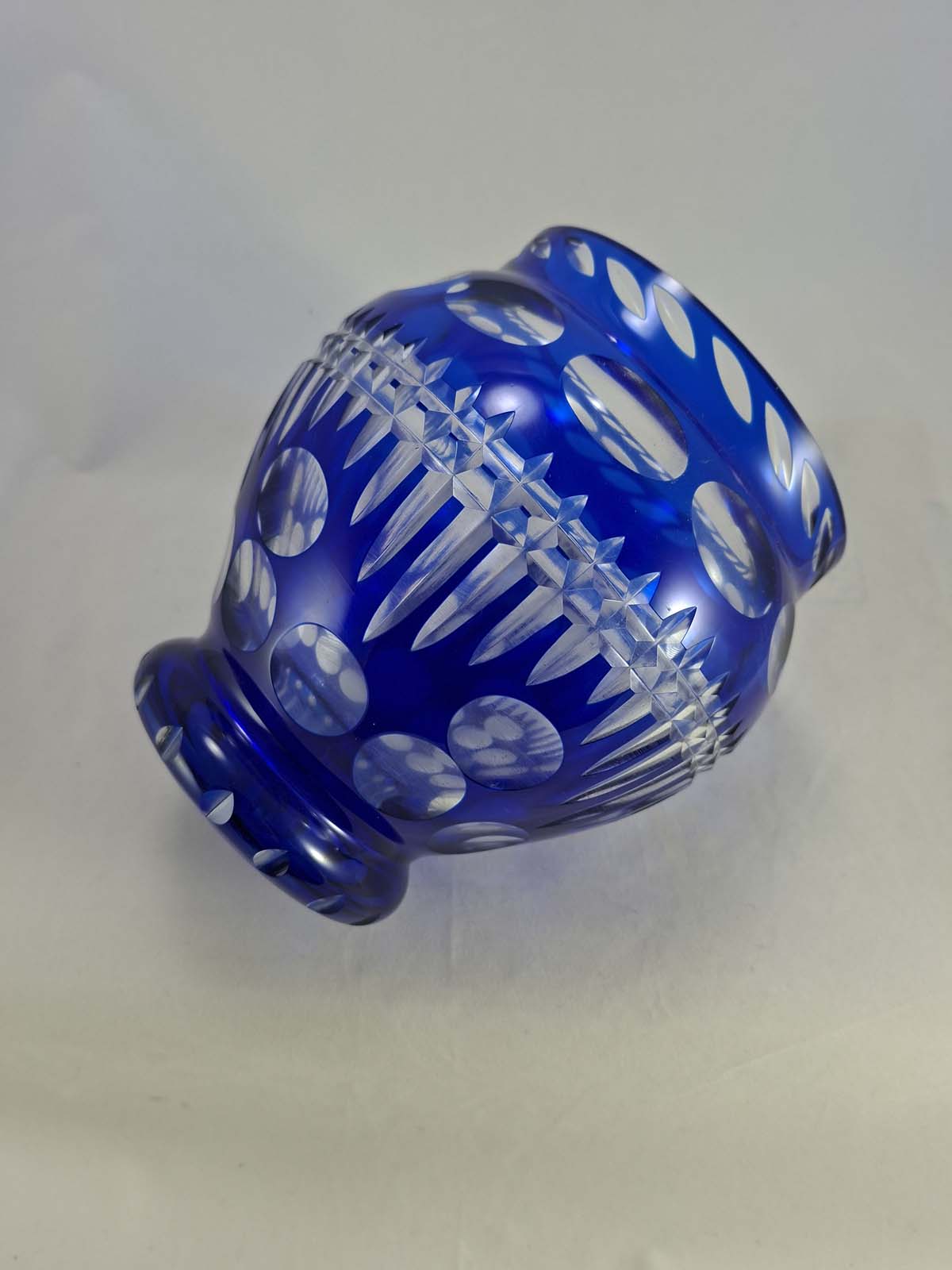 A lovely cobalt blue cut to clear glass vase with wide mouth and star cut base.