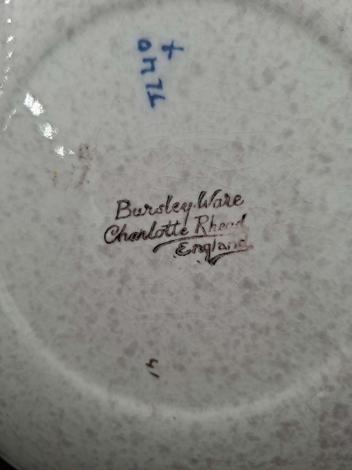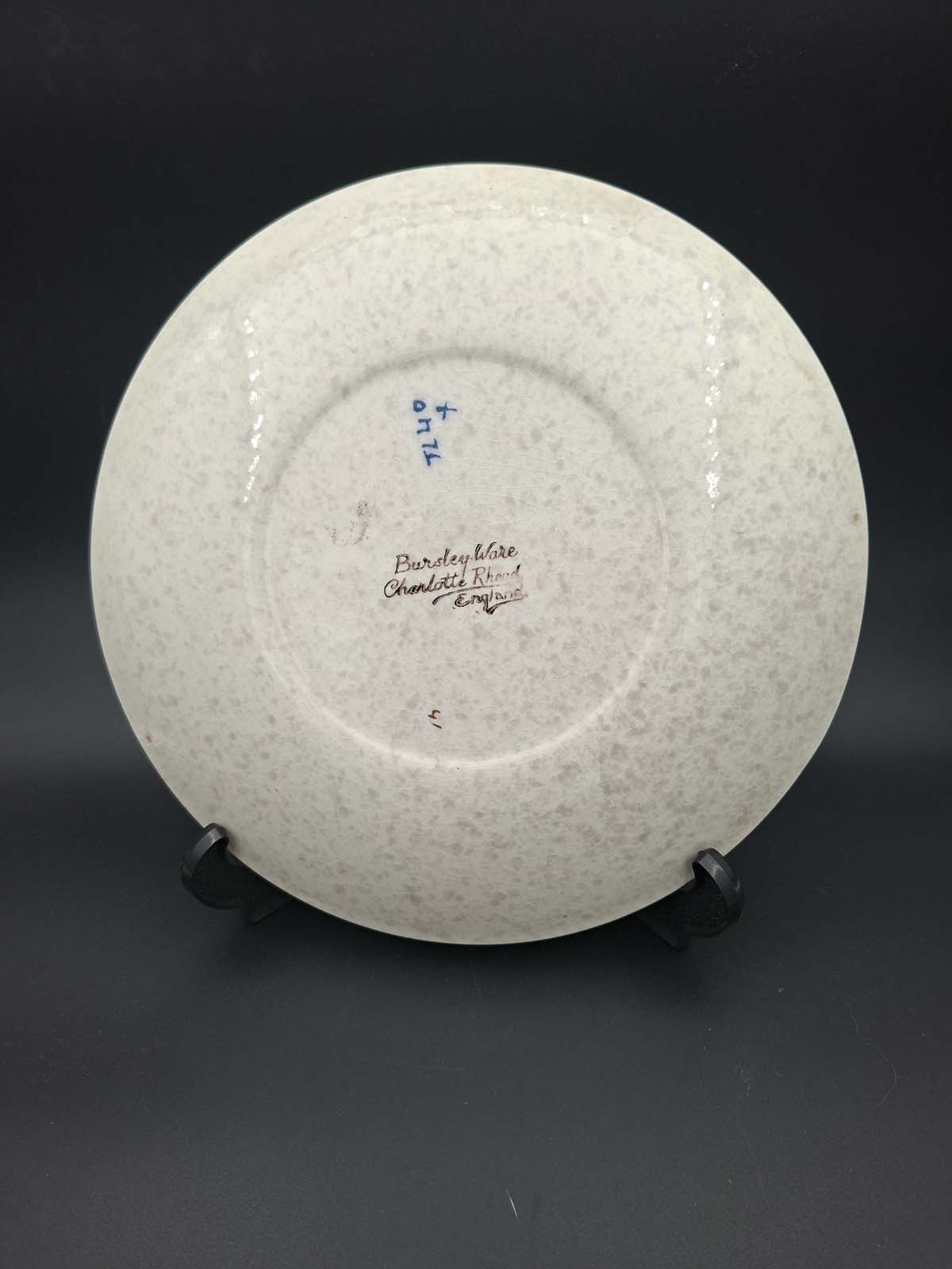 A pretty Bursley ware embossed plate by Charlotte Rhead. In a floral design with gold trim and a gold border on a mottled background.