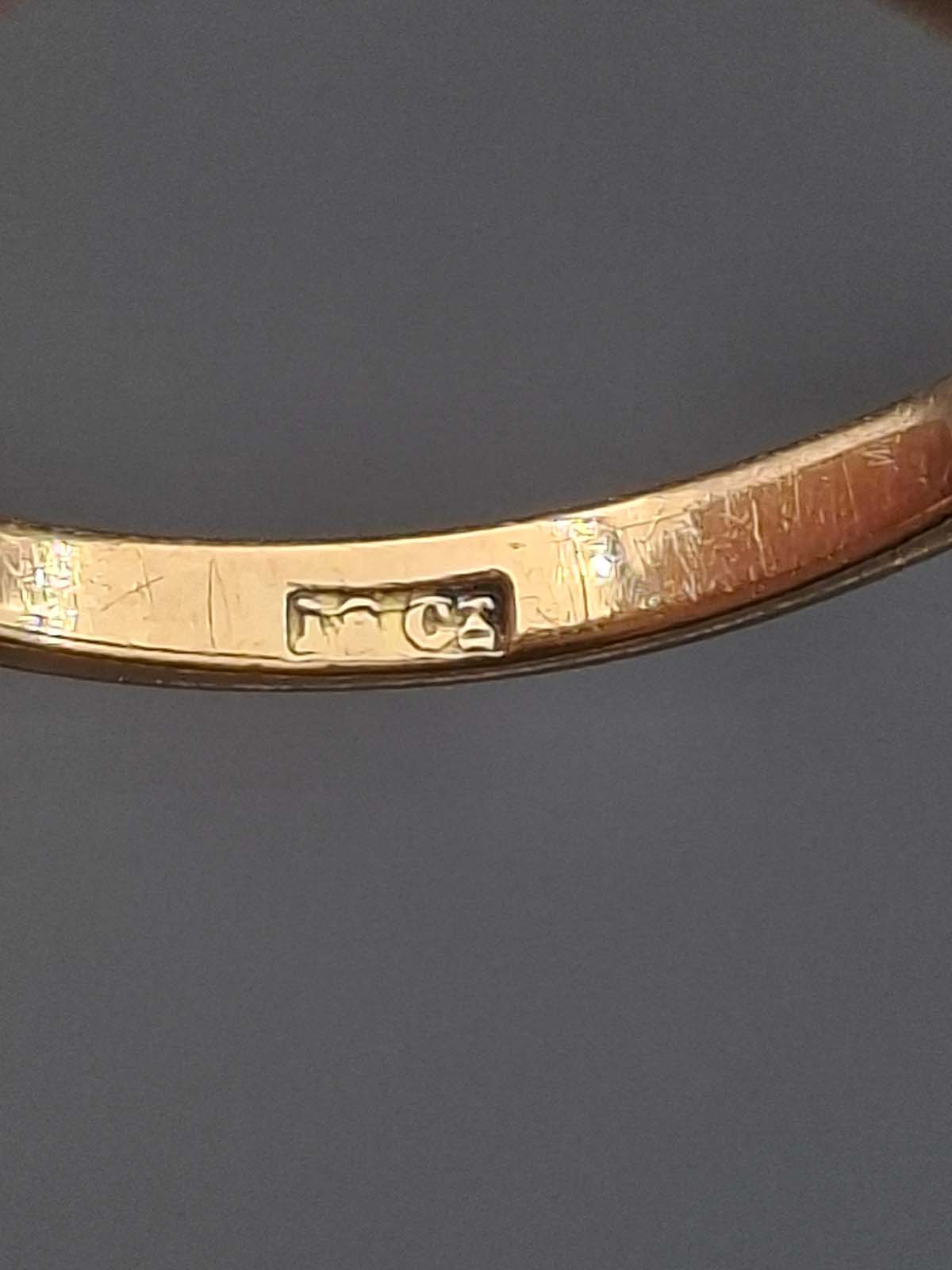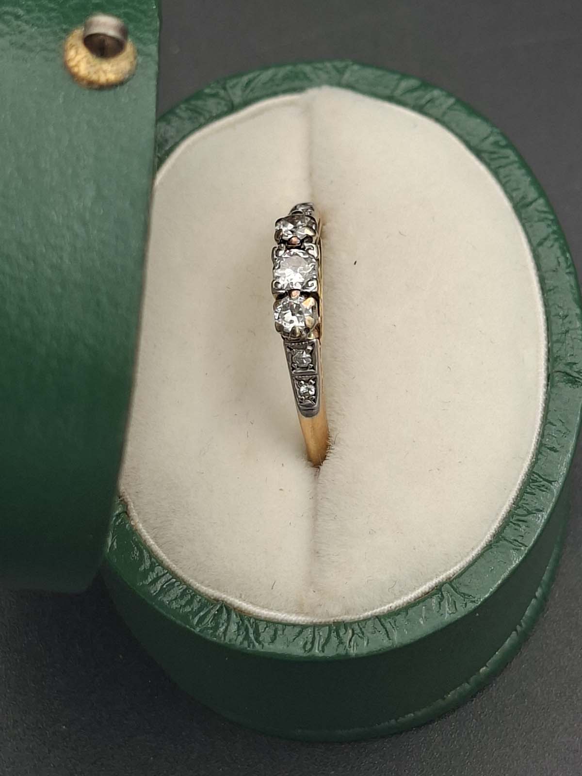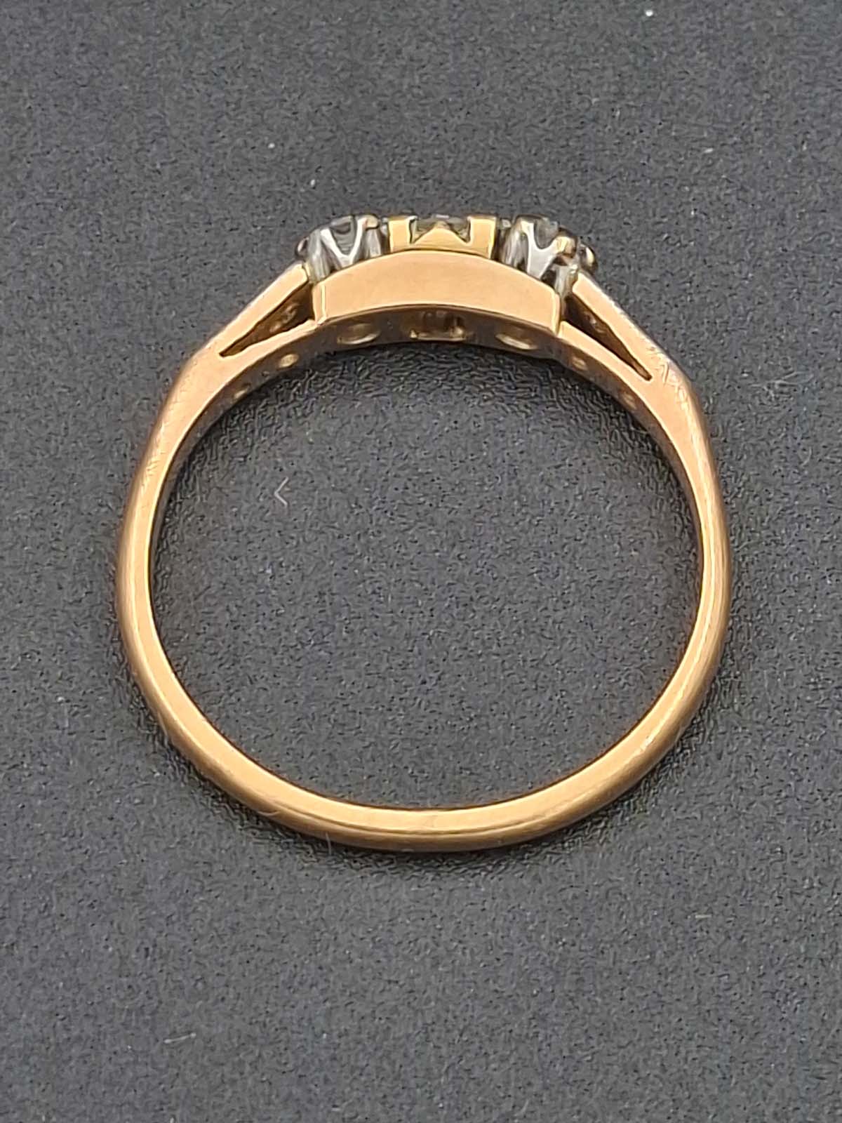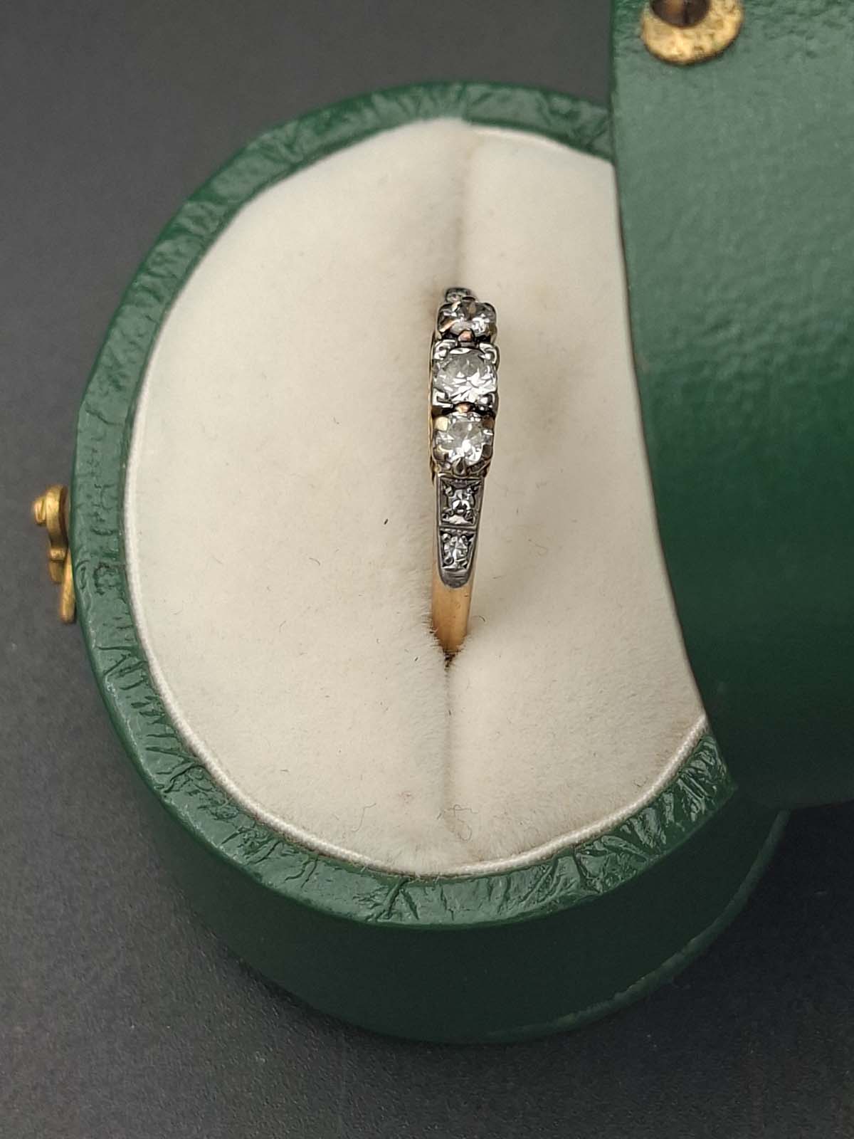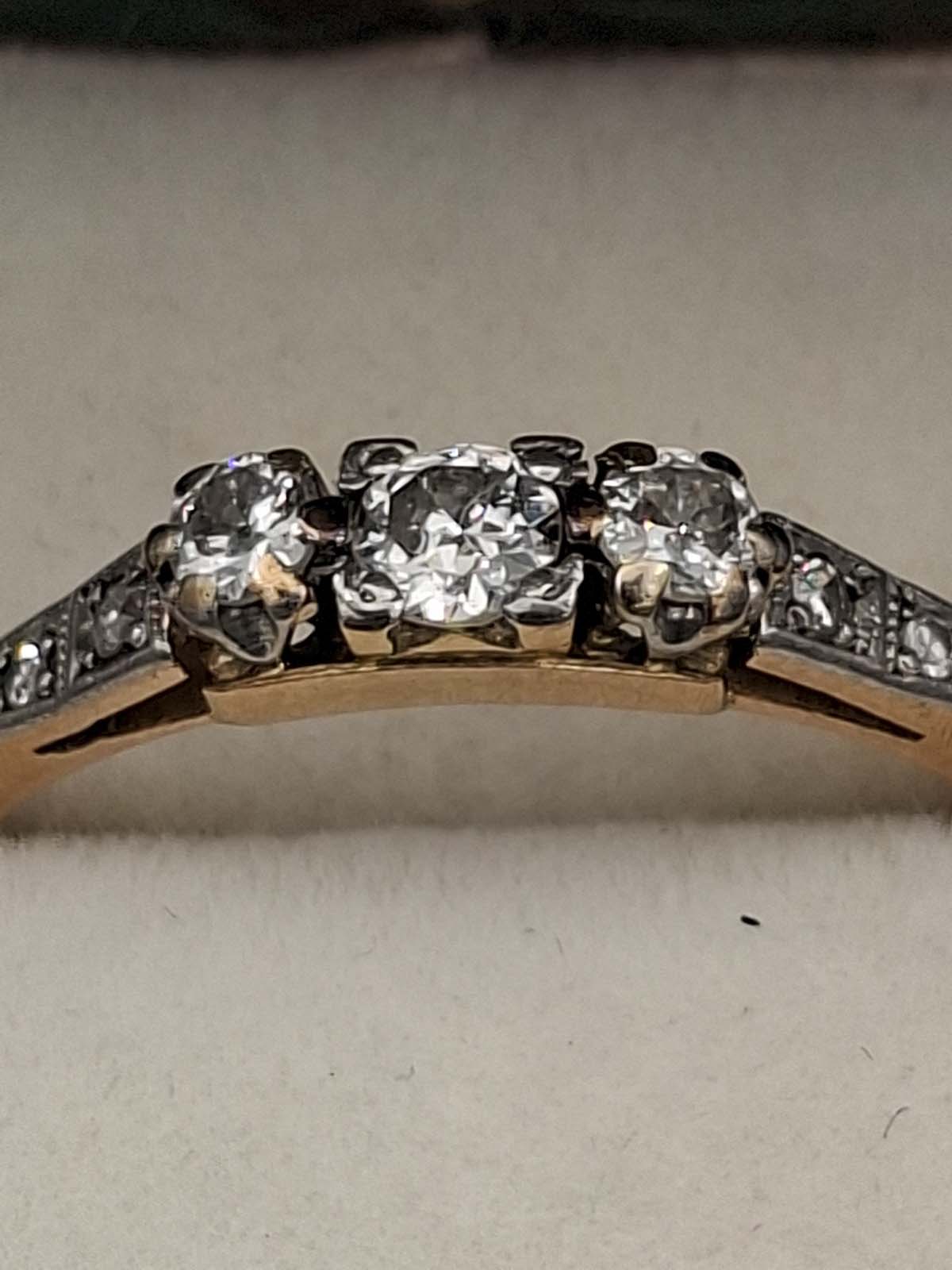 A lovely 3 stone diamond ring set in 18ct yellow gold and platinum. 1 Diamond approximately 2.59-2.63×1.45mm early modern brilliant cut with very thick bruted girdle and very large culet facet, calculated approximately .065ct, estimated G colour, SI2 clarity, scratched table and apparent heat damaged pavilion facets. 1diamond approximately 3.23-3.24×1.80mm early modern brilliant cut with very thick bruted girdle, calculated approximately .125ct, estimated G colour, SI1 clarity. 1 diamond approximately 2.68-2.76×1.50mm early modern brilliant cut with very thick bruted girdle, calculated approximately .075ct, estimated G colour, SI2 clarity with apparent heat damaged pavilion facets. 4 diamonds approximately 1.20-1.30mm single cut, calculated approximately .04ct total, estimated G/H colour, SI clarity. 18ct, tested, yellow gold handmade rounded band approximately 2.0-1.7mm tapered and 1.7-1.3mm thick forming slightly tapered shoulders, hand assembled underbezels to side settings and outer rails to handmade four claw box centre setting. Platinum, stamped, hand assembled grain set tops to four claw setting, six claw rex side settings and grain set box tops to shoulders. Previously valued for new replacement value 4/10/2023 $4200.00nzd Total weight approximately 2.55g