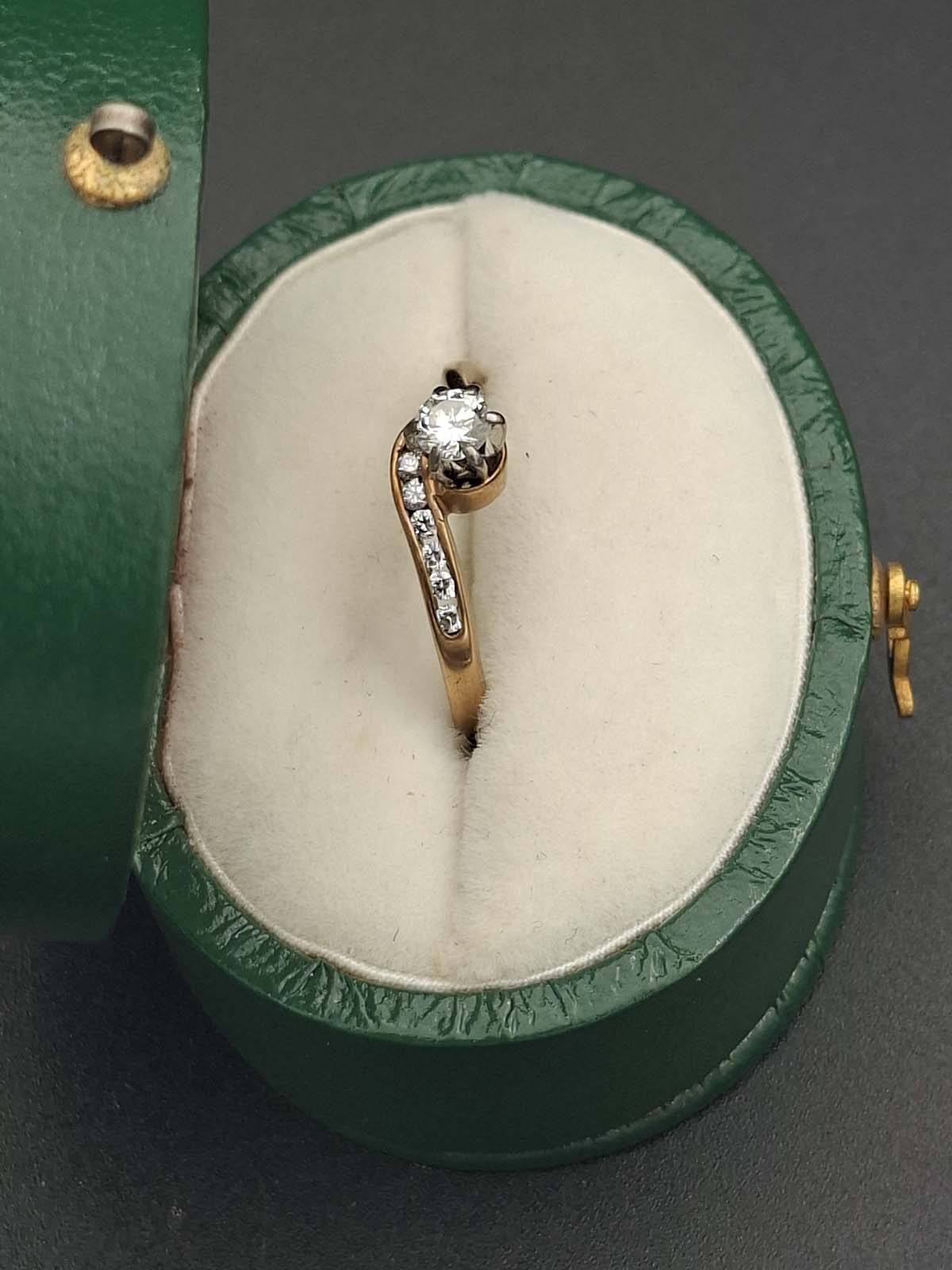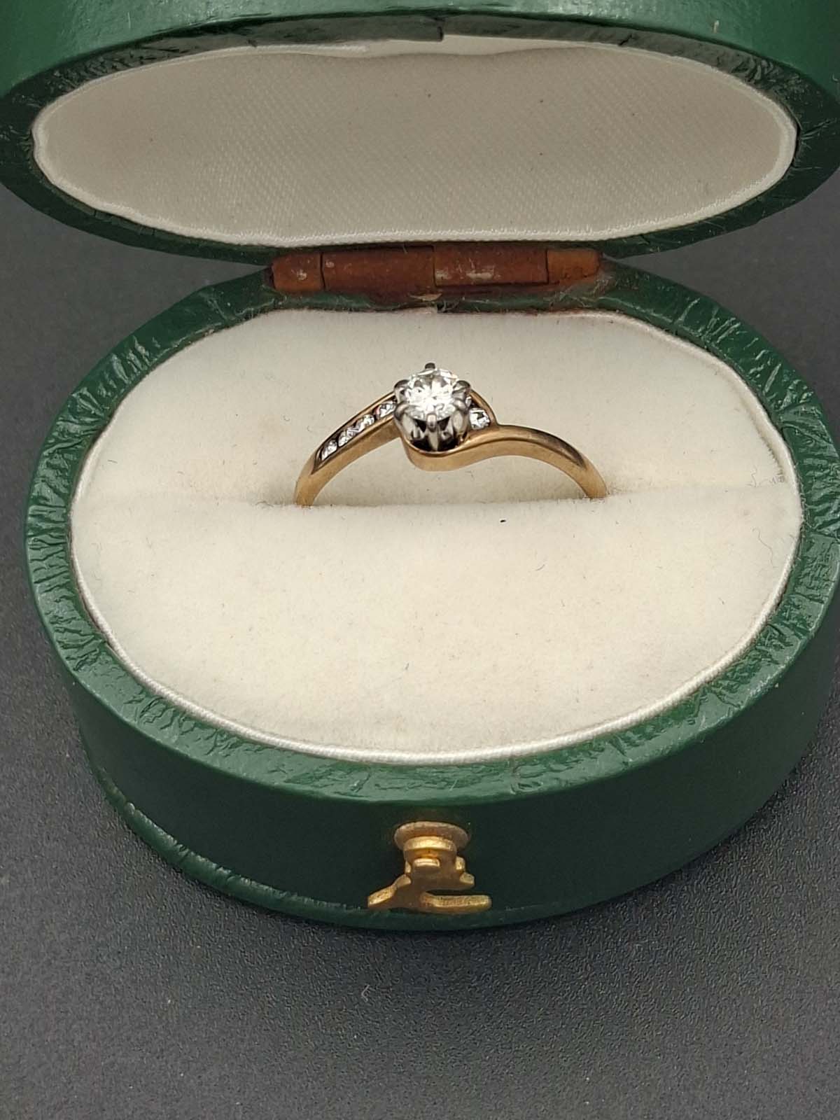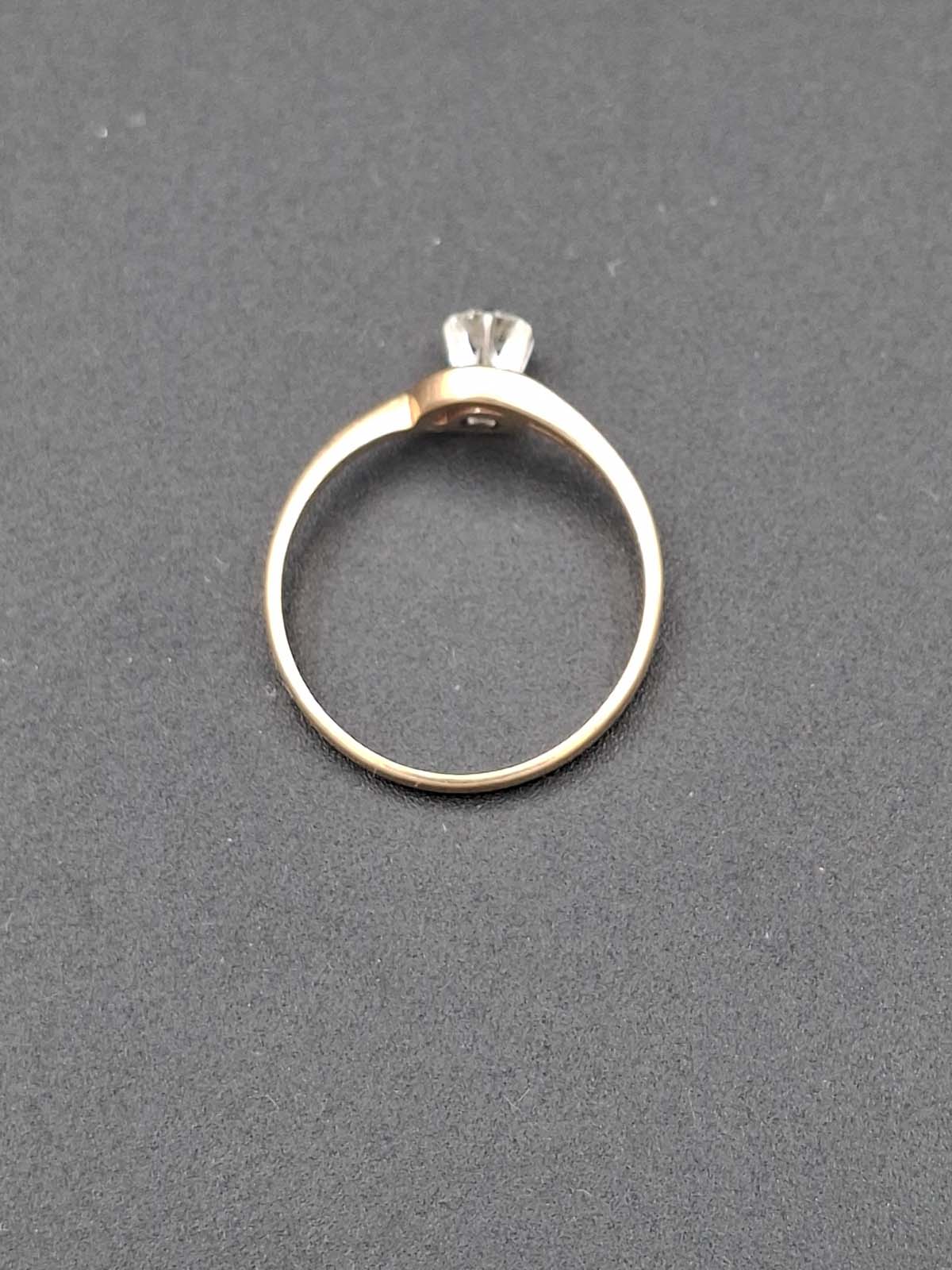 A very attractive diamond solitaire ring set in a 9ct band with an 18ct gold claw setting. 1 diamond approximately 3.62-3.66×2.30(estimated)mm round brilliant cut, setting restricts accurate depth measurement, calculated approximately .19ct, estimated I colour, VS2 clarity, good cut. 8 diamonds approximately 1.40-1.45mm round brilliant cut, calculated approximately .11ct total, estimated G/H colour, SI clarity. 9ct, stamped, yellow gold cast rounded band approximately 2.1-1.7-1.3mm tapered and 1.3-0.7-1.3mm thick starting with channel set wrap around top and finishing with knife edge wrap around shoulder and underbezel. 18ct, tested, white gold six claw V setting fitted inside underbezel. Total weight approximately 1.54g Previously valued for new replacement value 4/4/2023 $3490.00nzd