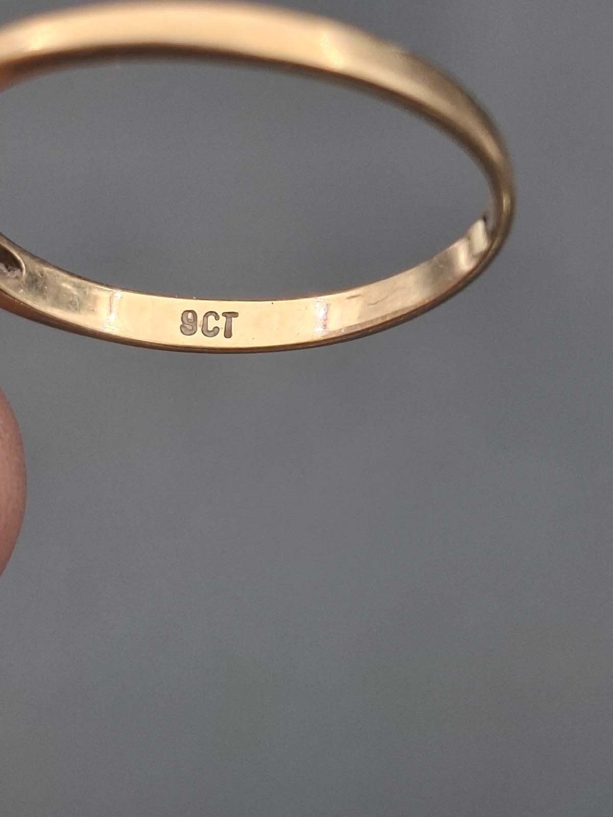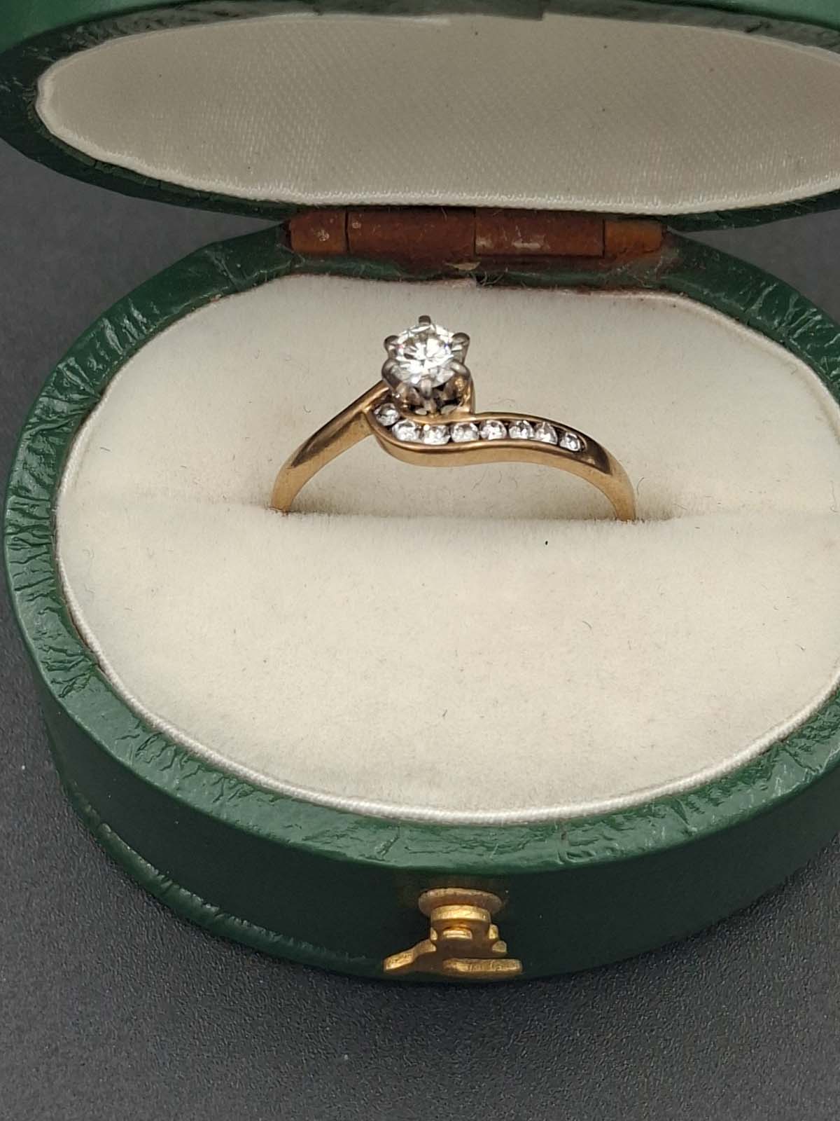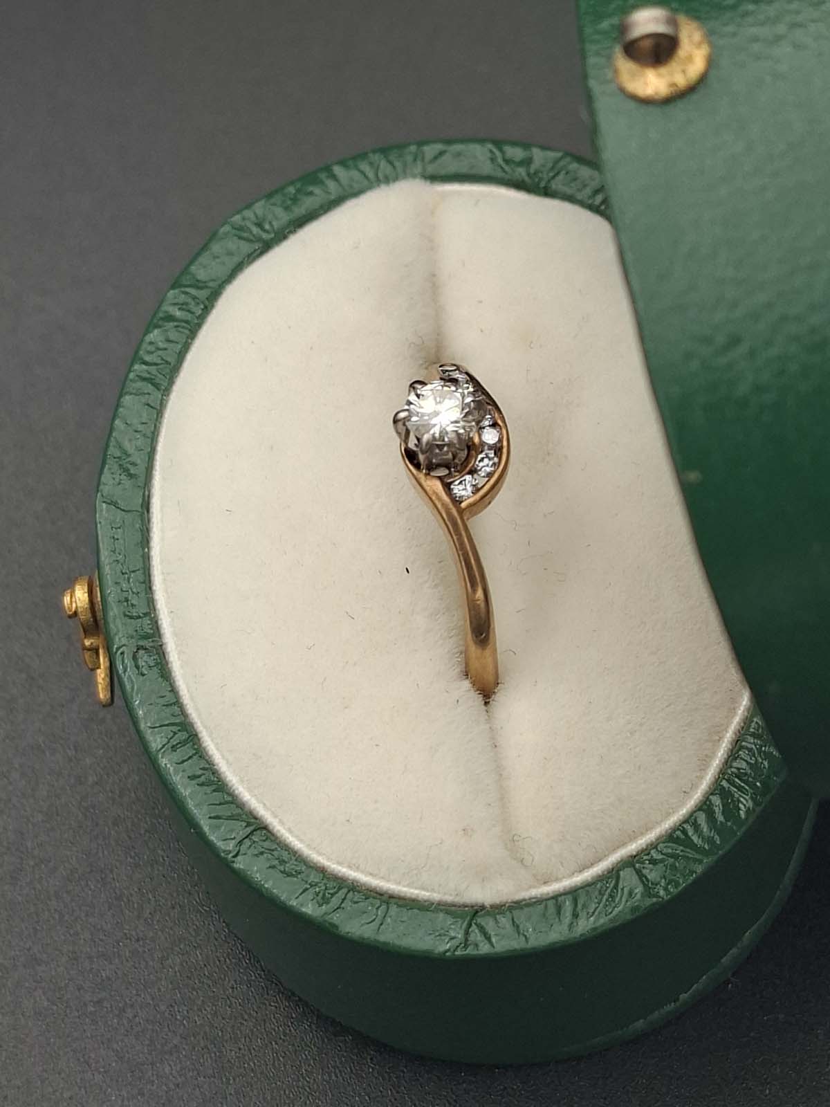 A very attractive diamond solitaire ring set in a 9ct band with an 18ct gold claw setting. 1 diamond approximately 3.62-3.66×2.30(estimated)mm round brilliant cut, setting restricts accurate depth measurement, calculated approximately .19ct, estimated I colour, VS2 clarity, good cut. 8 diamonds approximately 1.40-1.45mm round brilliant cut, calculated approximately .11ct total, estimated G/H colour, SI clarity. 9ct, stamped, yellow gold cast rounded band approximately 2.1-1.7-1.3mm tapered and 1.3-0.7-1.3mm thick starting with channel set wrap around top and finishing with knife edge wrap around shoulder and underbezel. 18ct, tested, white gold six claw V setting fitted inside underbezel. Total weight approximately 1.54g Previously valued for new replacement value 4/4/2023 $3490.00nzd