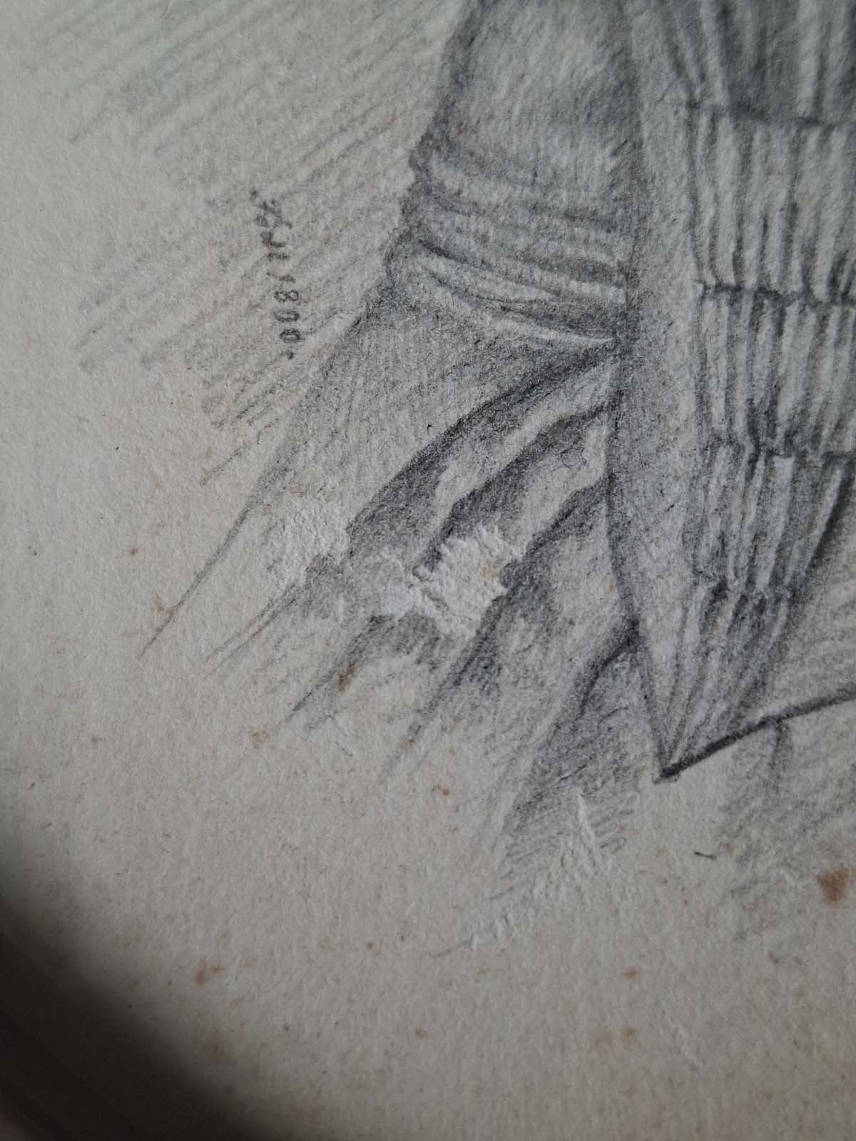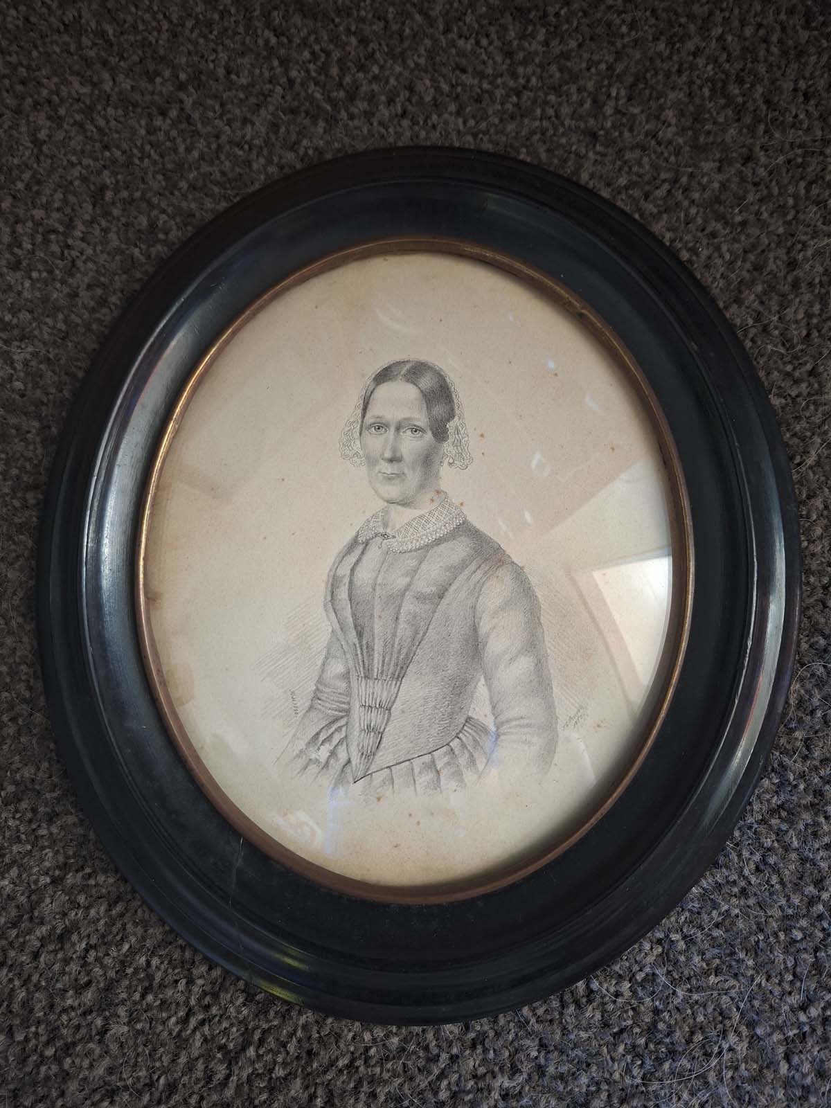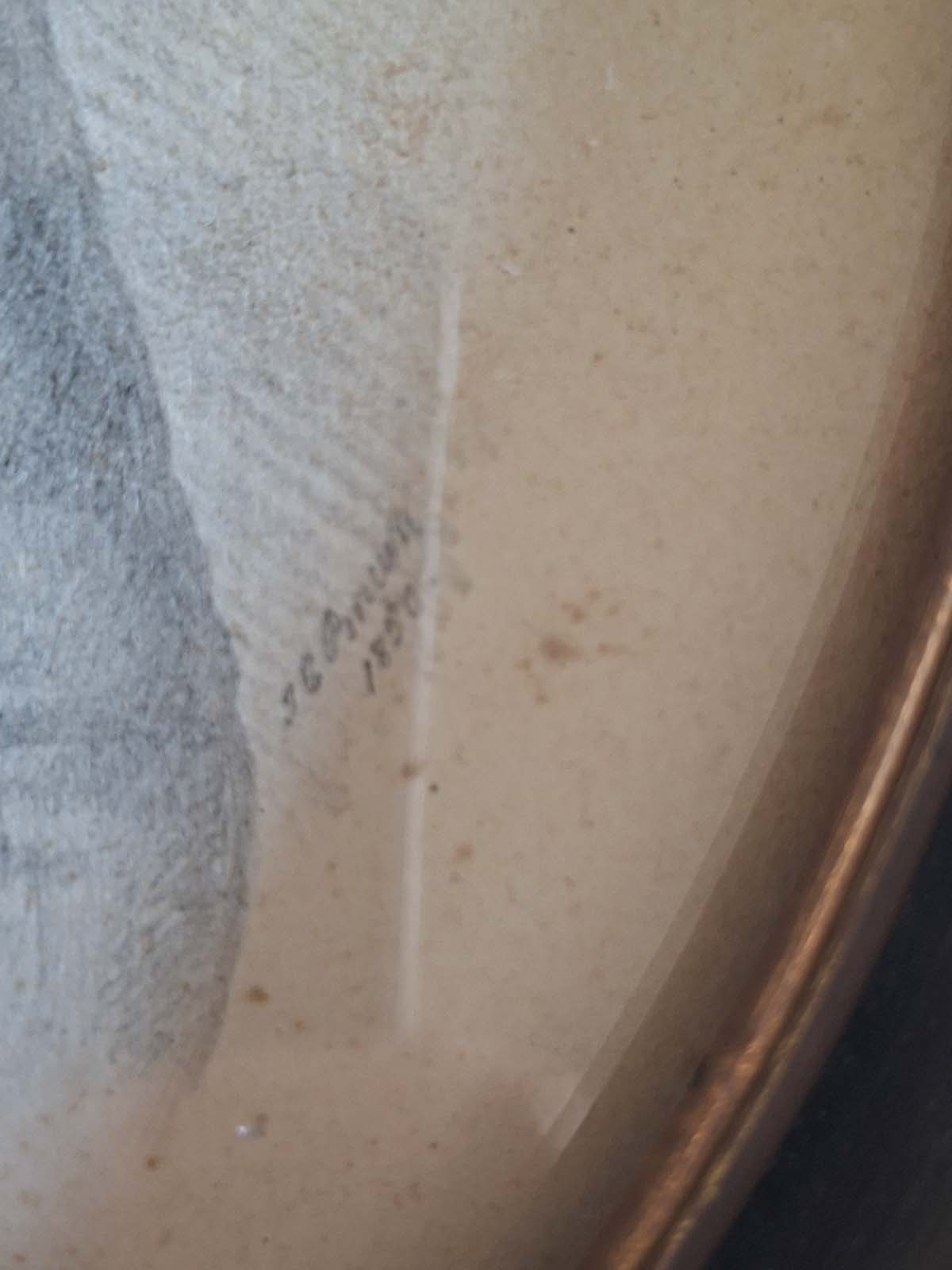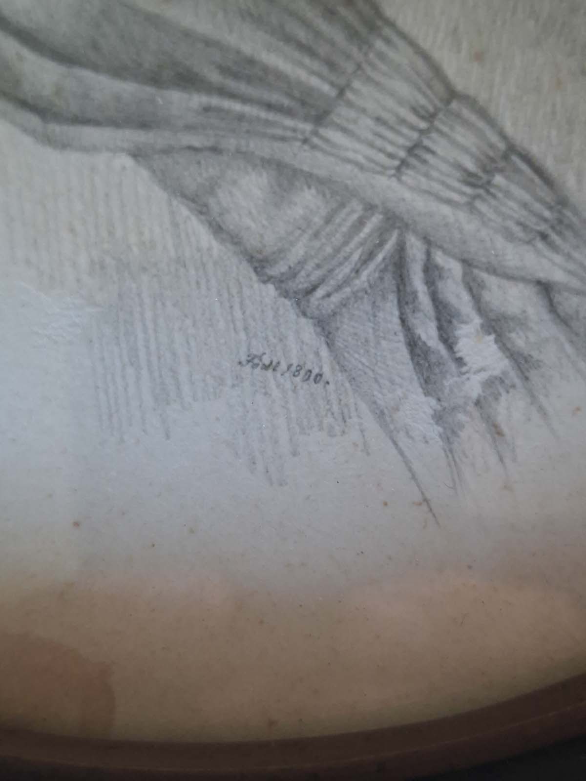 An oval framed signed pencil drawing of a lady in Victorian dress. Unable to read the signature.