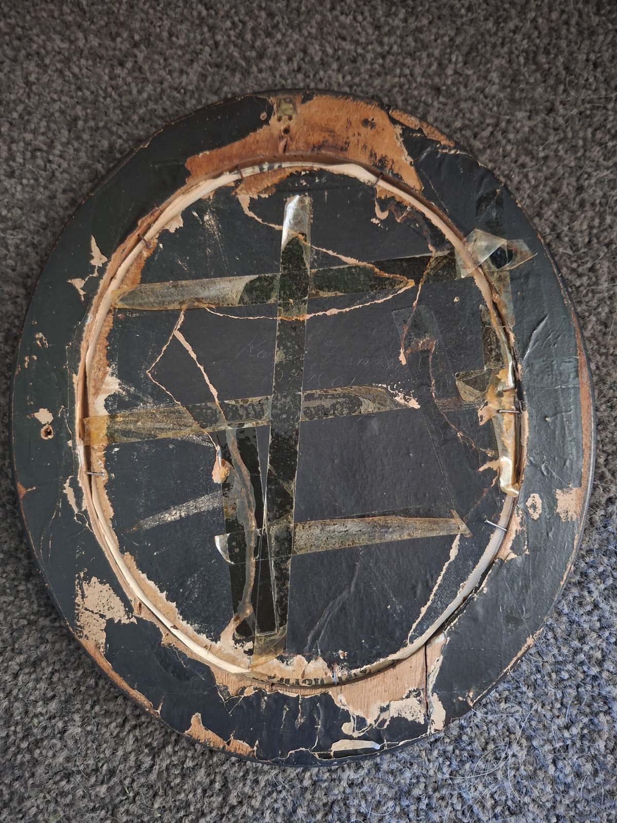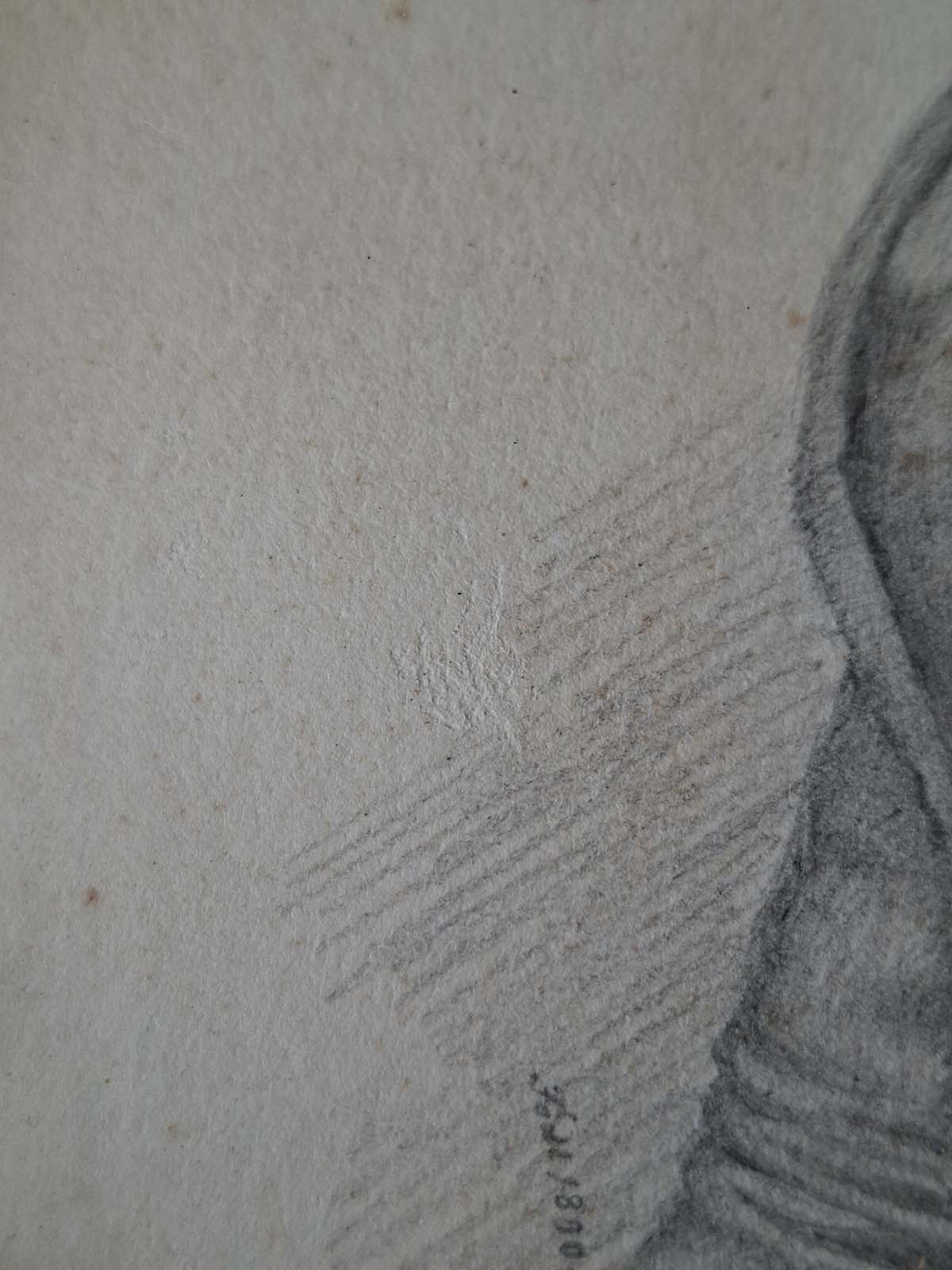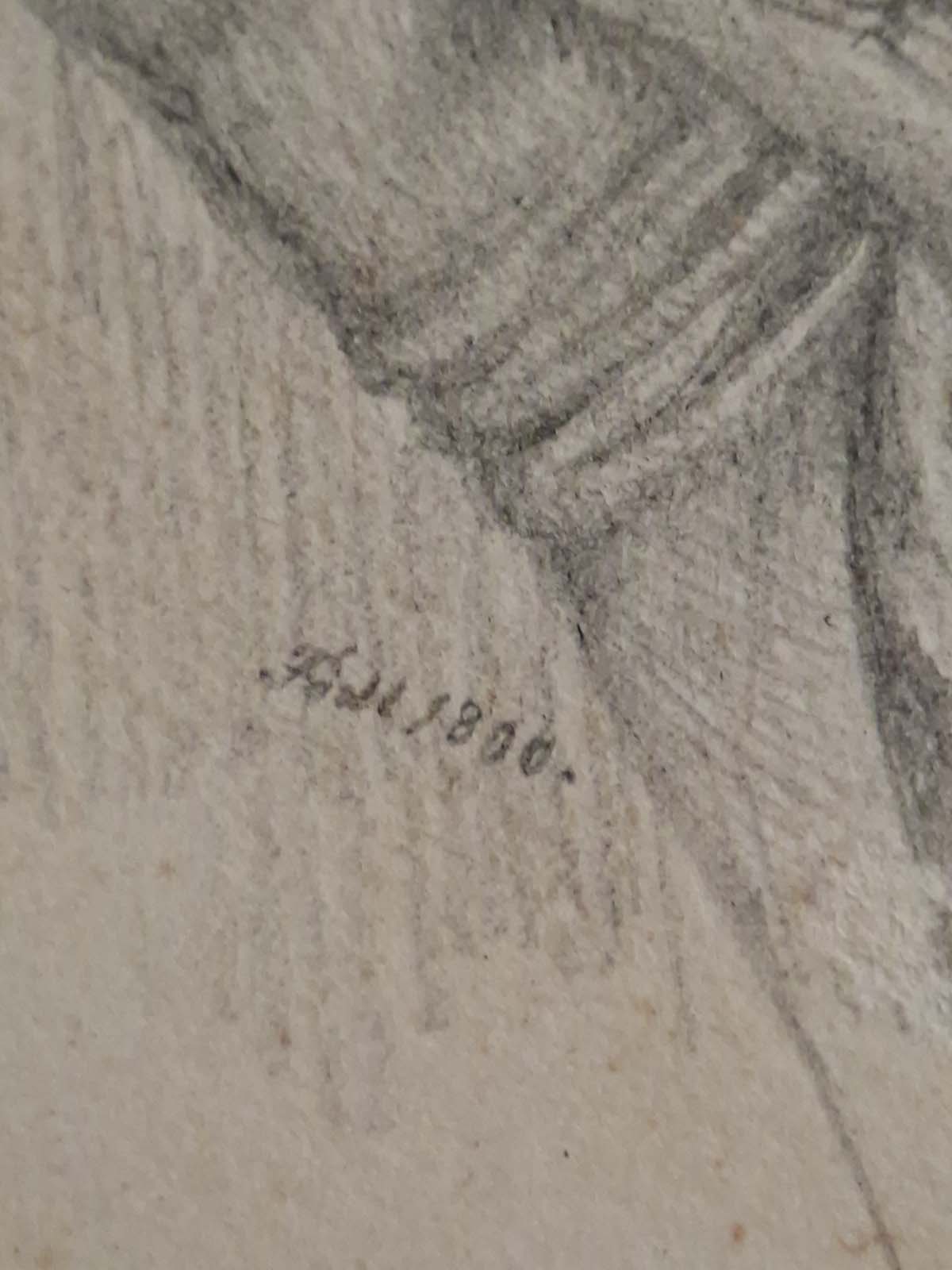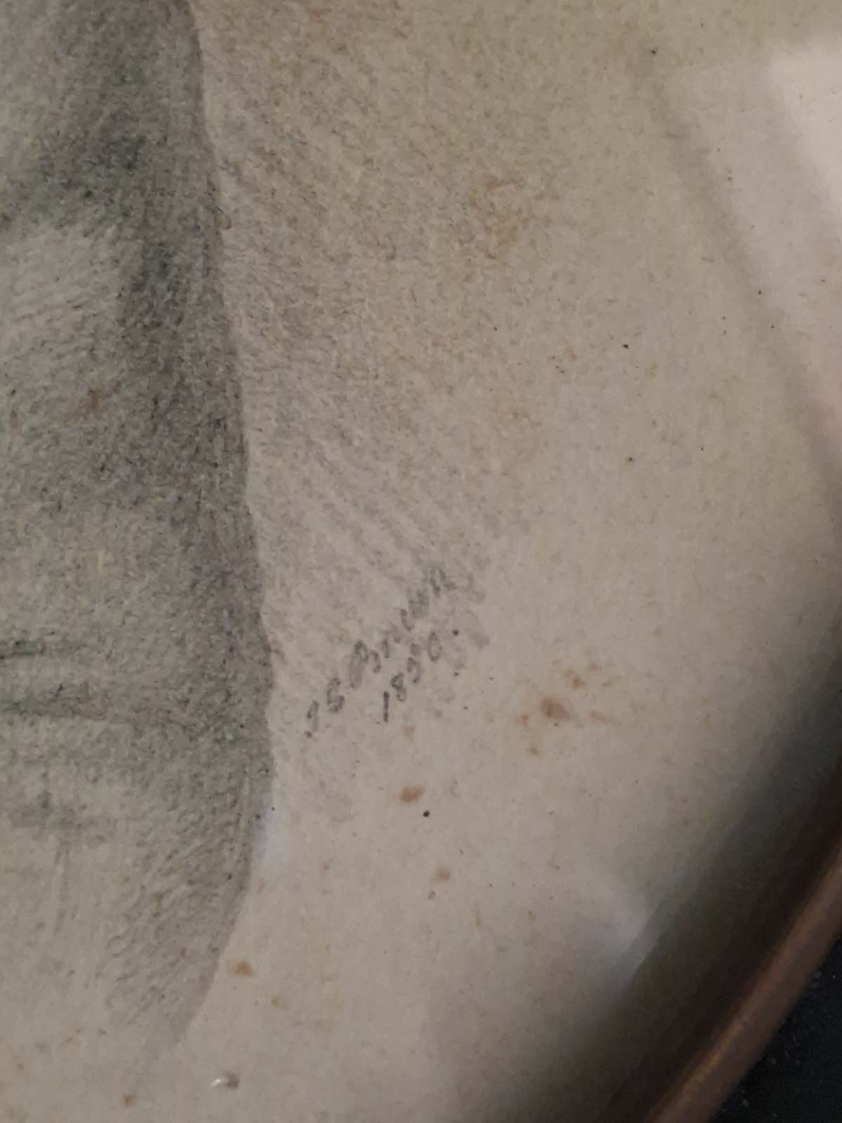 An oval framed signed pencil drawing of a lady in Victorian dress. Unable to read the signature.