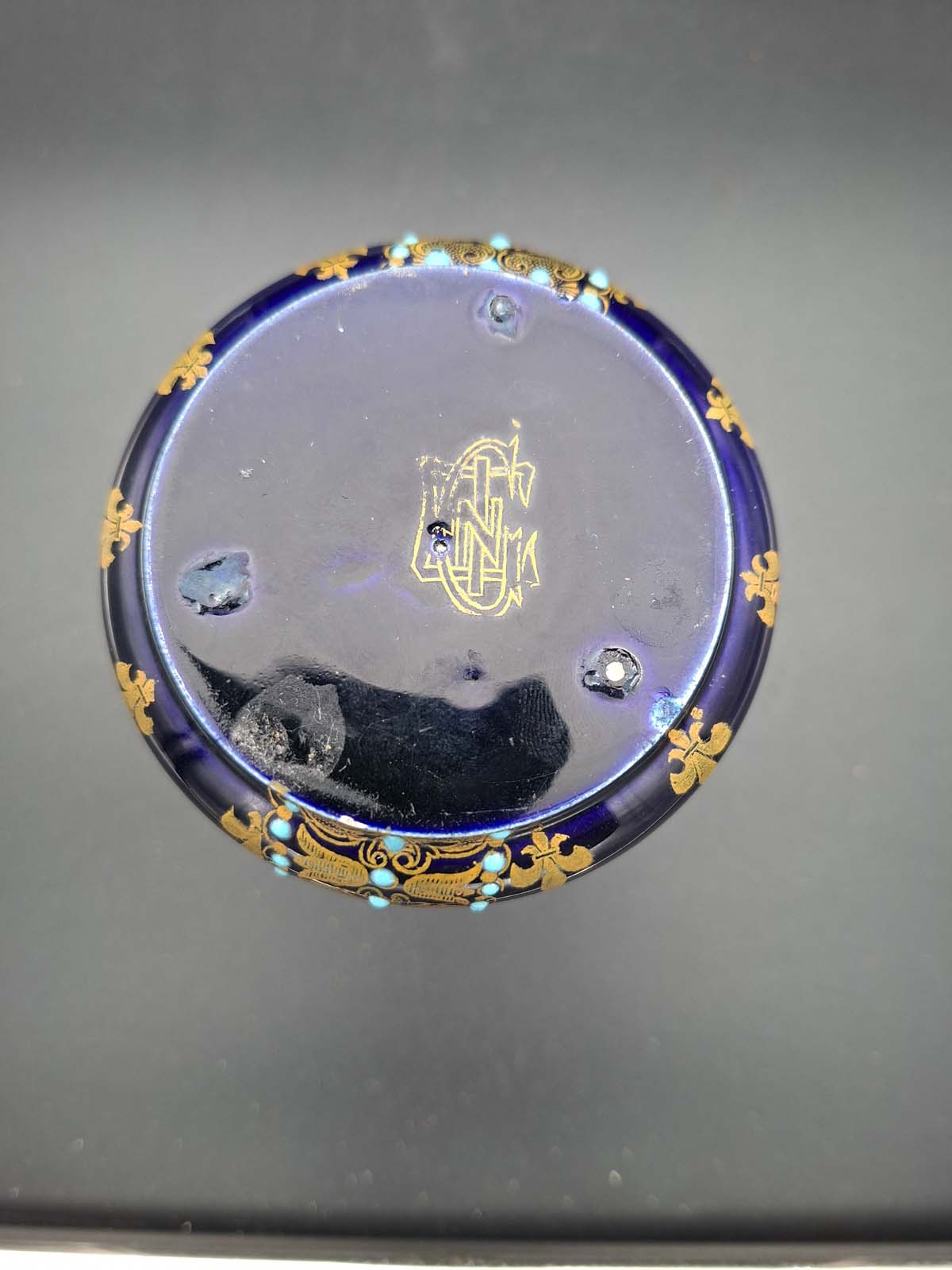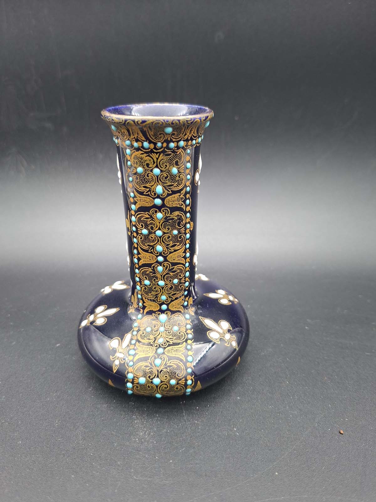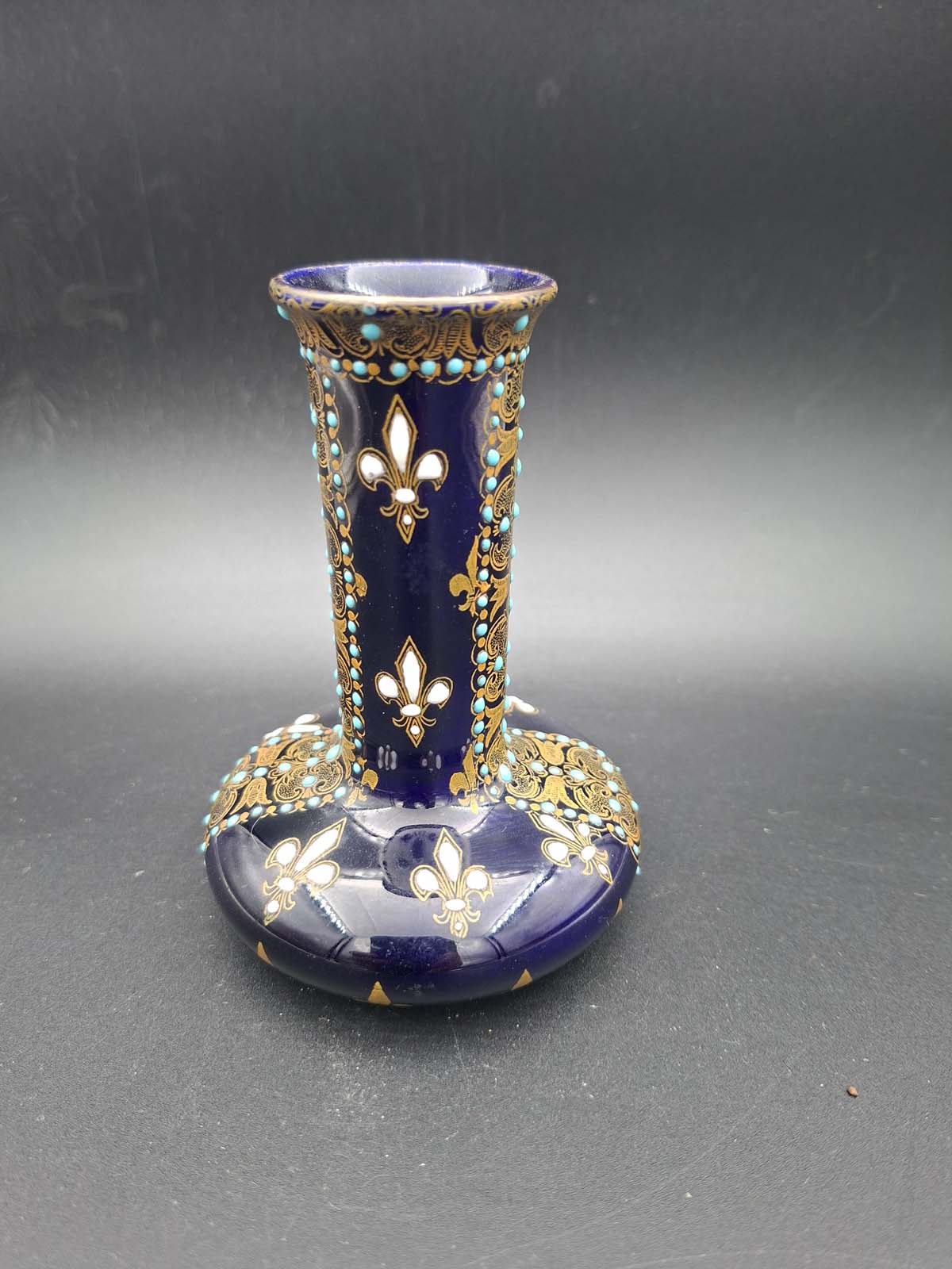 Here we have a lovely French vase in cobalt blue base with Enamel decoration to Fleur de lis and gold side decoration.