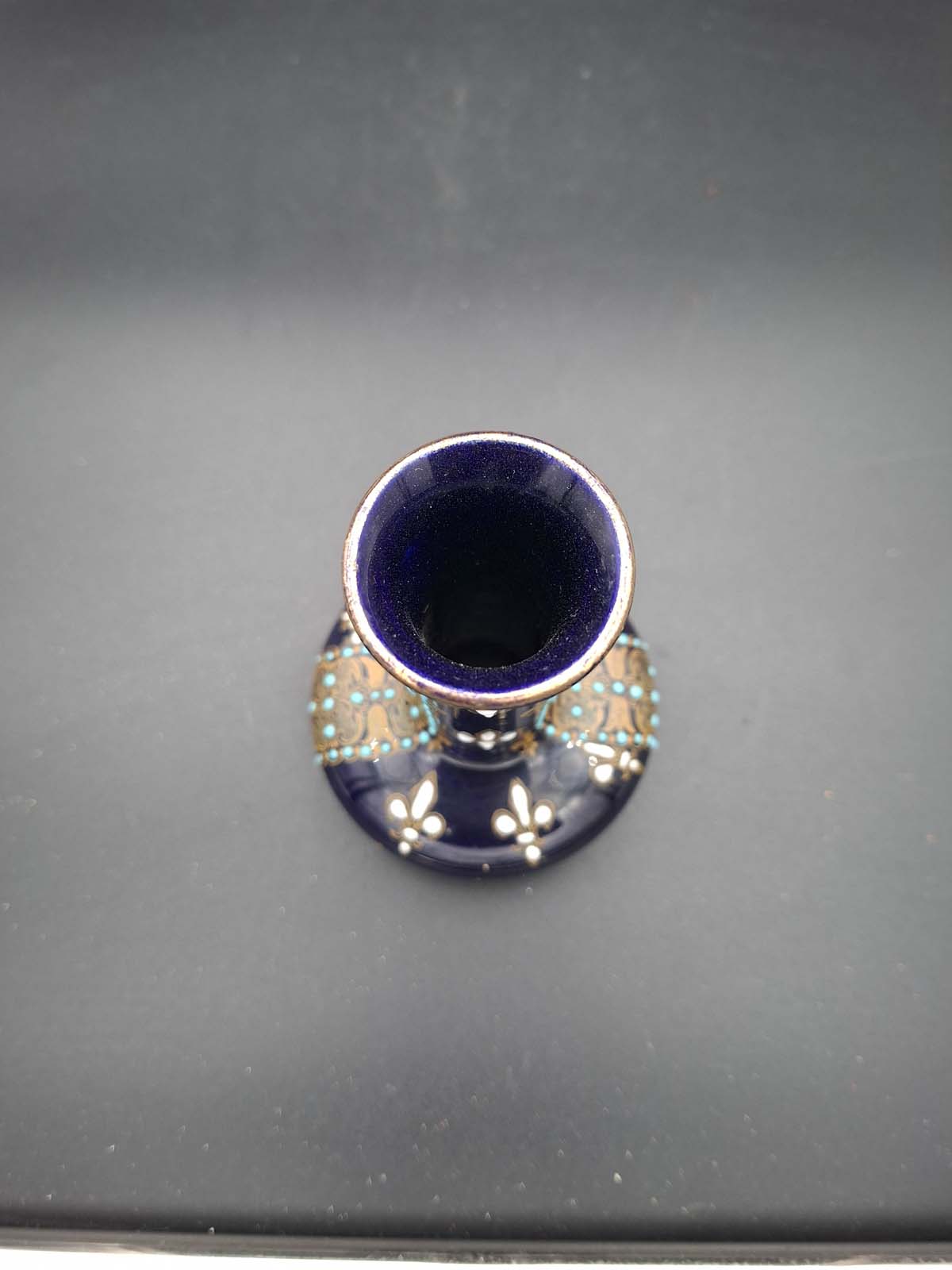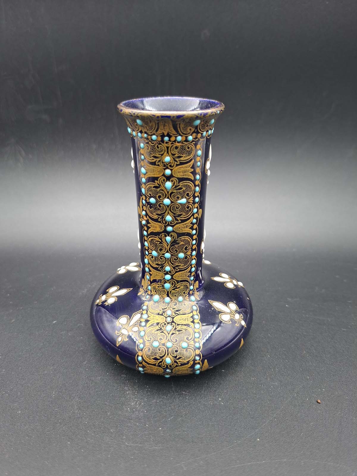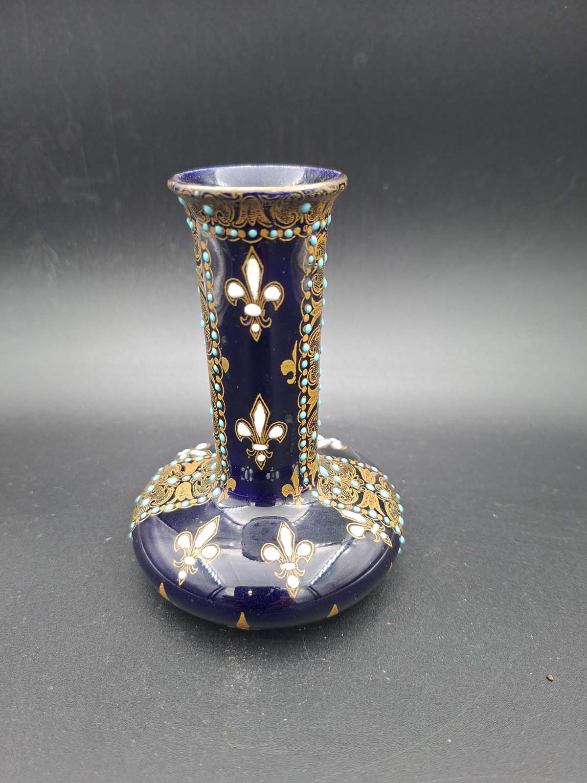 Here we have a lovely French vase in cobalt blue base with Enamel decoration to Fleur de lis and gold side decoration.