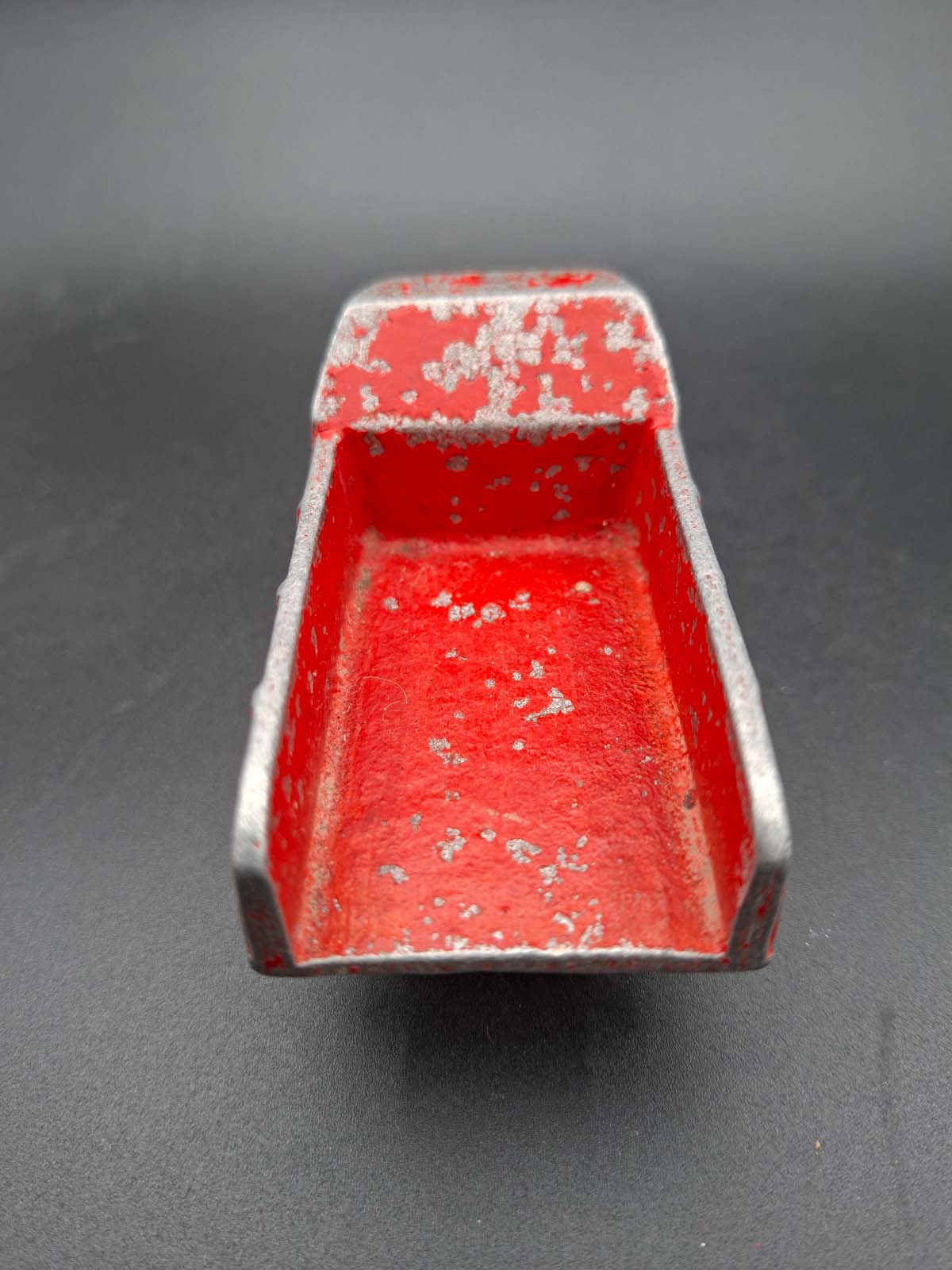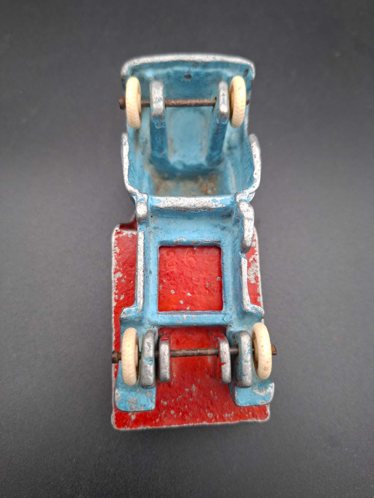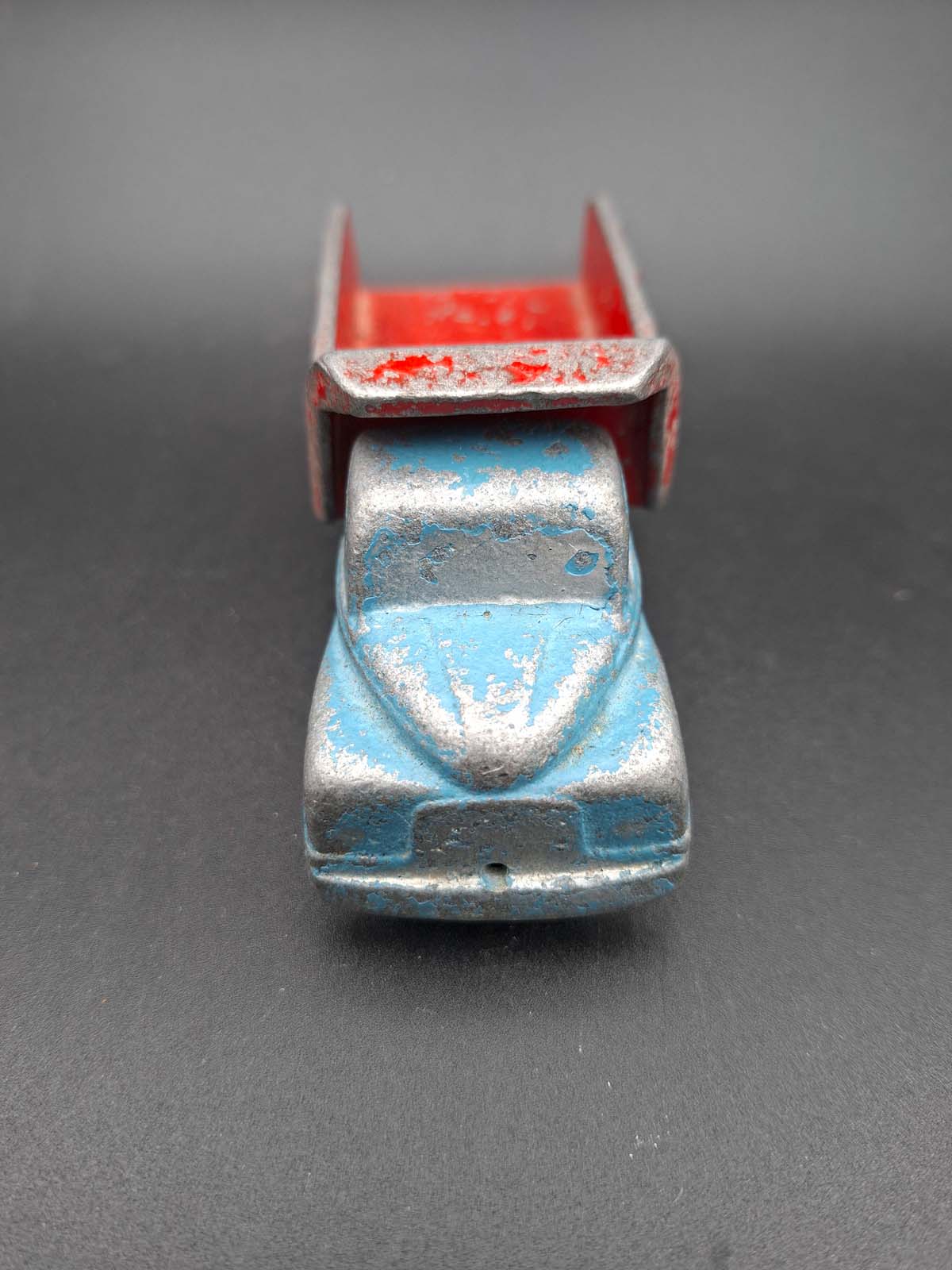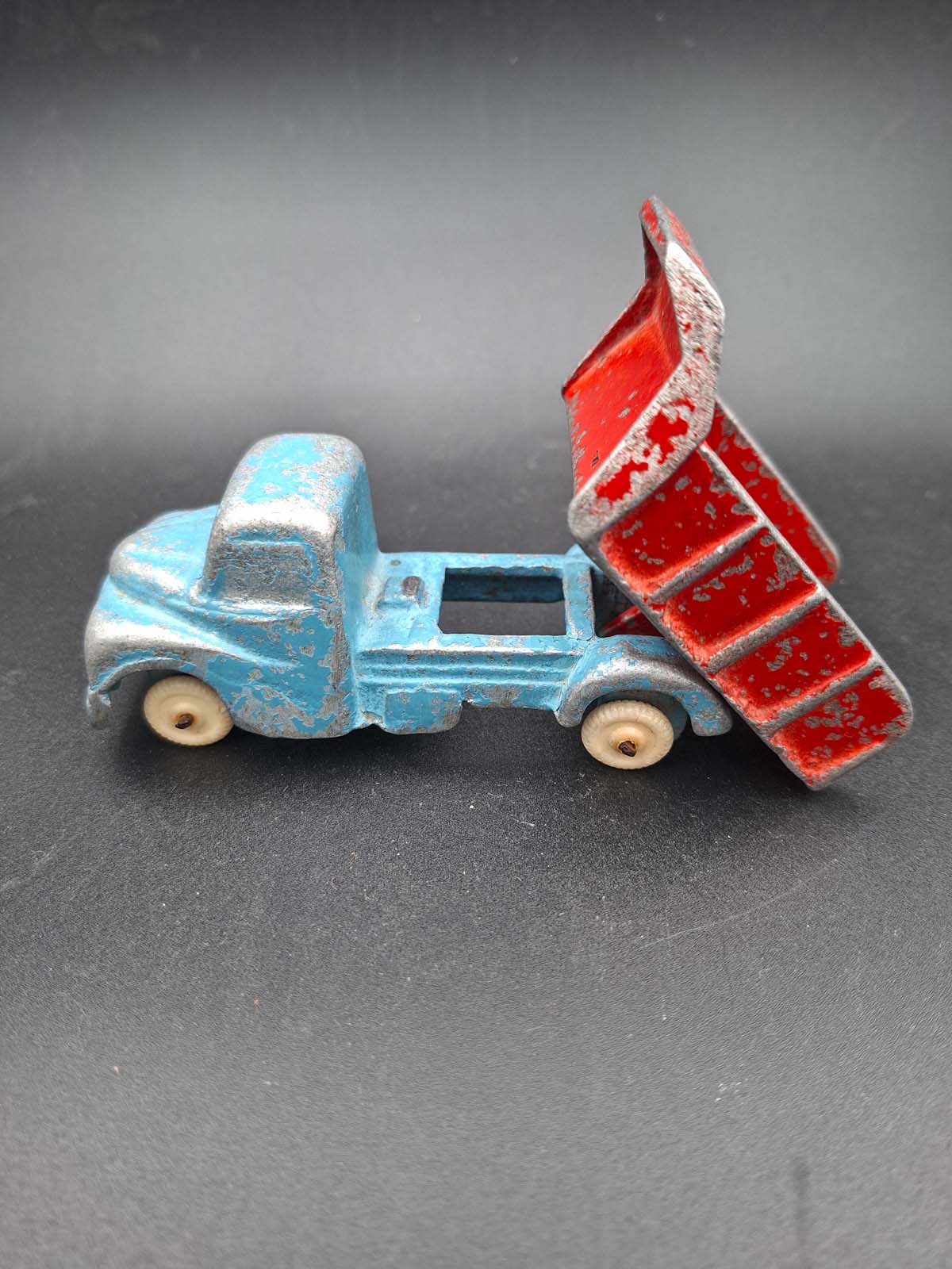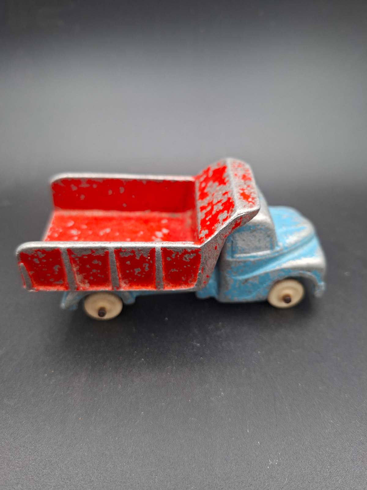 A Fun Ho tip truck in blue & red colourway with small white wheels.