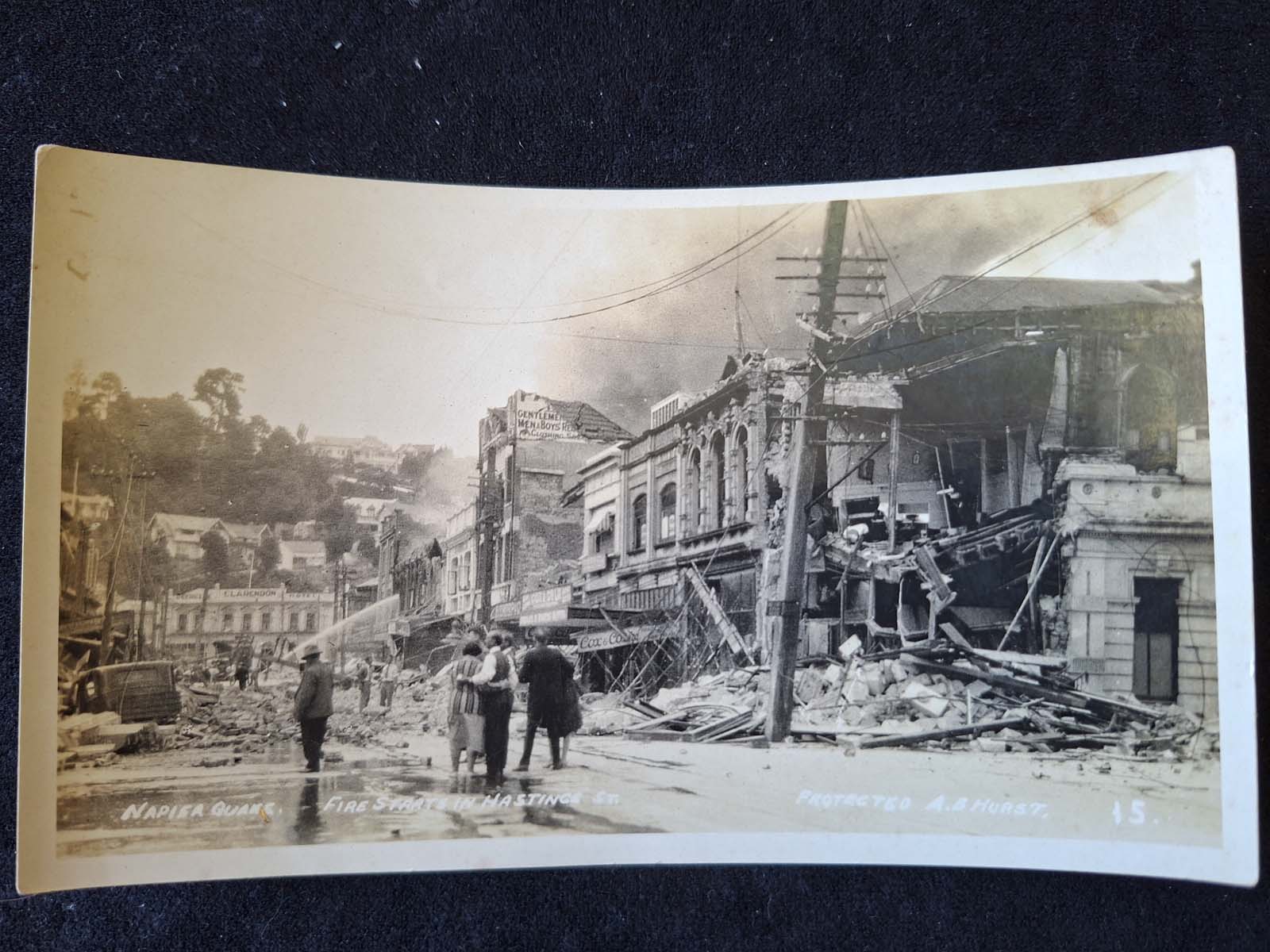 This is a real photo postcard showing Hastings St Napier after a fire broke out after the 1931 earthquake. Photo was taken by A.B. Hurst.