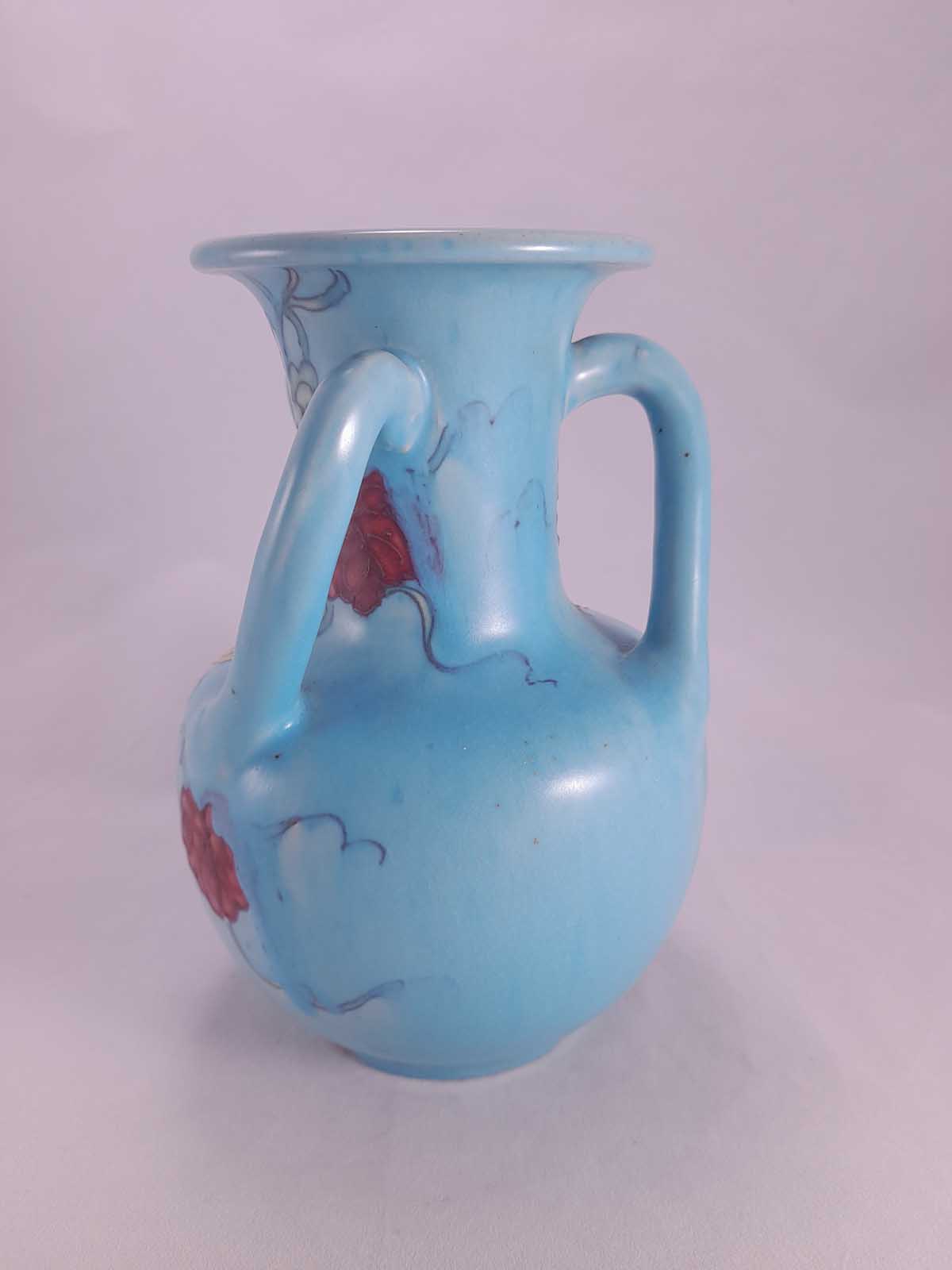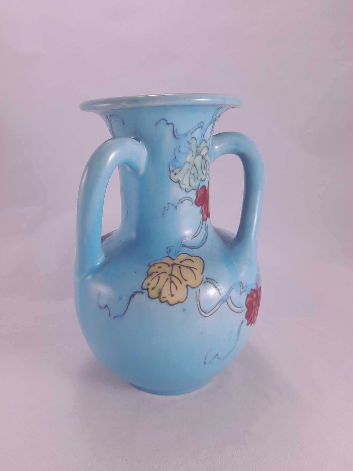 On offer is a beautiful tri-handled Awaji vase. made on the island of Awaji Japan. Awaji produced pottery from around 1830 till 1939. This one depicts colourful autumn leaves. This vase carries the ma