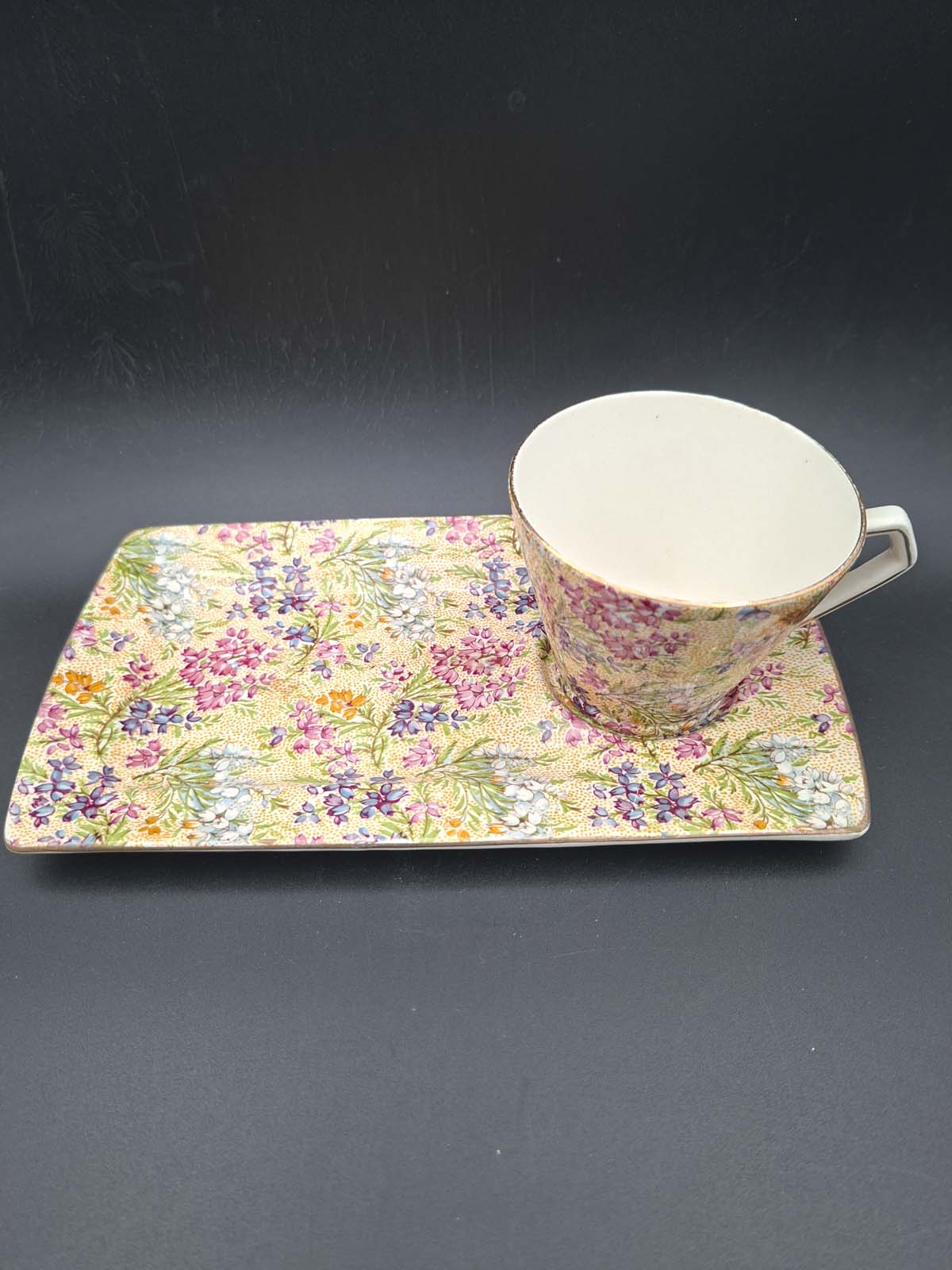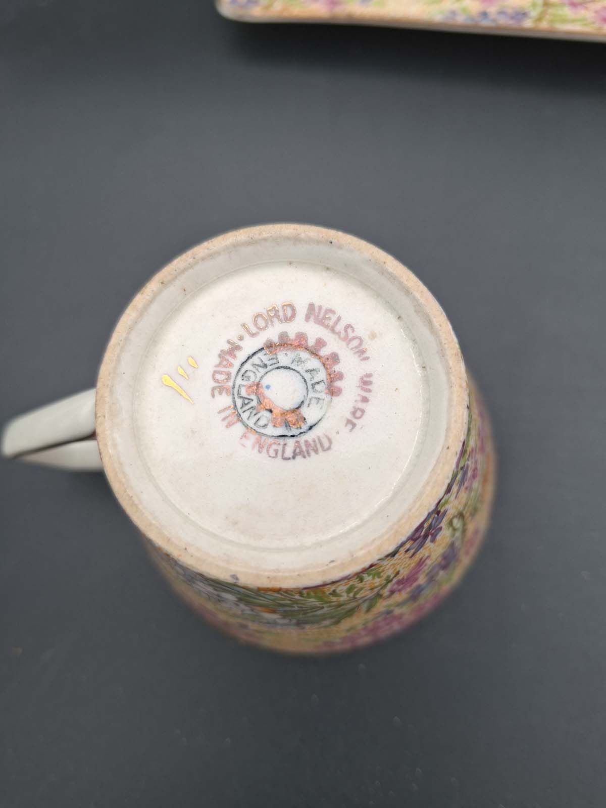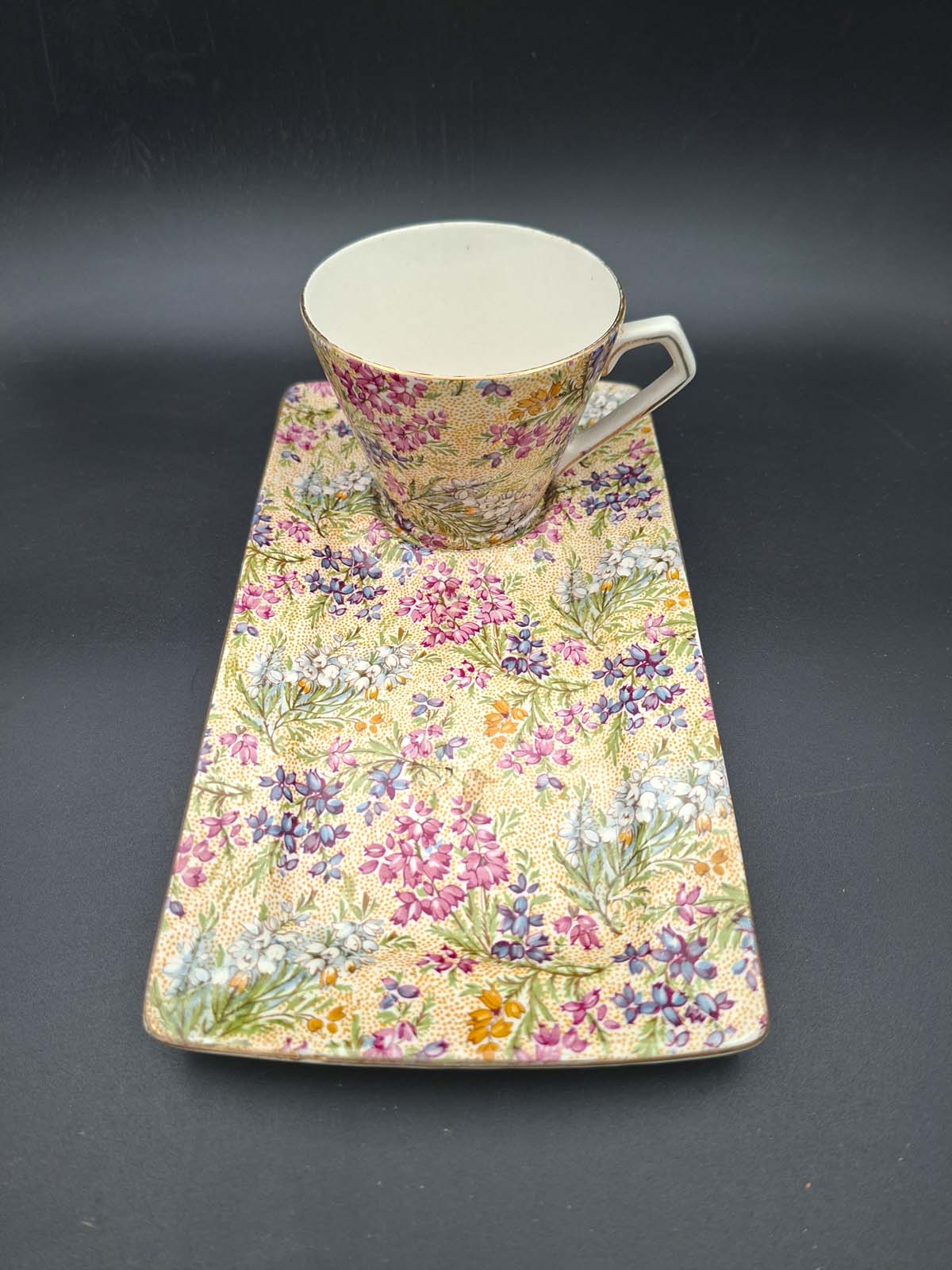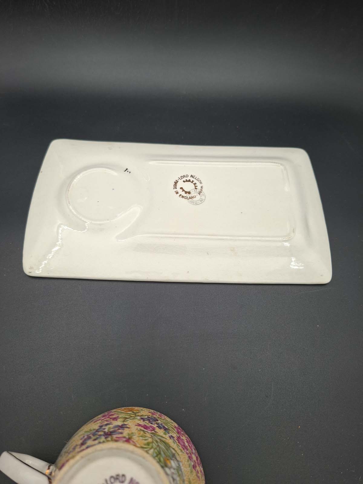 Here we have a beautiful “Heather” chintz cup and toast plate duo, made by Lord Nelson Ware England.