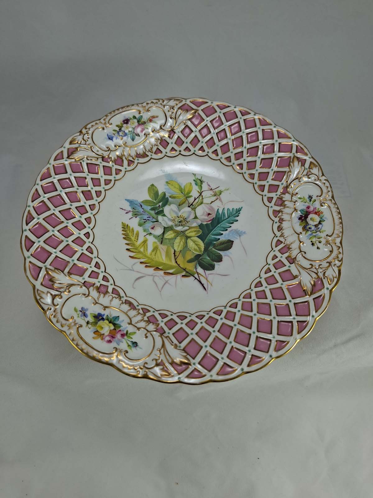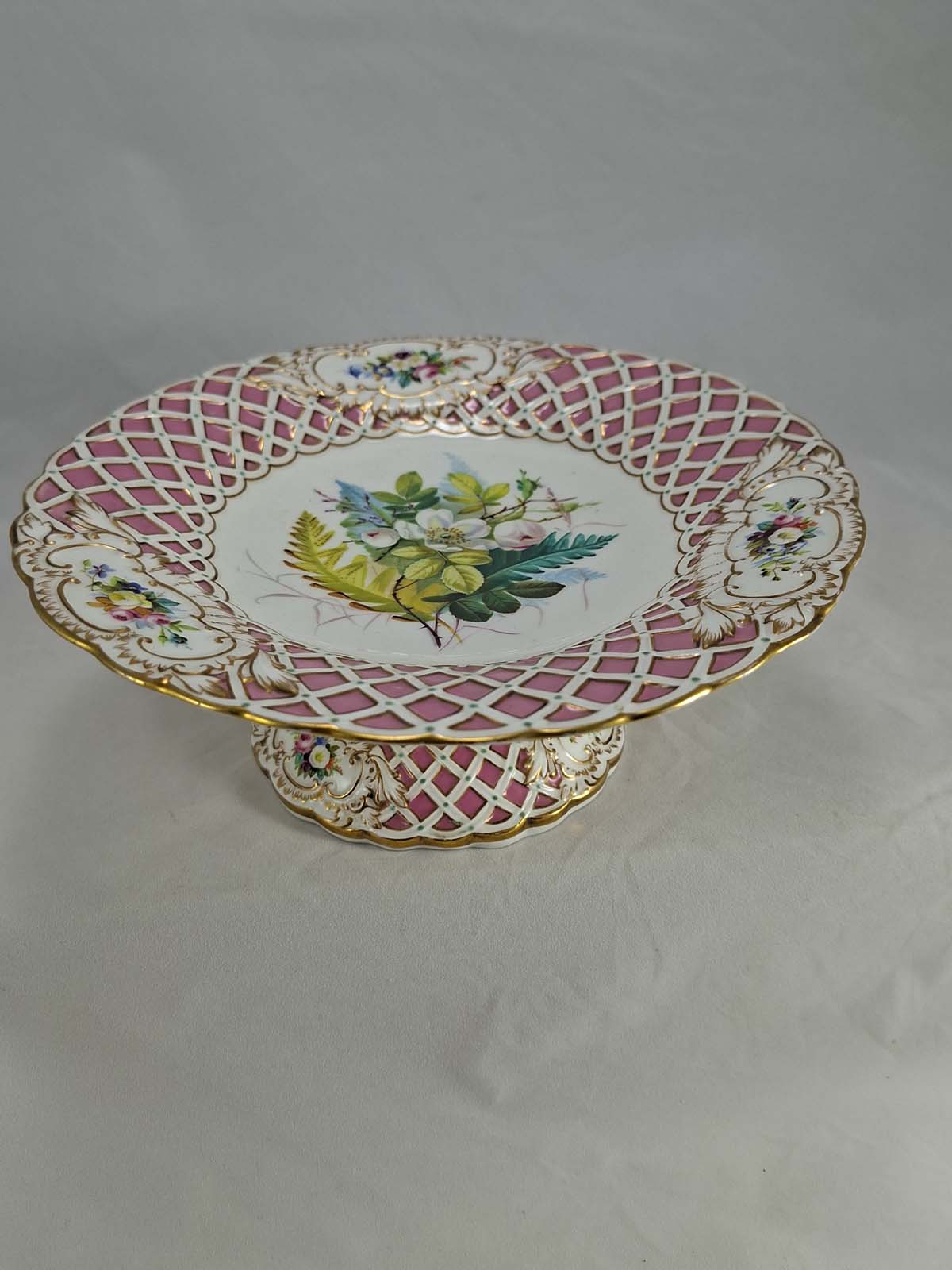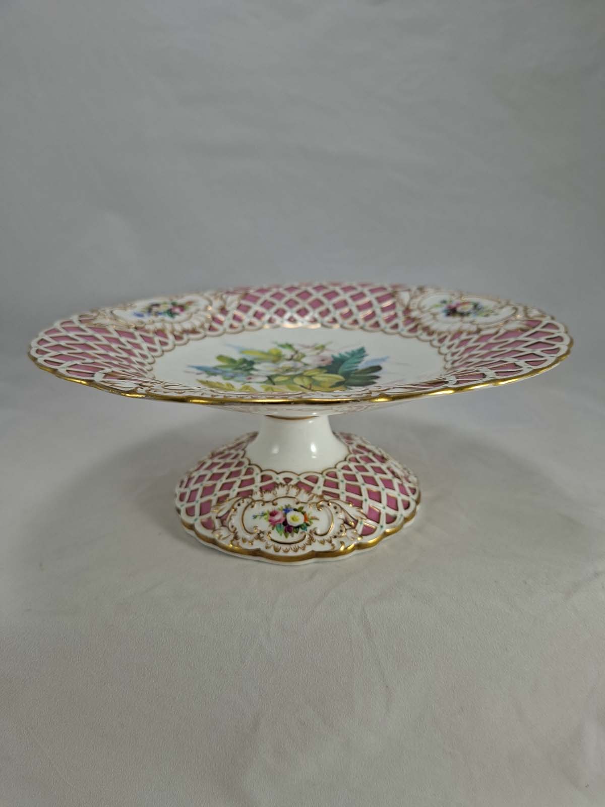 On offer here is a stunning unmarked Minton pink comport in the Newcastle shape with basket weave design border and beautifully hand painted floral sprays 6608/4
