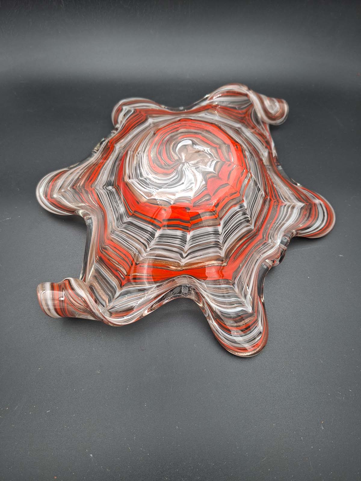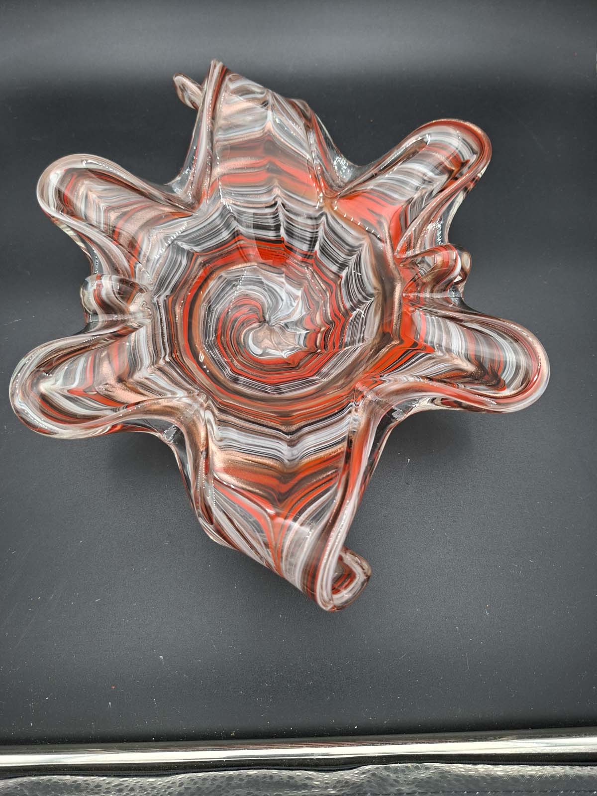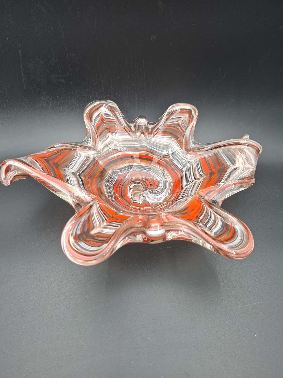 On offer here is a lovely Murano swirl bowl in orange, white and clear glass with copper flecks throughout.