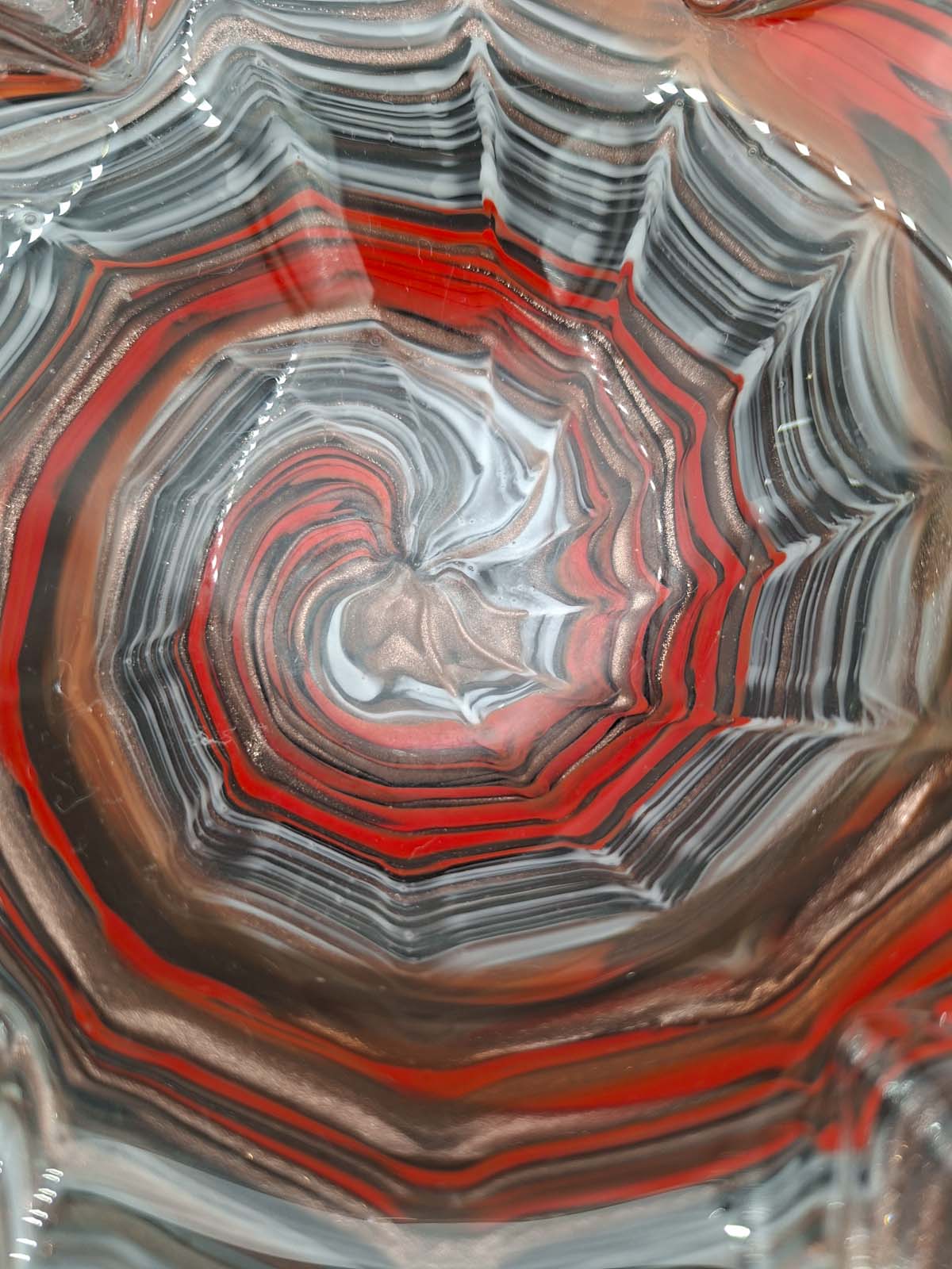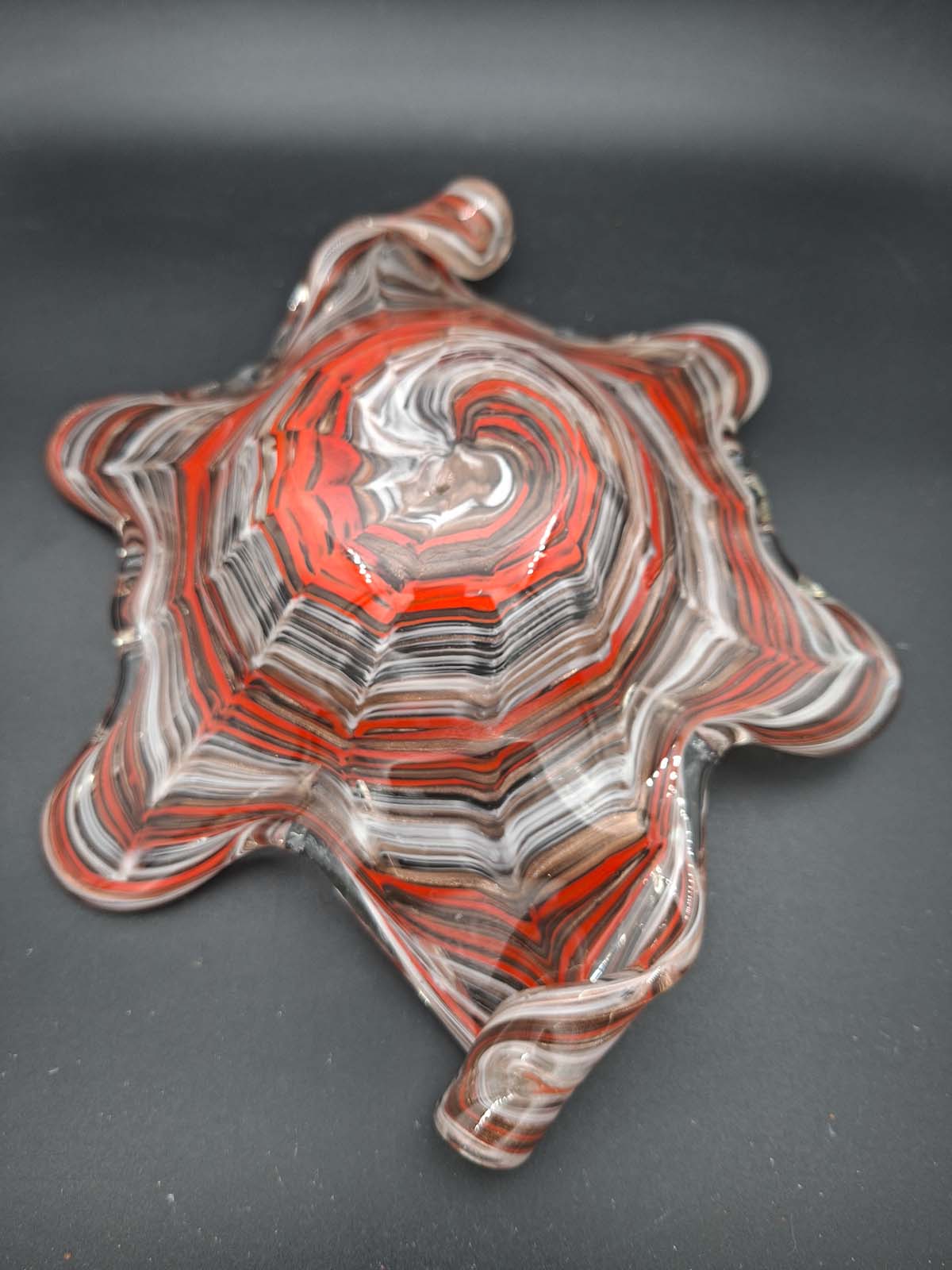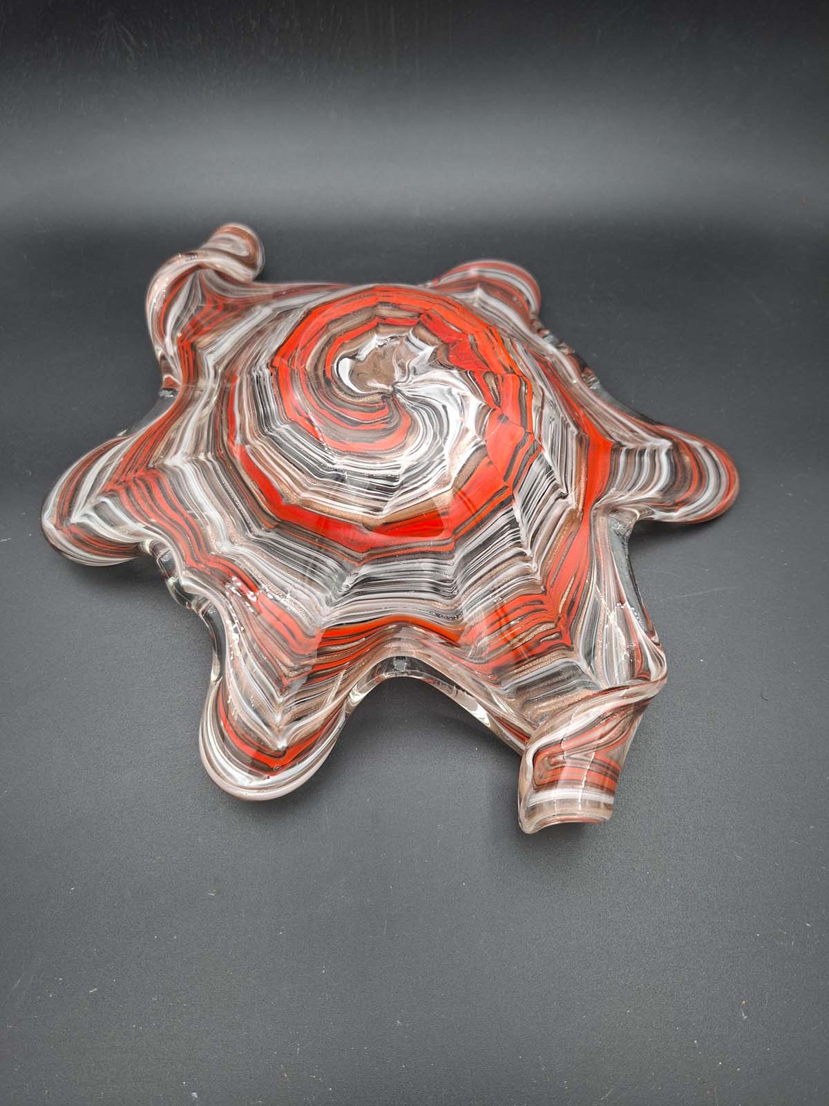 On offer here is a lovely Murano swirl bowl in orange, white and clear glass with copper flecks throughout.