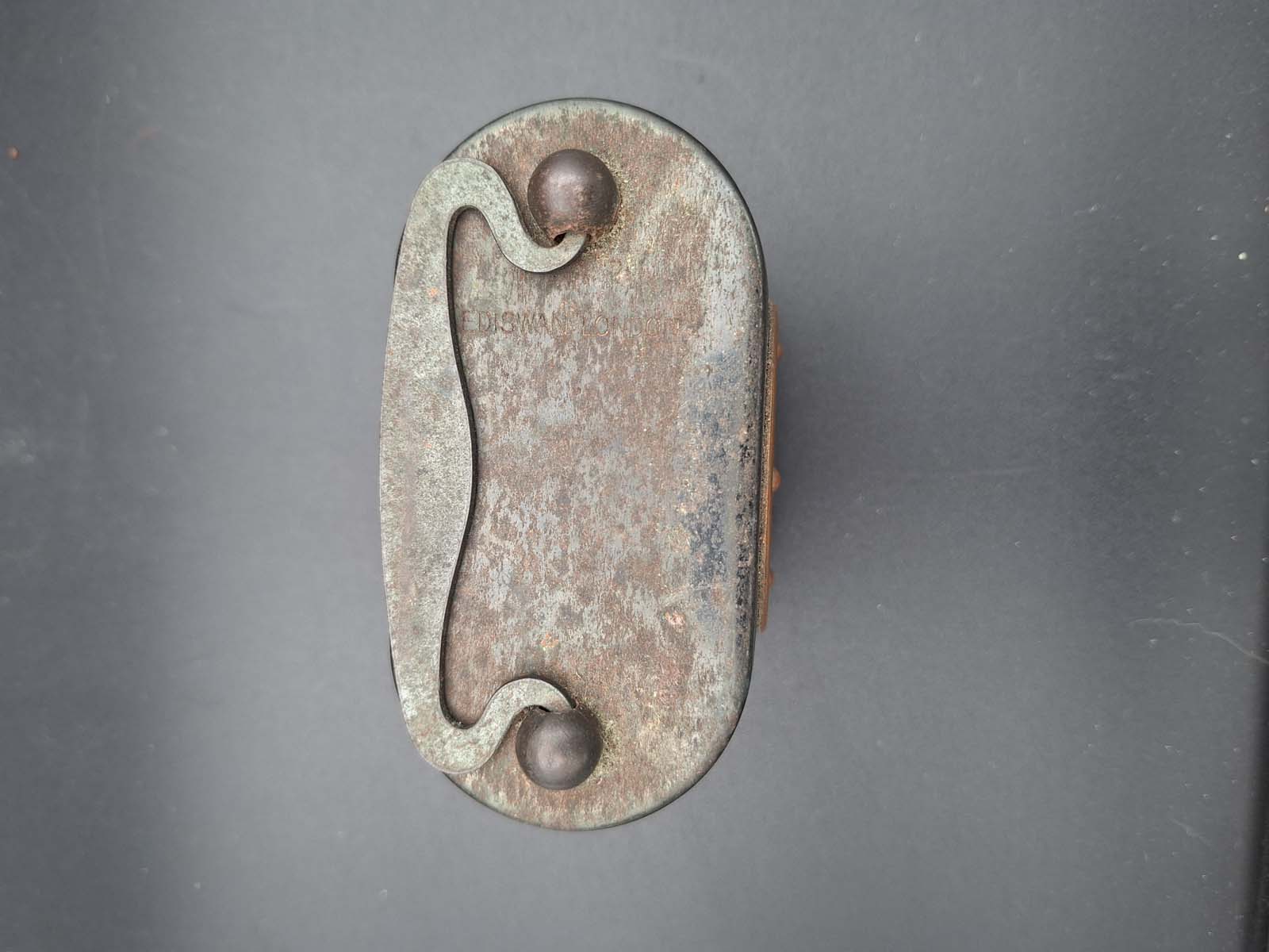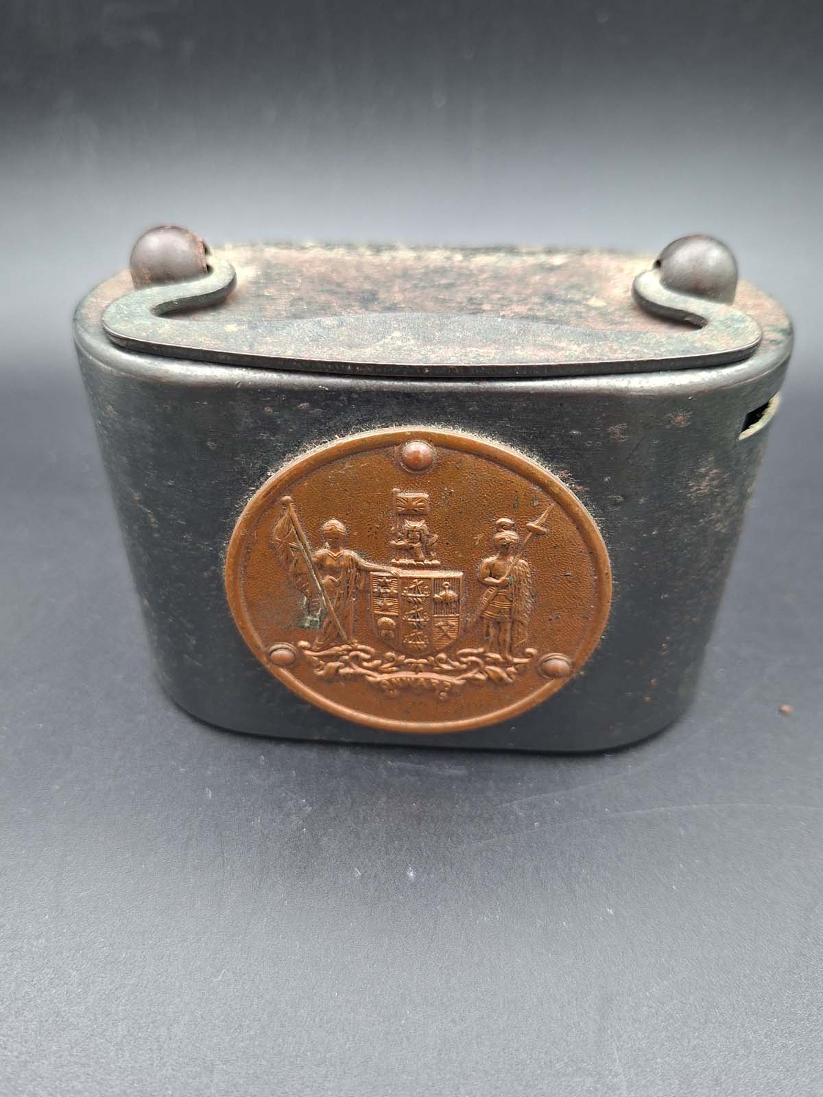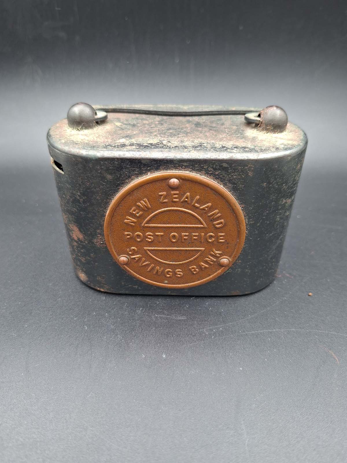 A New Zealand post office savings bank money box by Ediswan London. No.12474 stamped on the handle. Has the New Zealand cost of arms to the rear.