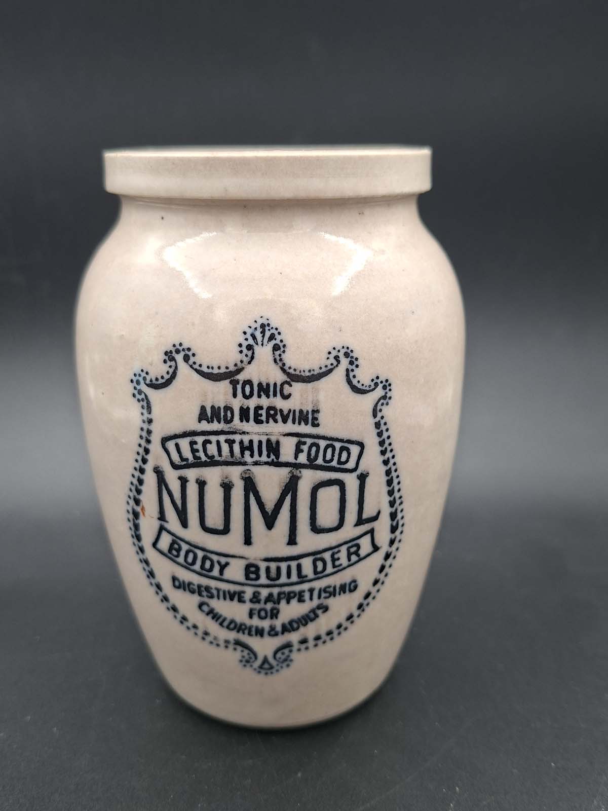 Here is a Numol stoneware jar that reads “Tonic & Nervine, Lecithin Food, NUMOL Body Builder, Digestive & Appetising for Children & Adults” No makers mark No. 3 on the base.