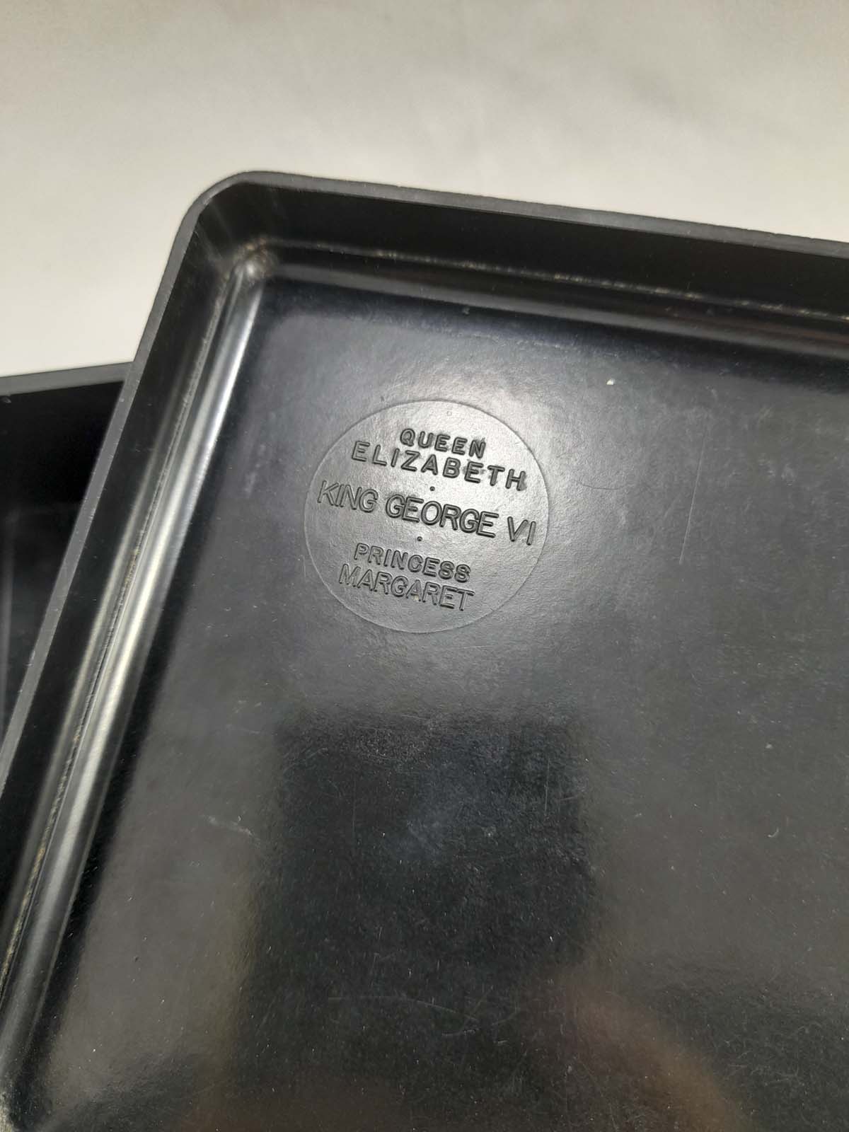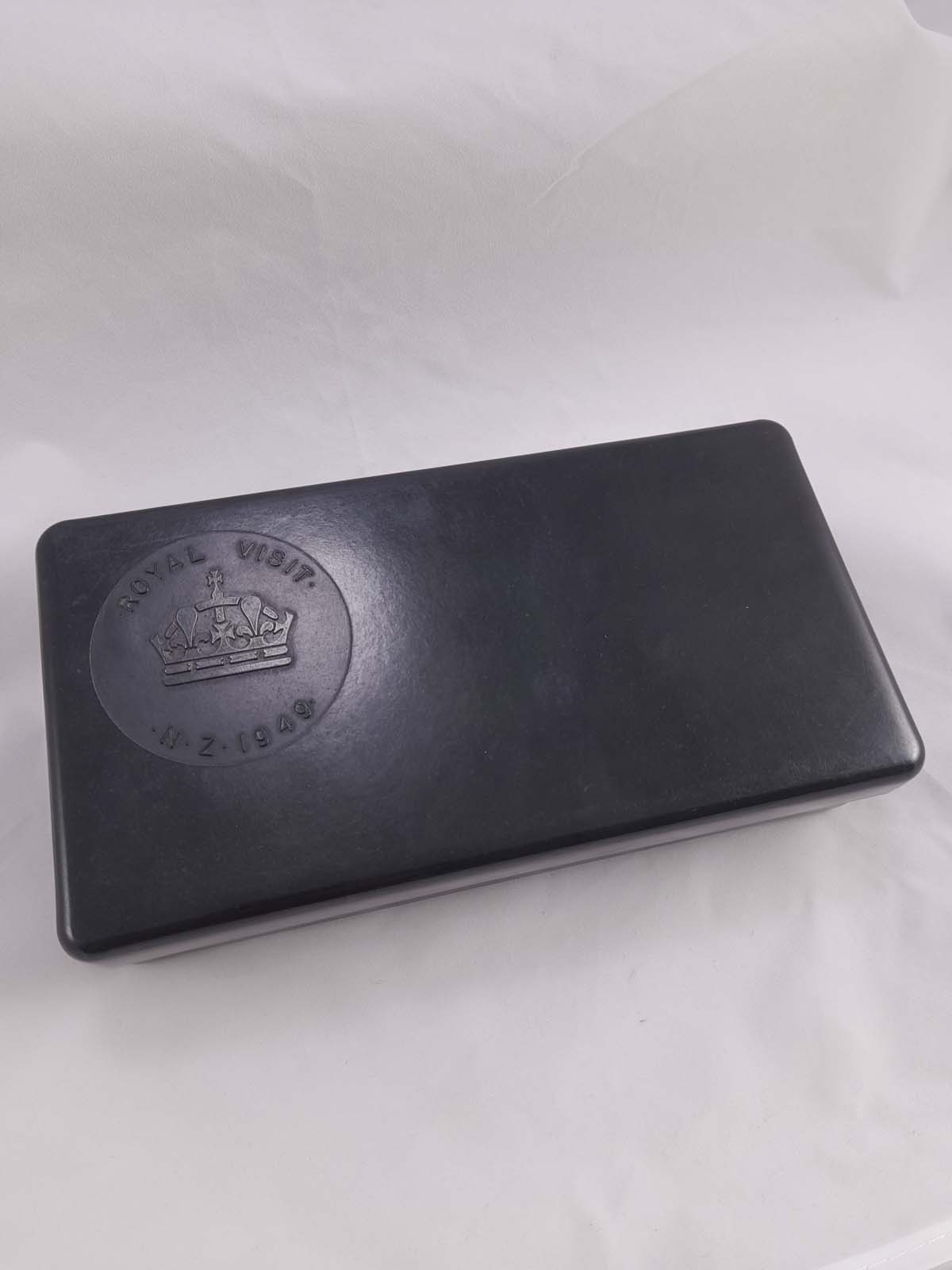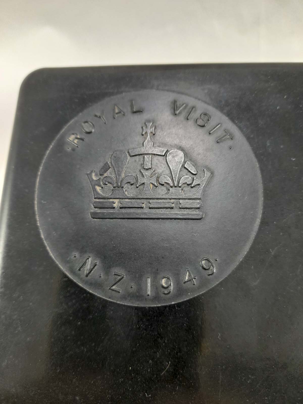 A black Bakelite Box put out to commemorate the royal visit in 1949. The inside of the lid is marked “Queen Elizabeth, King George VI and Princess Margaret” The tour ended up being cancelled due to th