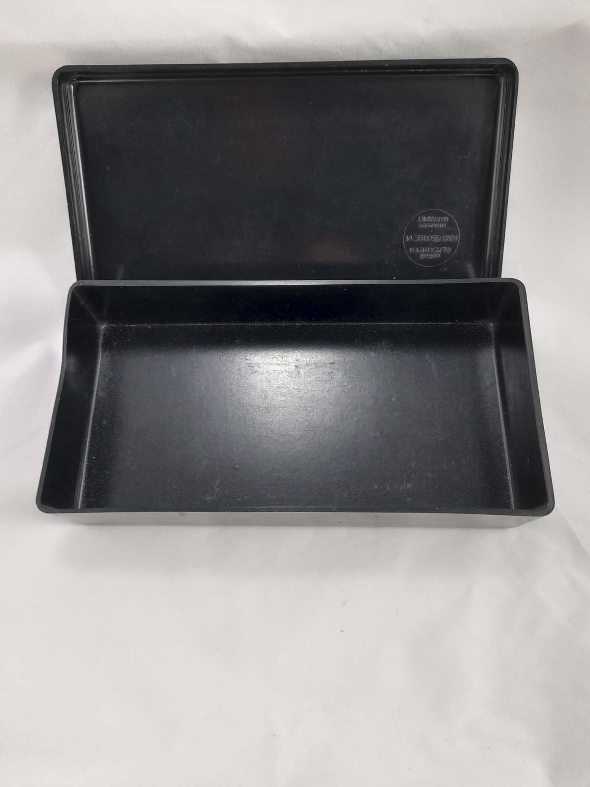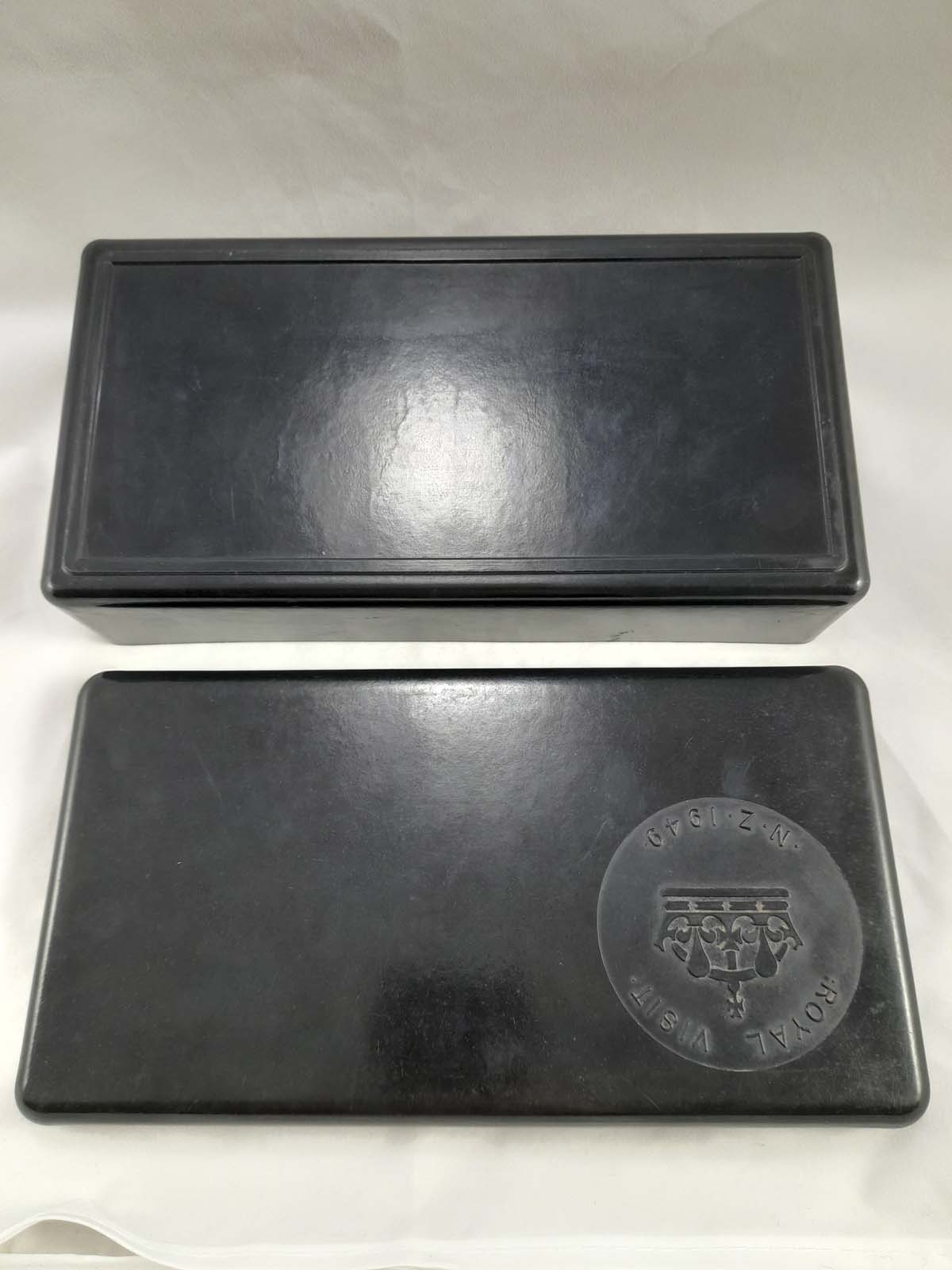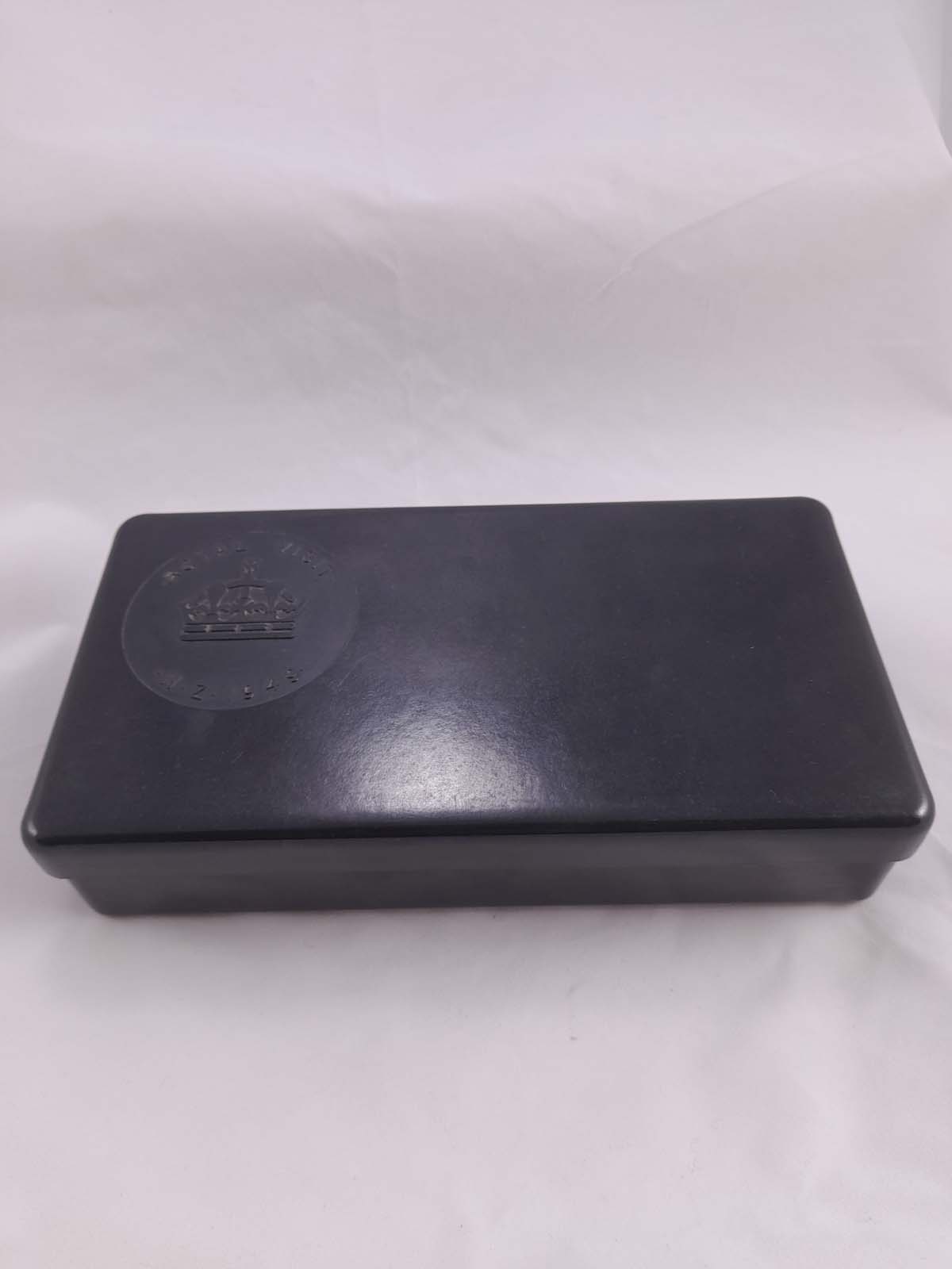 A black Bakelite Box put out to commemorate the royal visit in 1949. The inside of the lid is marked “Queen Elizabeth, King George VI and Princess Margaret” The tour ended up being cancelled due to th