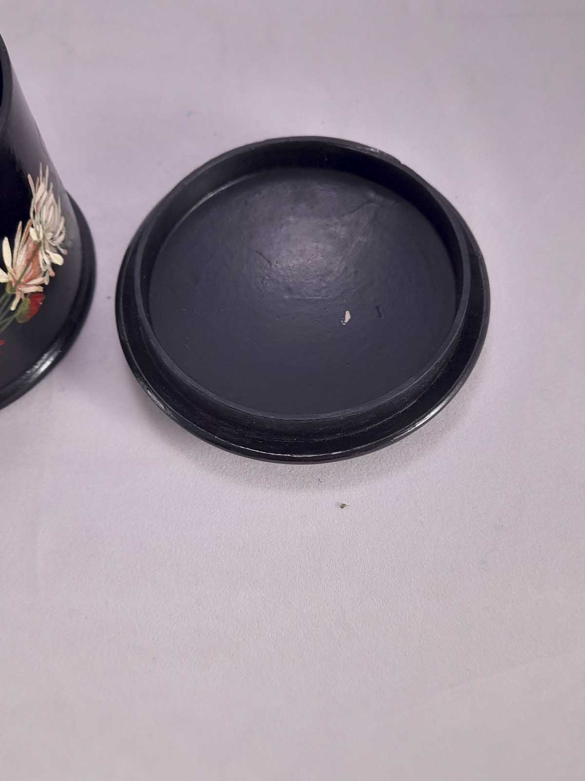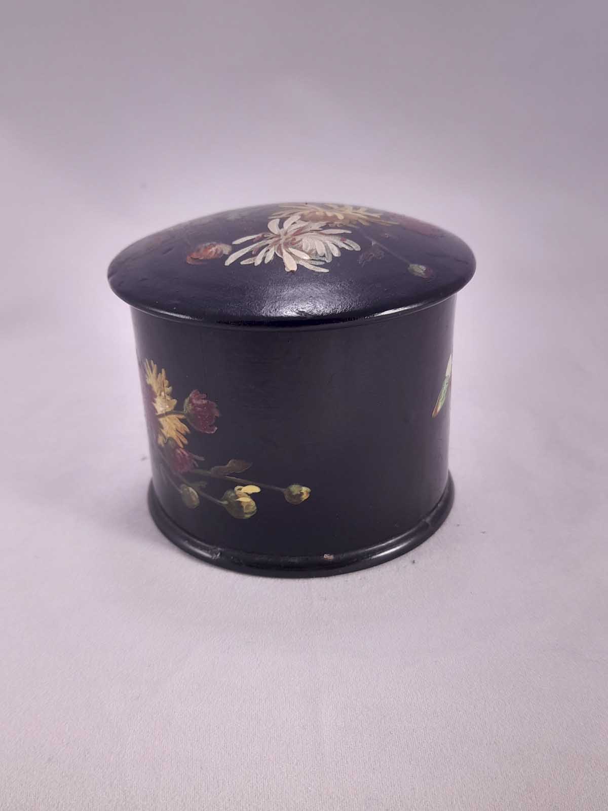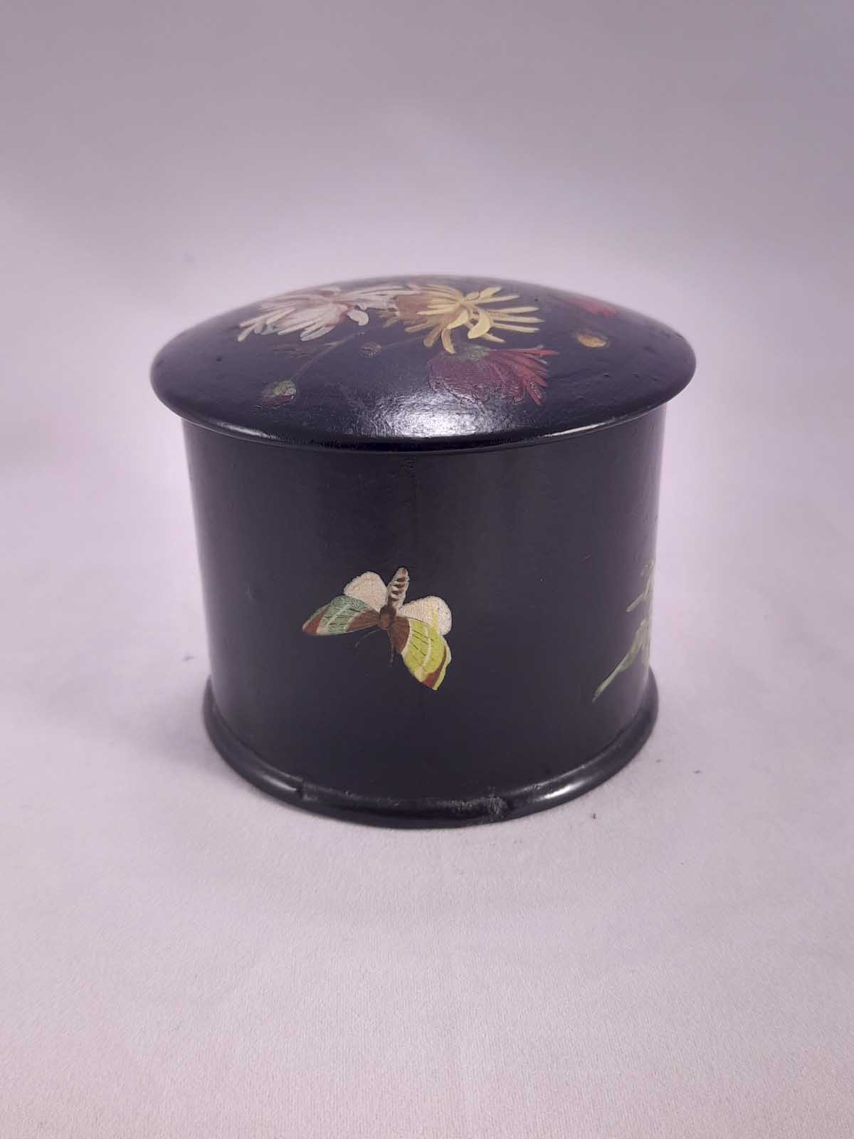 A beautiful Papier Mache lidded jar with floral decoration and a butterfly to the rear.