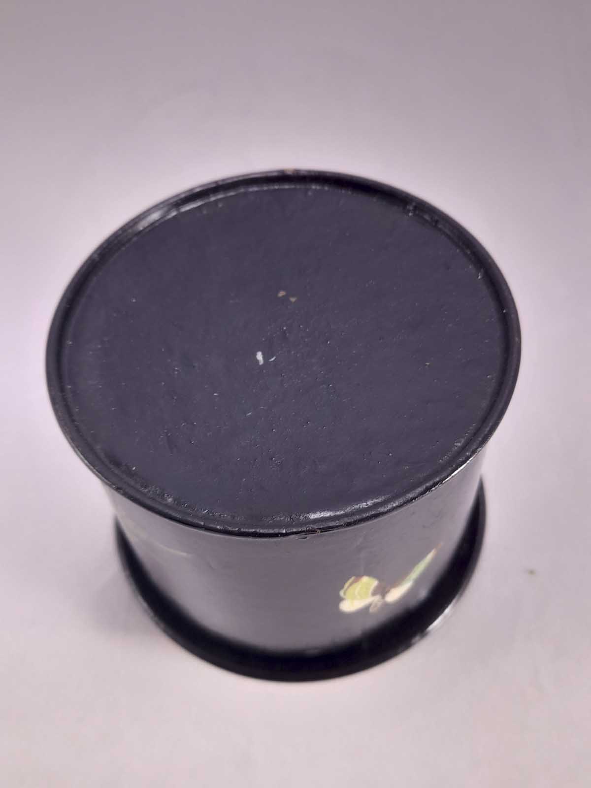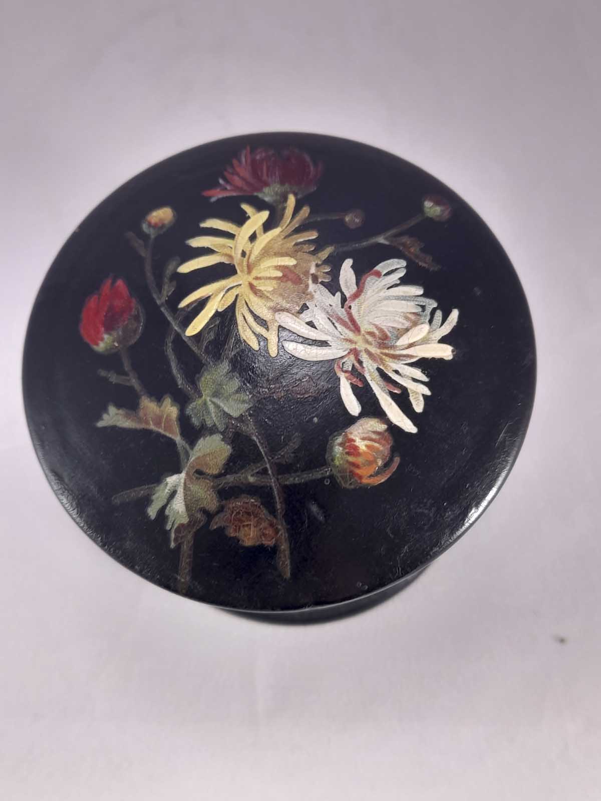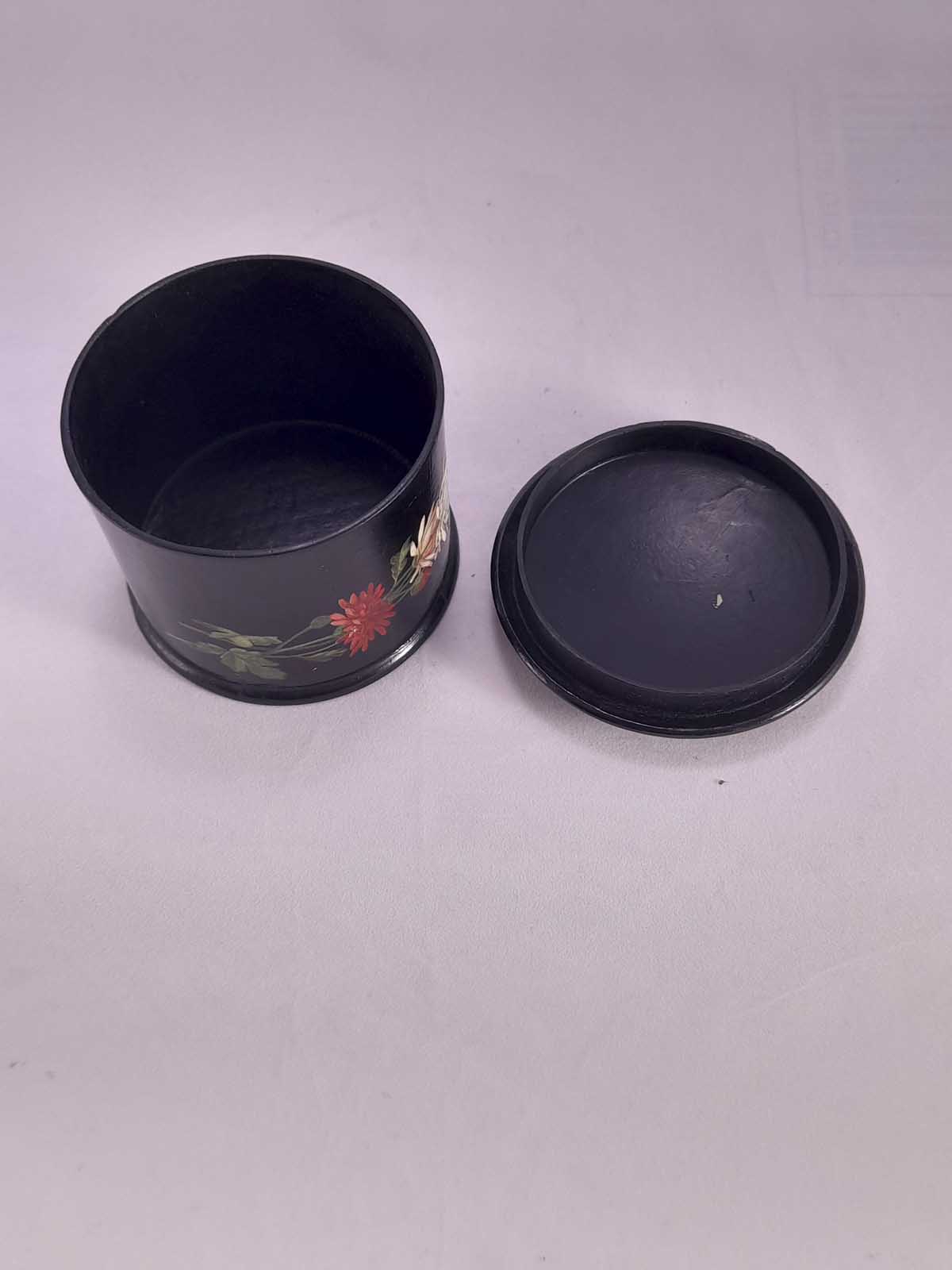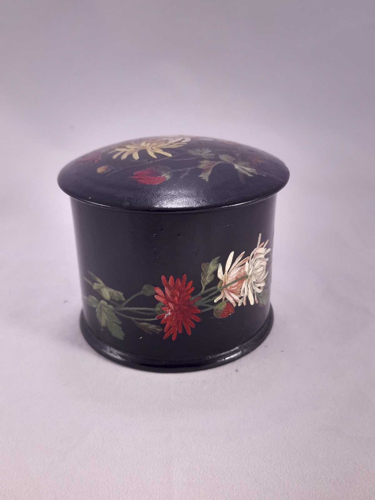 A beautiful Papier Mache lidded jar with floral decoration and a butterfly to the rear.