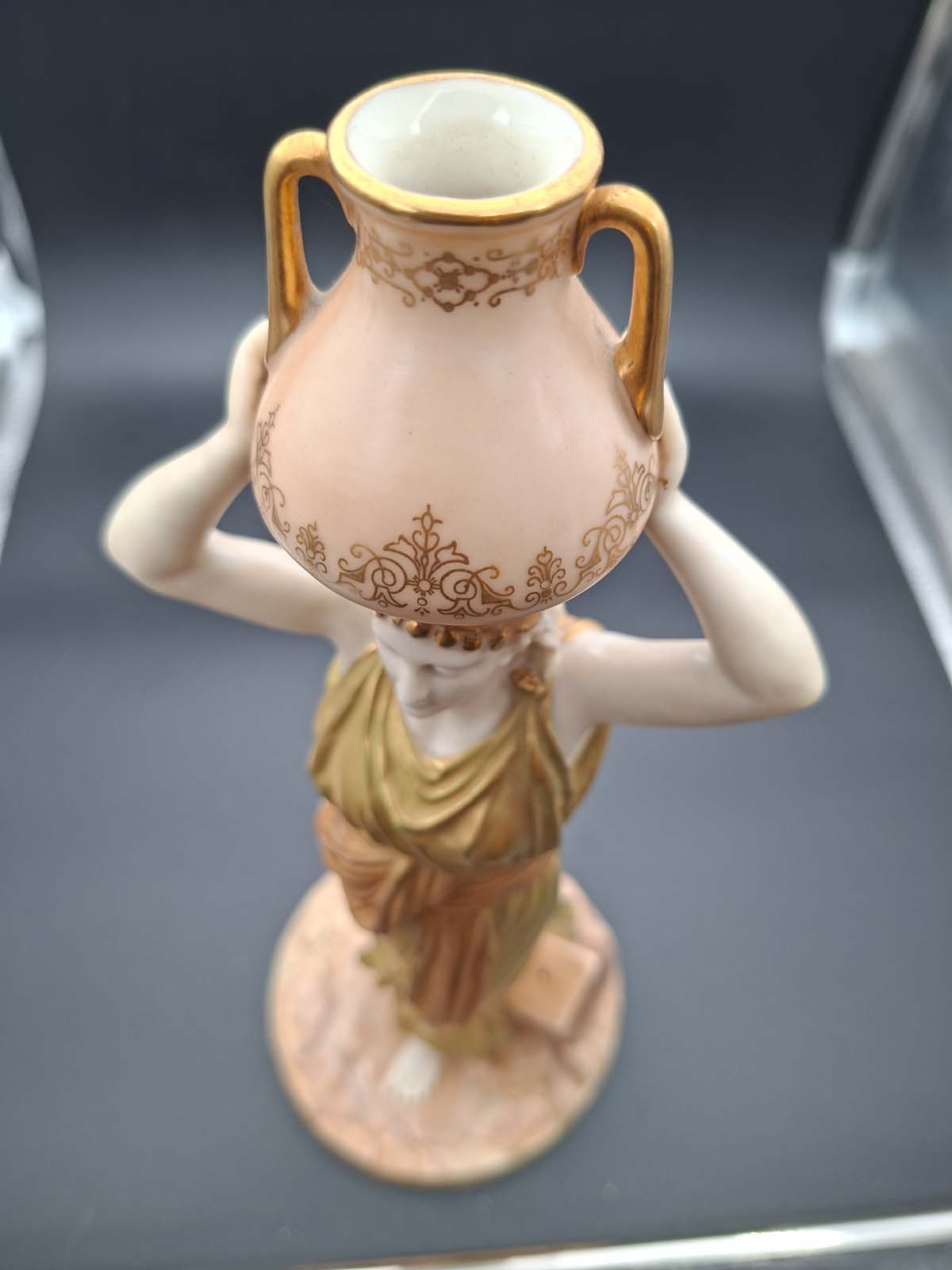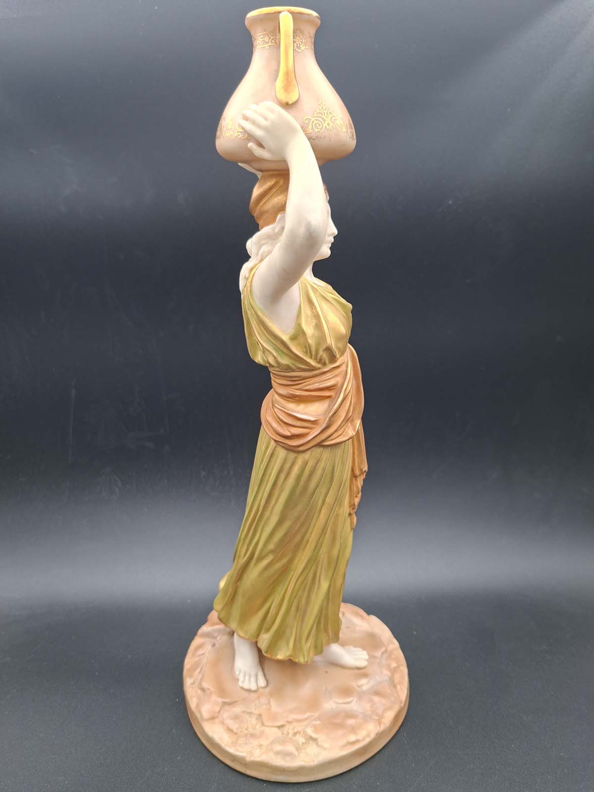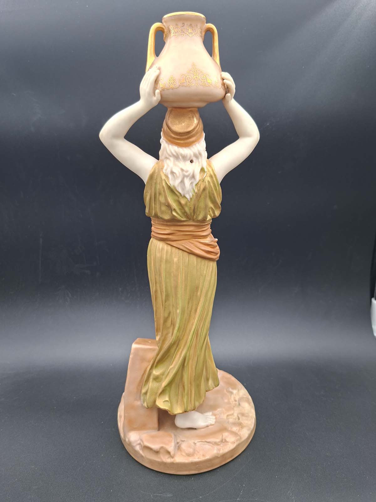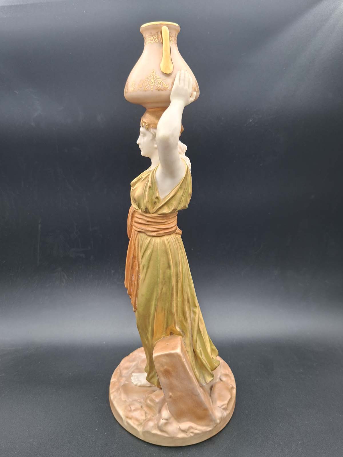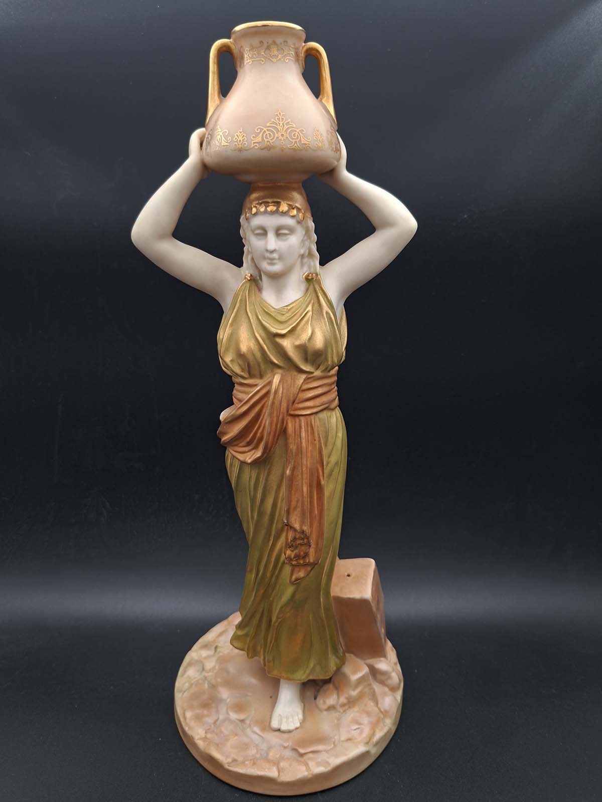 A beautiful Royal Worcester figurine of a Grecian Maiden wearing a golden robe and holding an urn above her head with both hands. Dating to 1912.