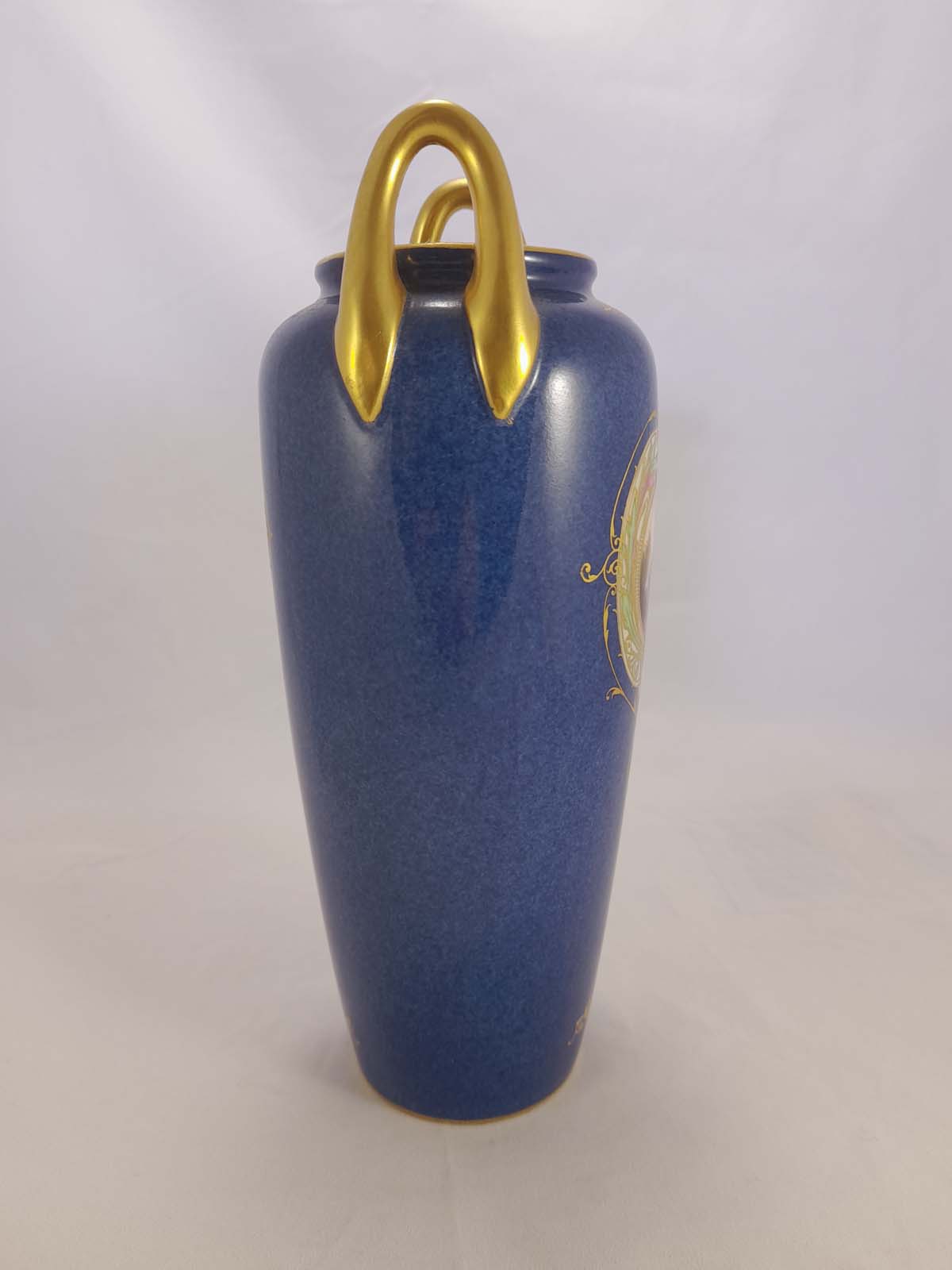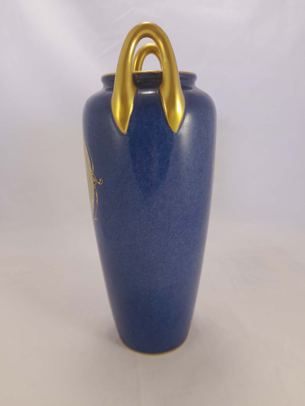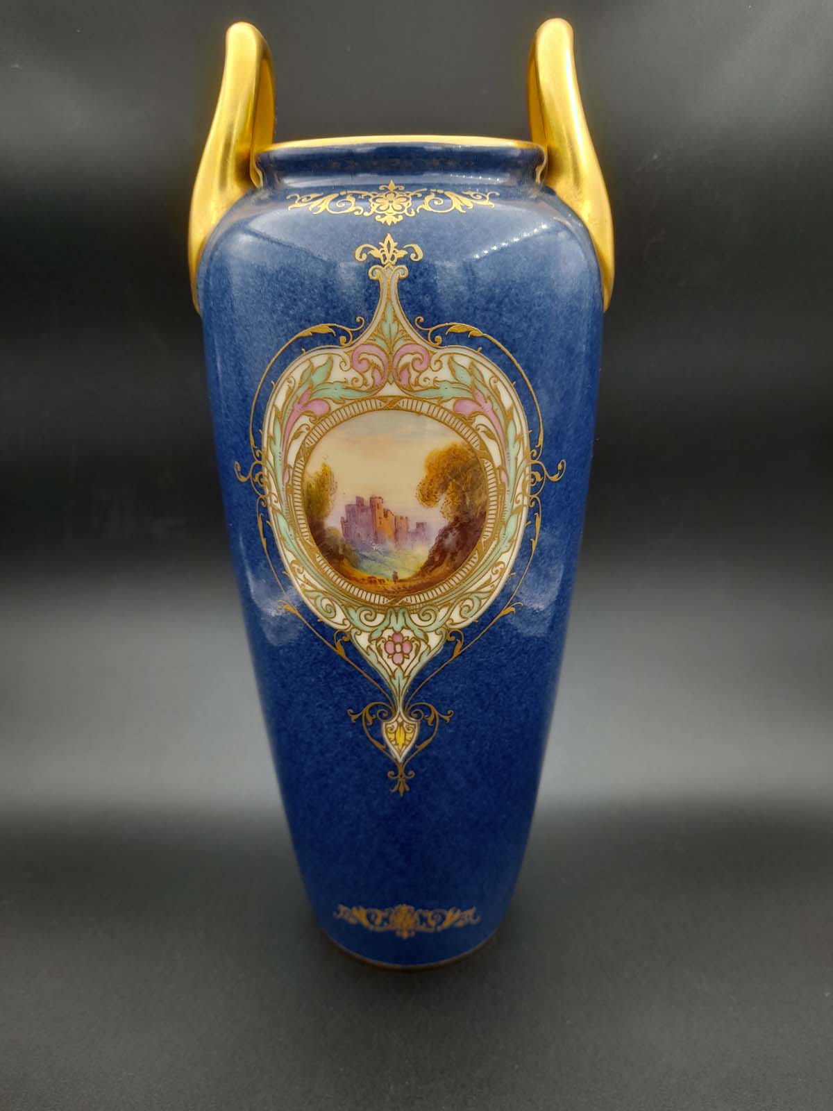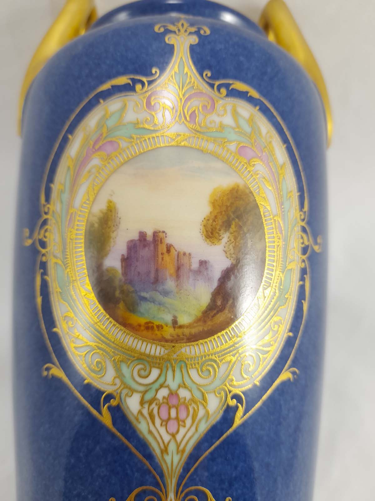 On offer here is beautiful Royal Worcester powder blue vase with gilt decoration and a central hand painted castle scene, surrounded with further gilding with filled colours of yellow, green and pink.