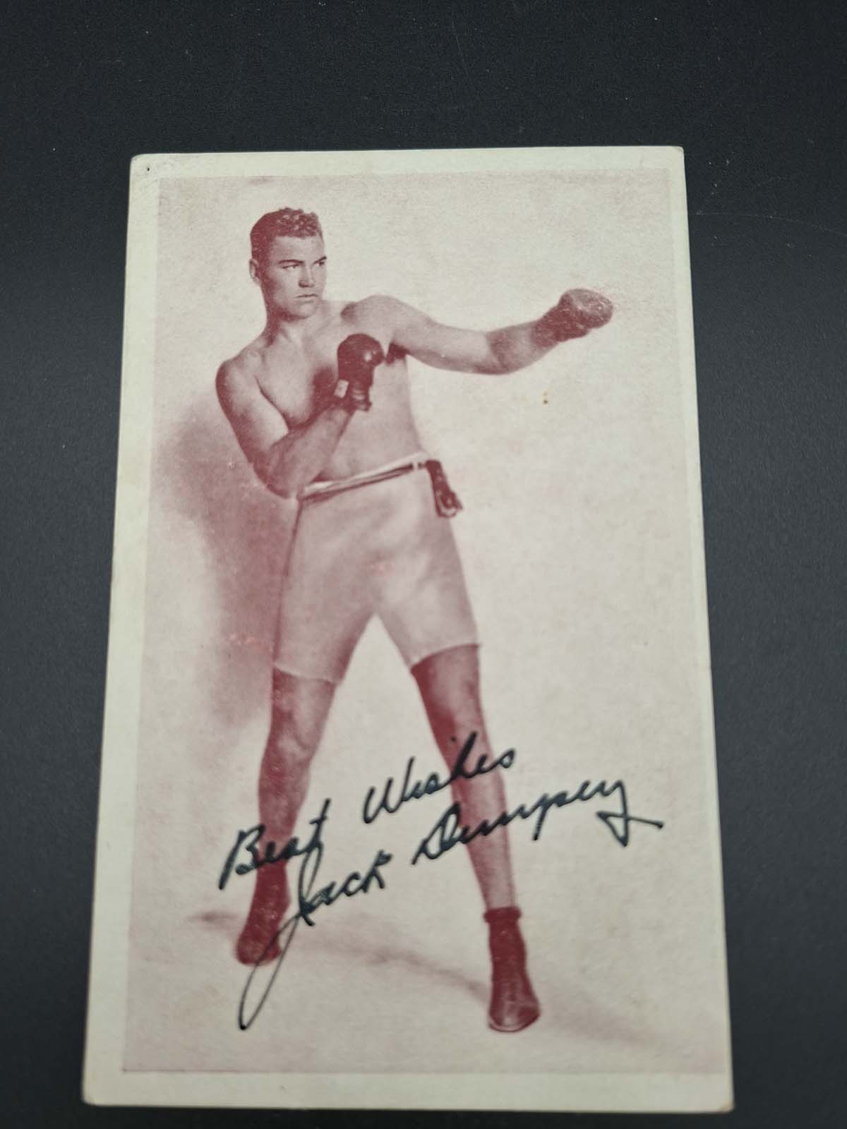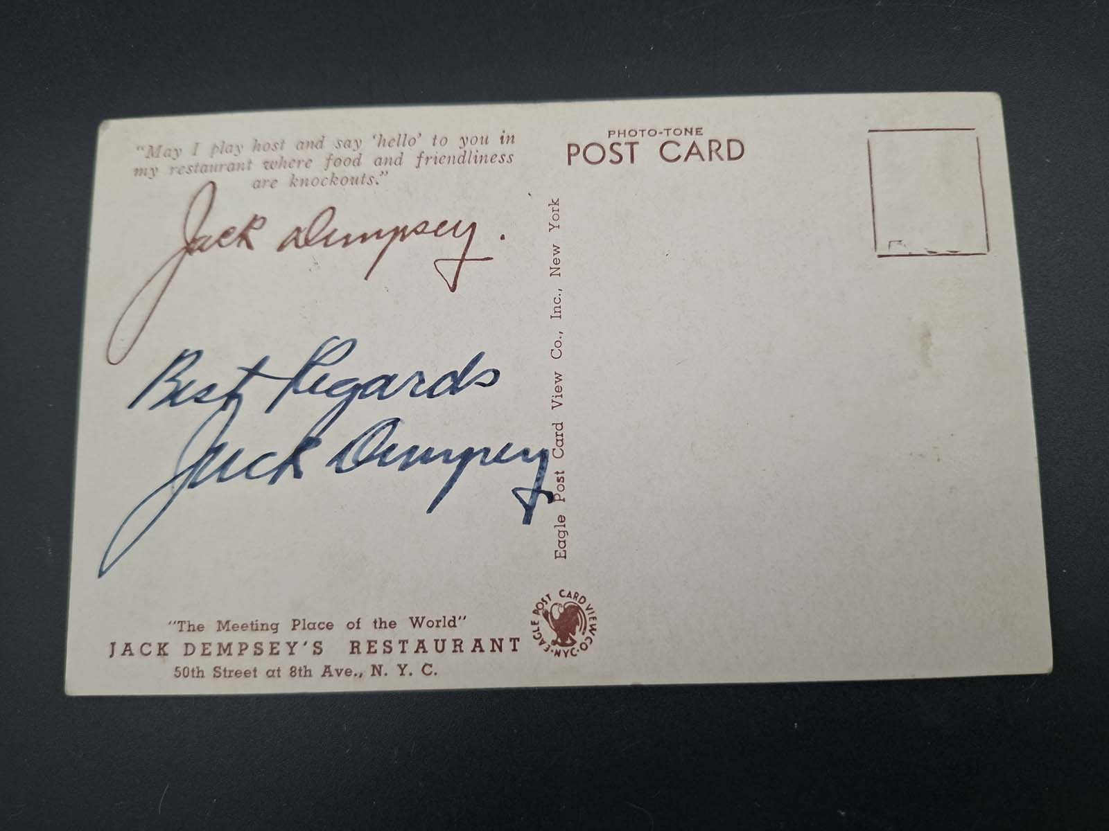 A rare signed postcard depicting Jack Dempsey World Heavyweight Boxing Champion between 1919 -26. Signed at Jack Dempsey’s restaurant 50th street at 8th Ave New York city.