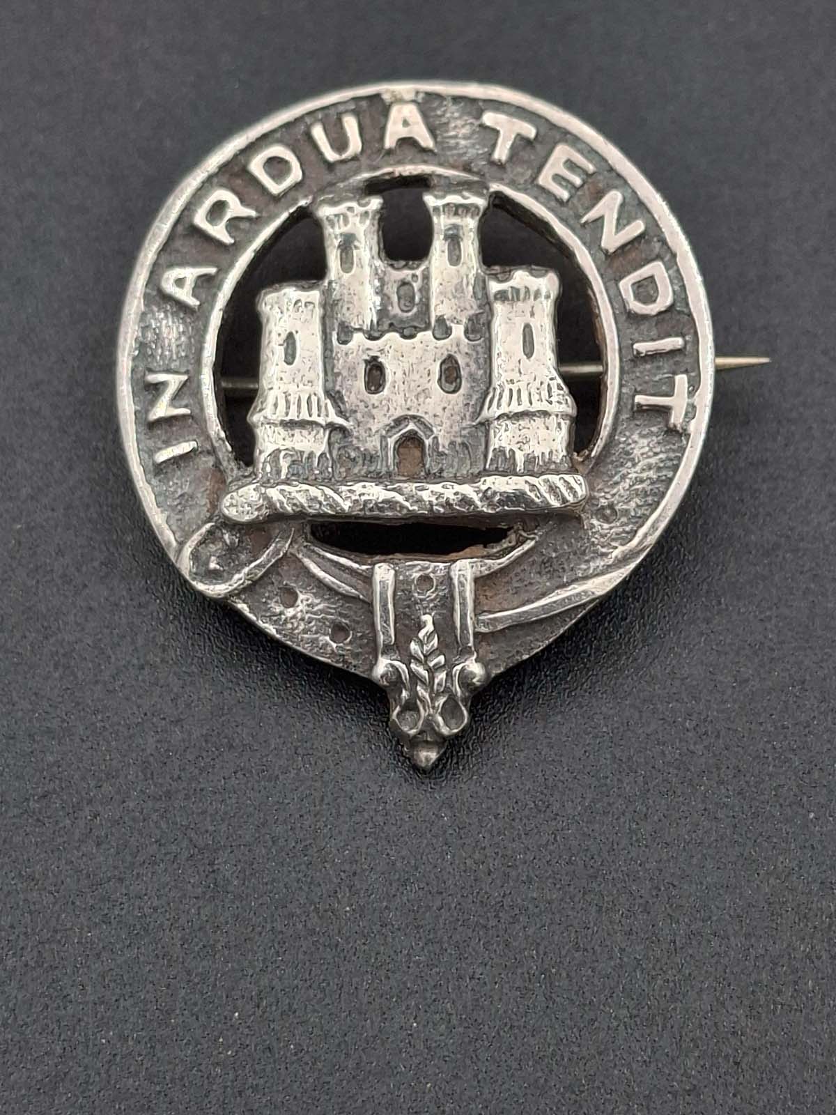 I believe this is a sterling silver Clan Malcom/MacCallum crest badge. The motto around the belt is ‘In Ardua Tendit” standing for He who aims for difficult things. This badge is usually worn as eithe