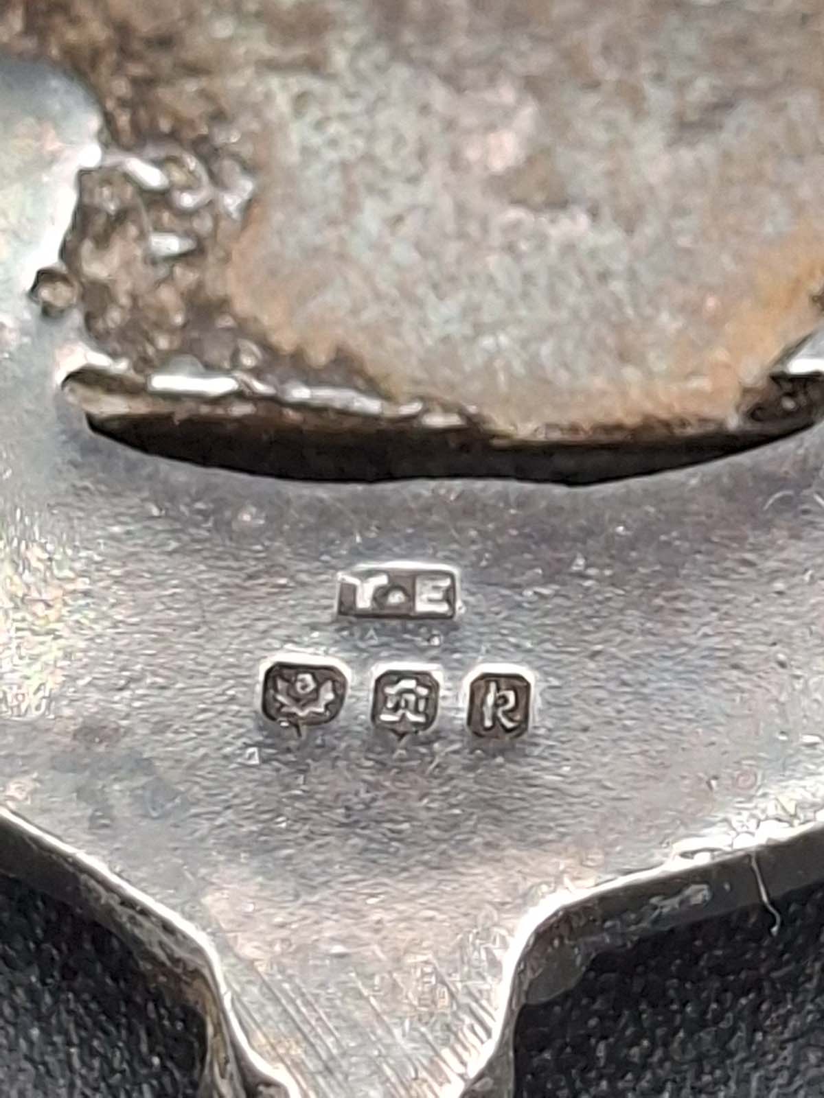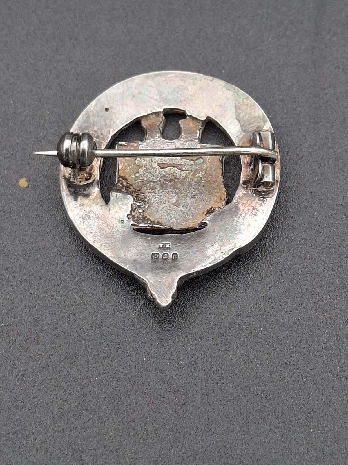 I believe this is a sterling silver Clan Malcom/MacCallum crest badge. The motto around the belt is ‘In Ardua Tendit” standing for He who aims for difficult things. This badge is usually worn as either a brooch or as a cap badge. Total weight is approximately 8.90g Makers mark for: Thomas Kerr Ebbutt, 1965