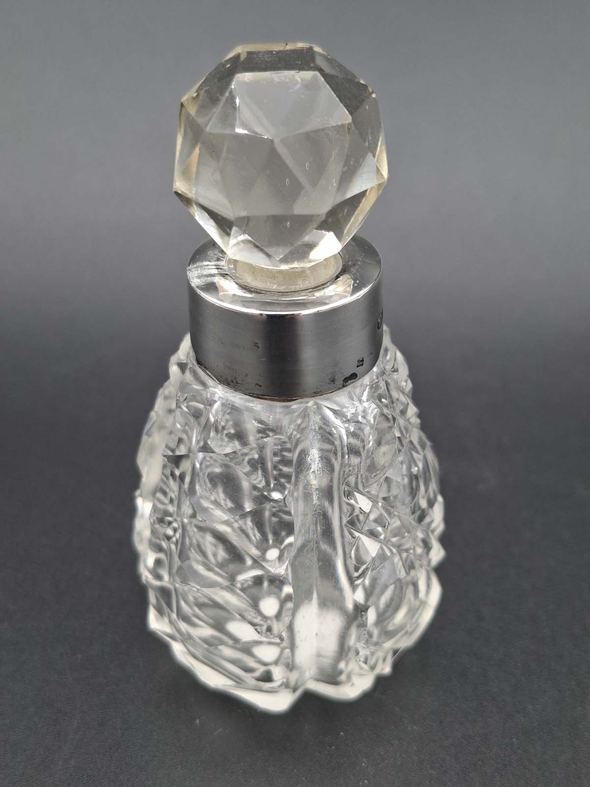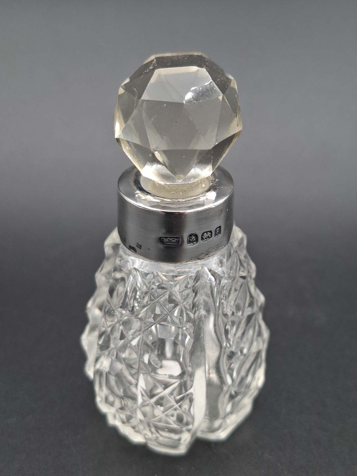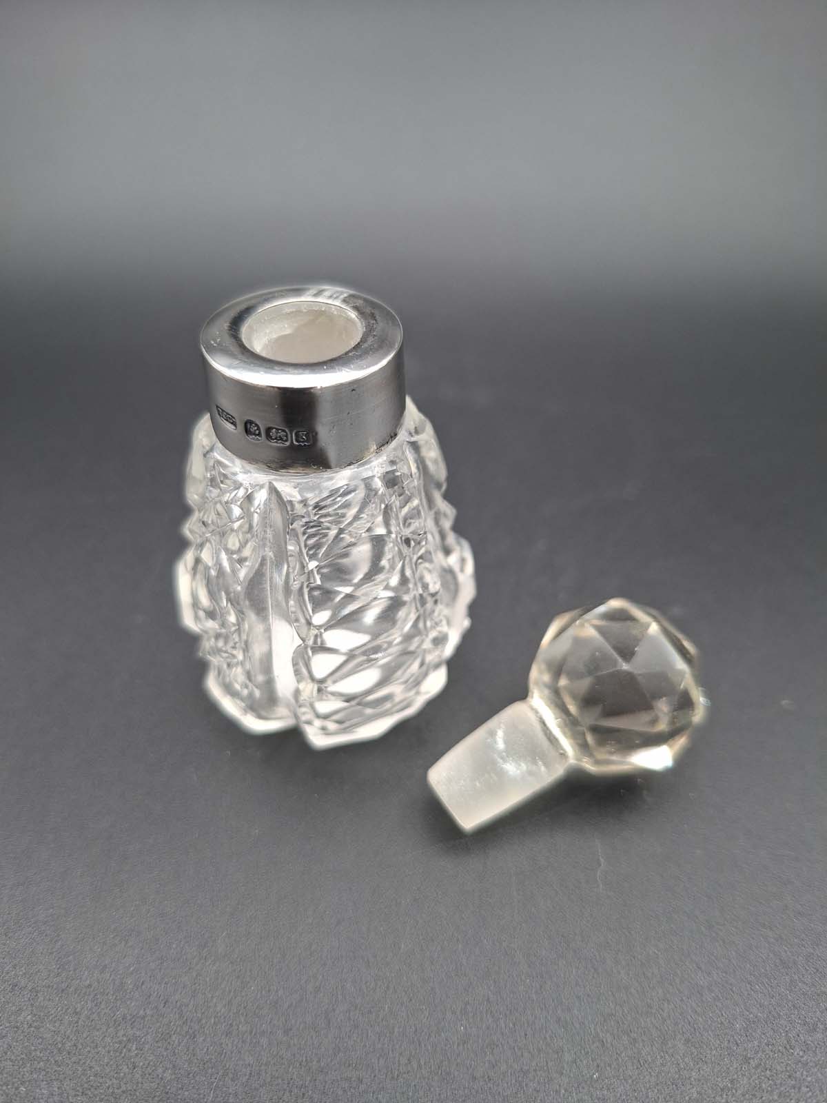 A lovely small cut glass perfume bottle with a sterling silver collar. Hallmarked for Birmingham 1906 By Broardway & Co.