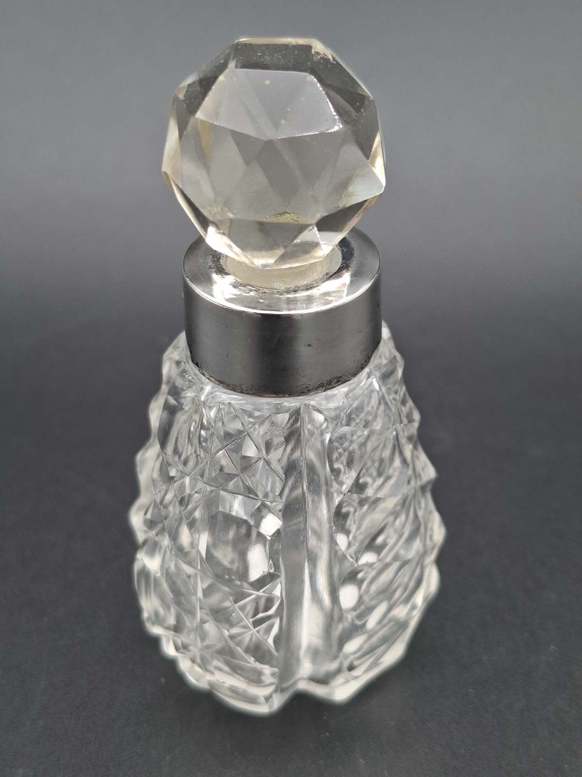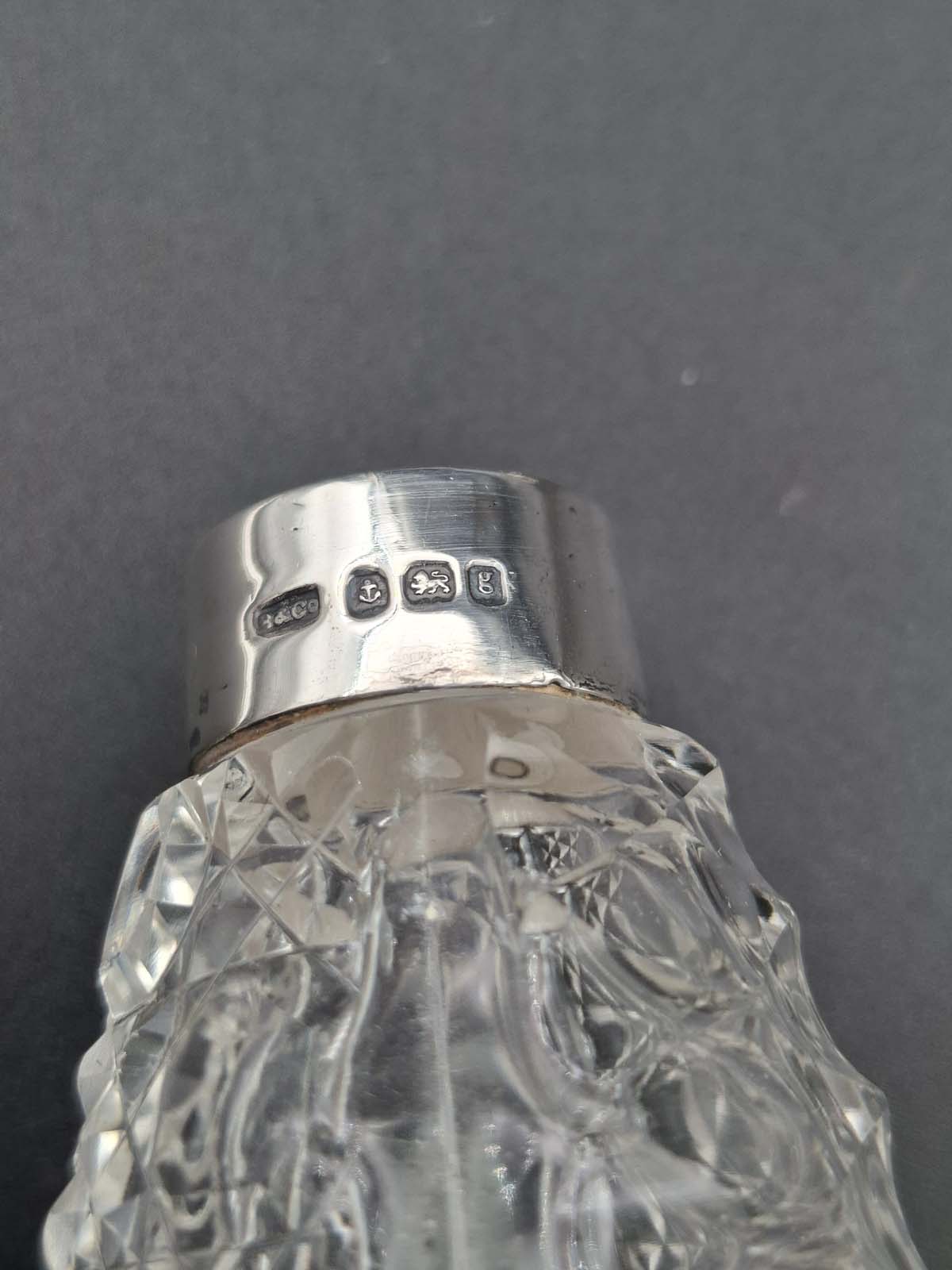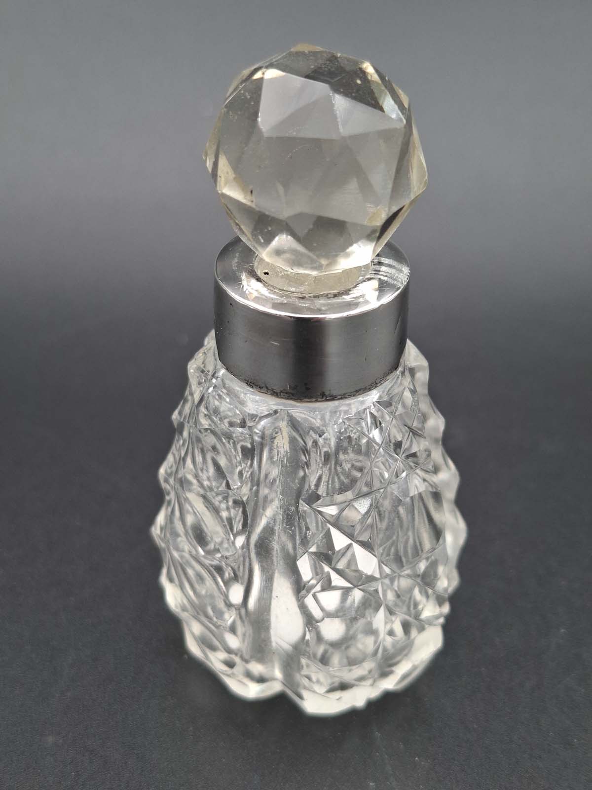 A lovely small cut glass perfume bottle with a sterling silver collar. Hallmarked for Birmingham 1906 By Broardway & Co.