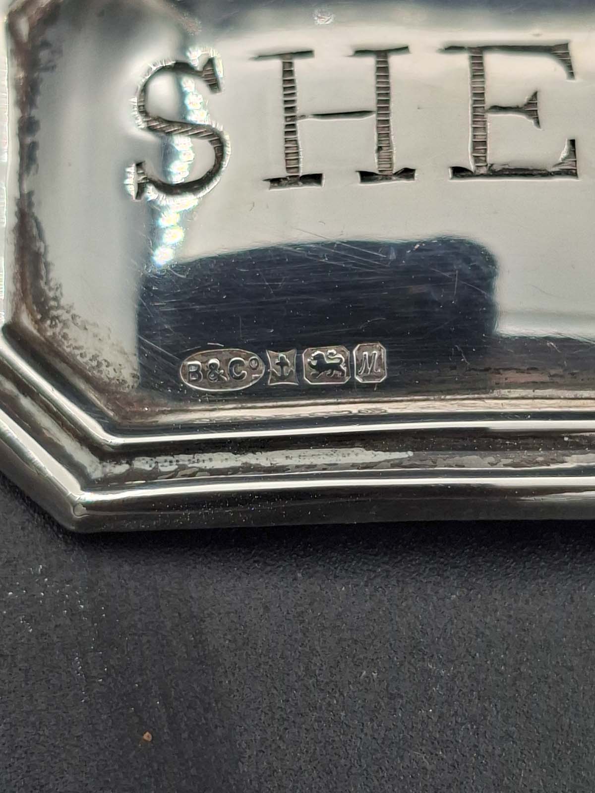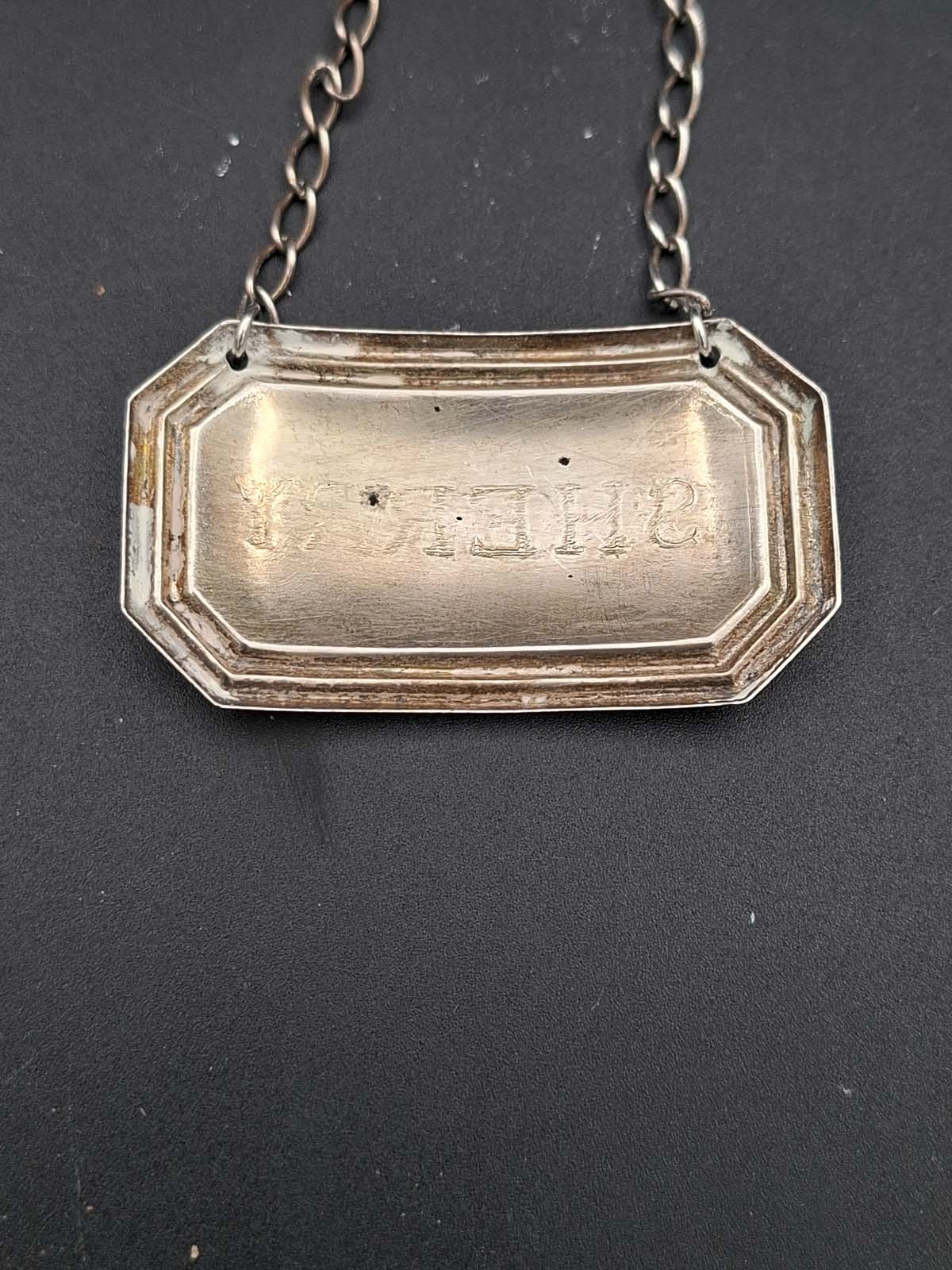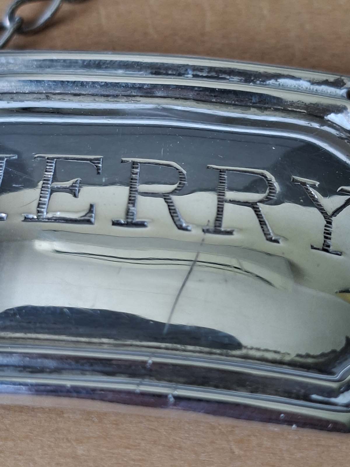 A sterling silver “Sherry” decanter label, Birmingham, 1961 By W.I. Broadway & Co. Weight: 8.08g
